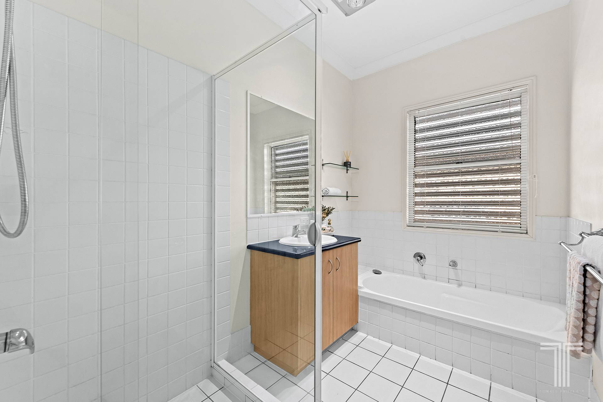 - Heat lamps and exhaust fans in both bathrooms