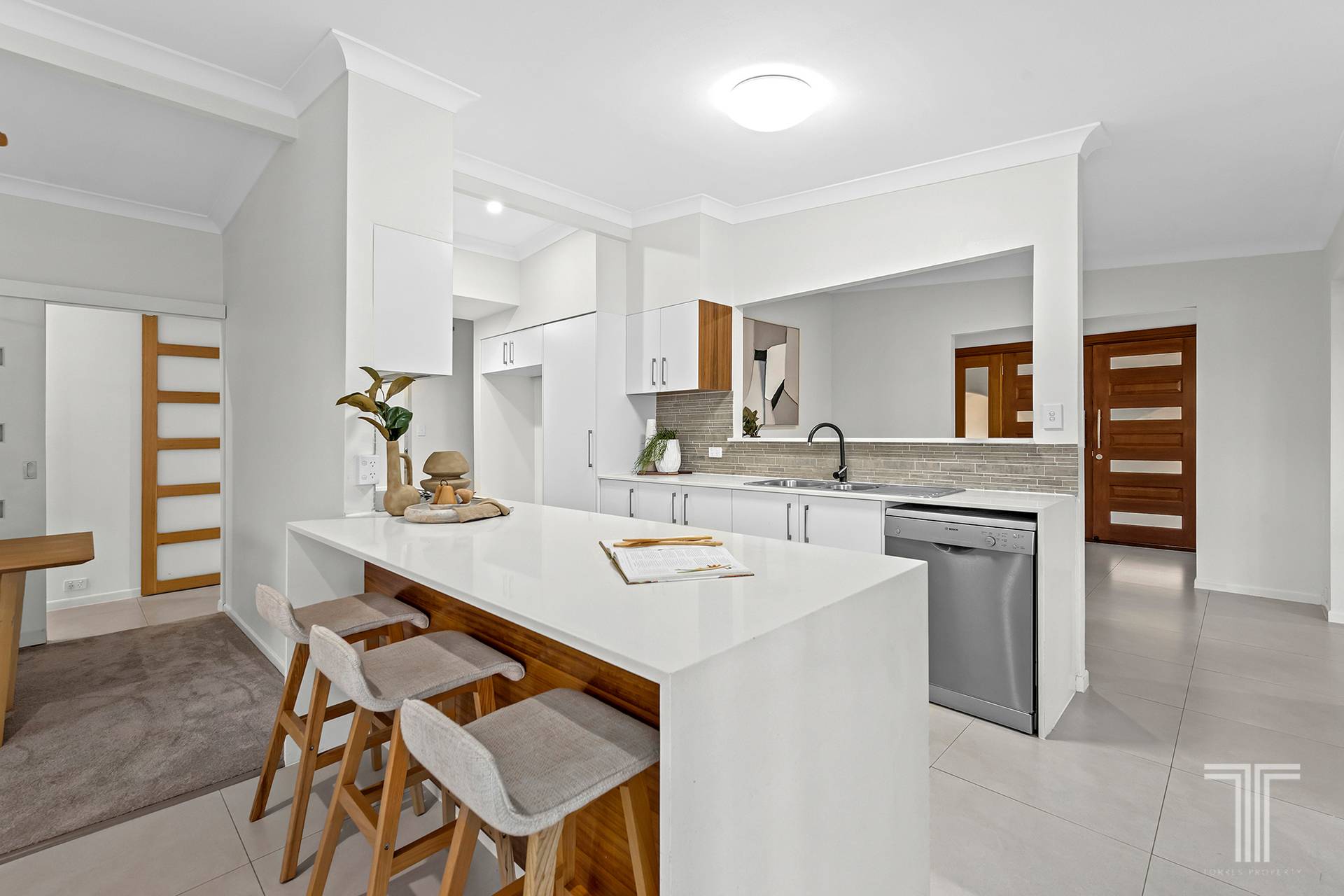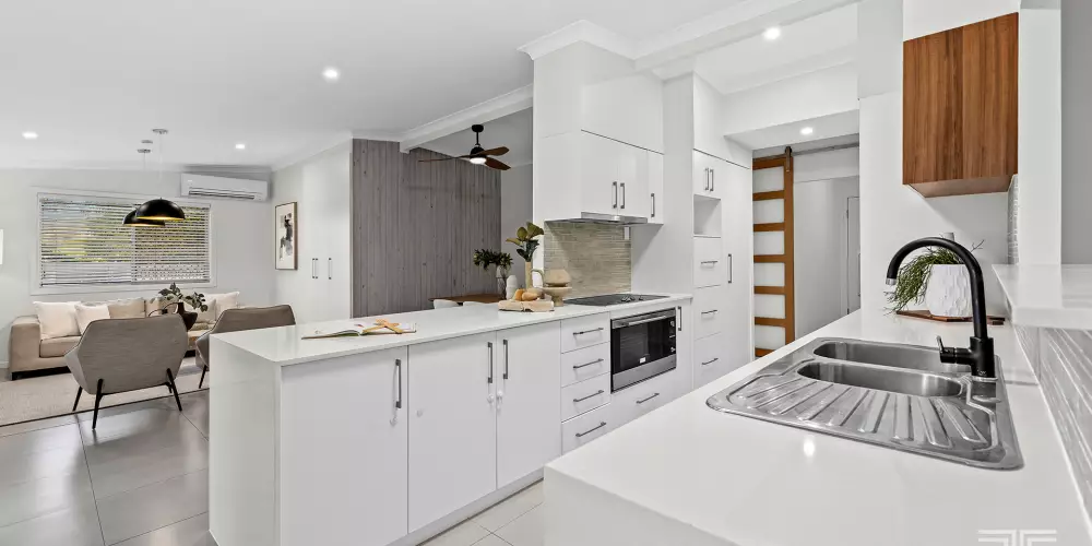 An open living/dining area and entertainment retreat provide leisurely spaces inside where parents, children and guests can unwind and reconnect. Flowing into the stylish central kitchen, you can enjoy meals prepared on the stainless steel appliances and crisp white palette of extensive storage and waterfall benchtops.