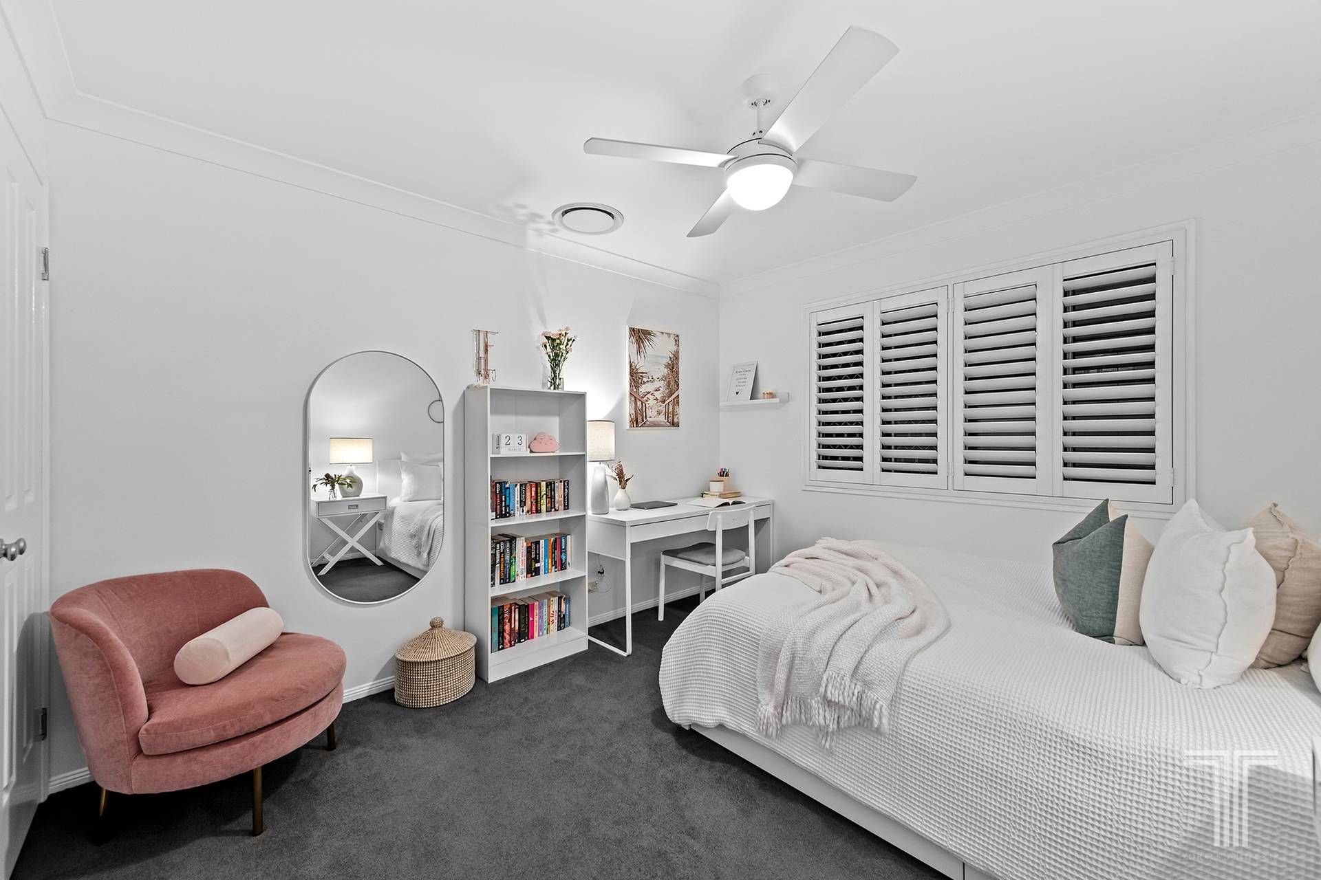 - Plantation shutters, LED lights, ceiling fans