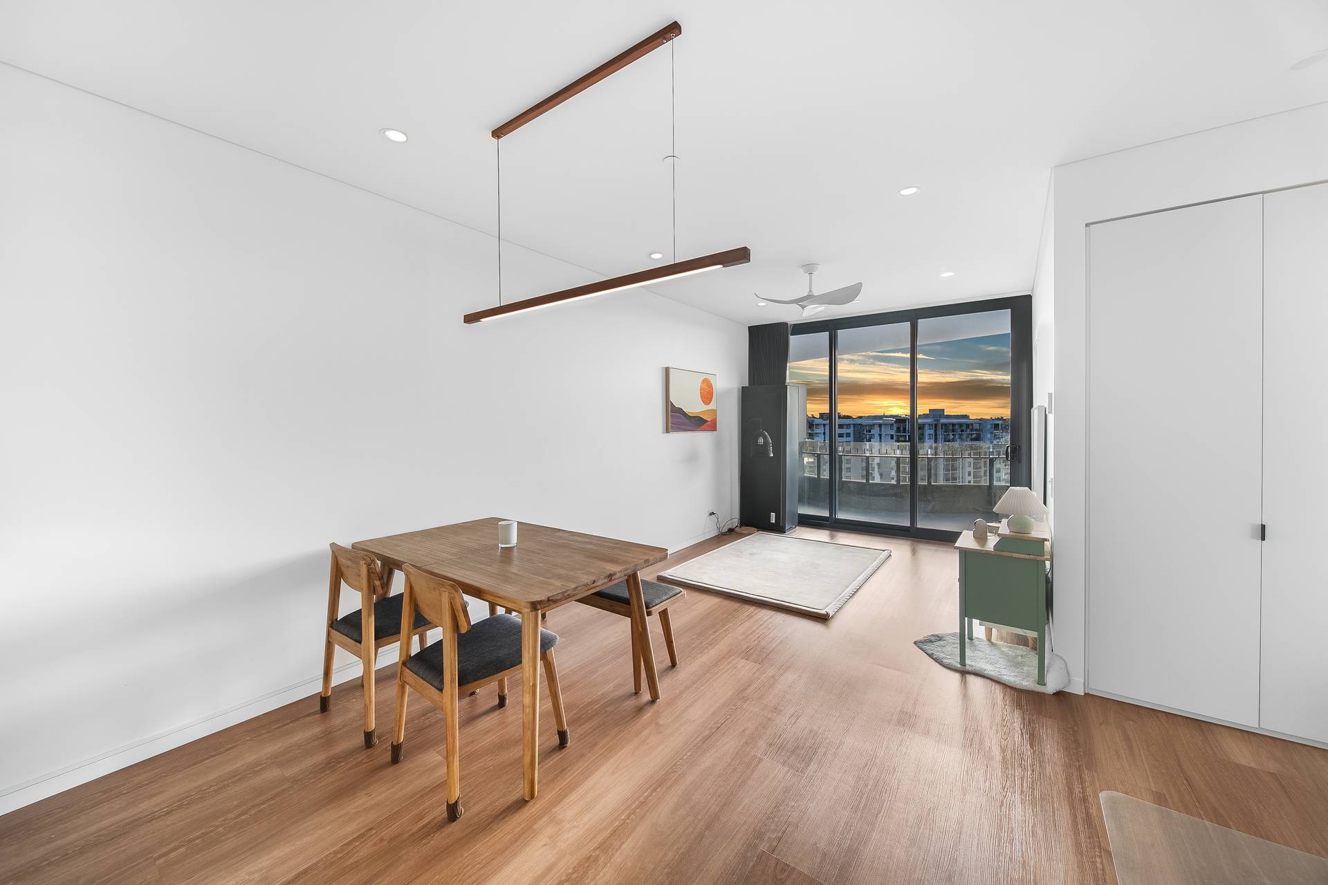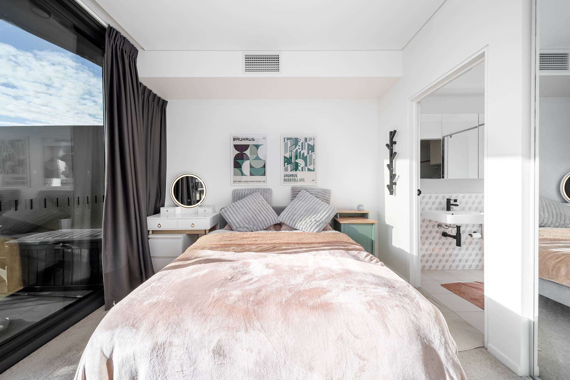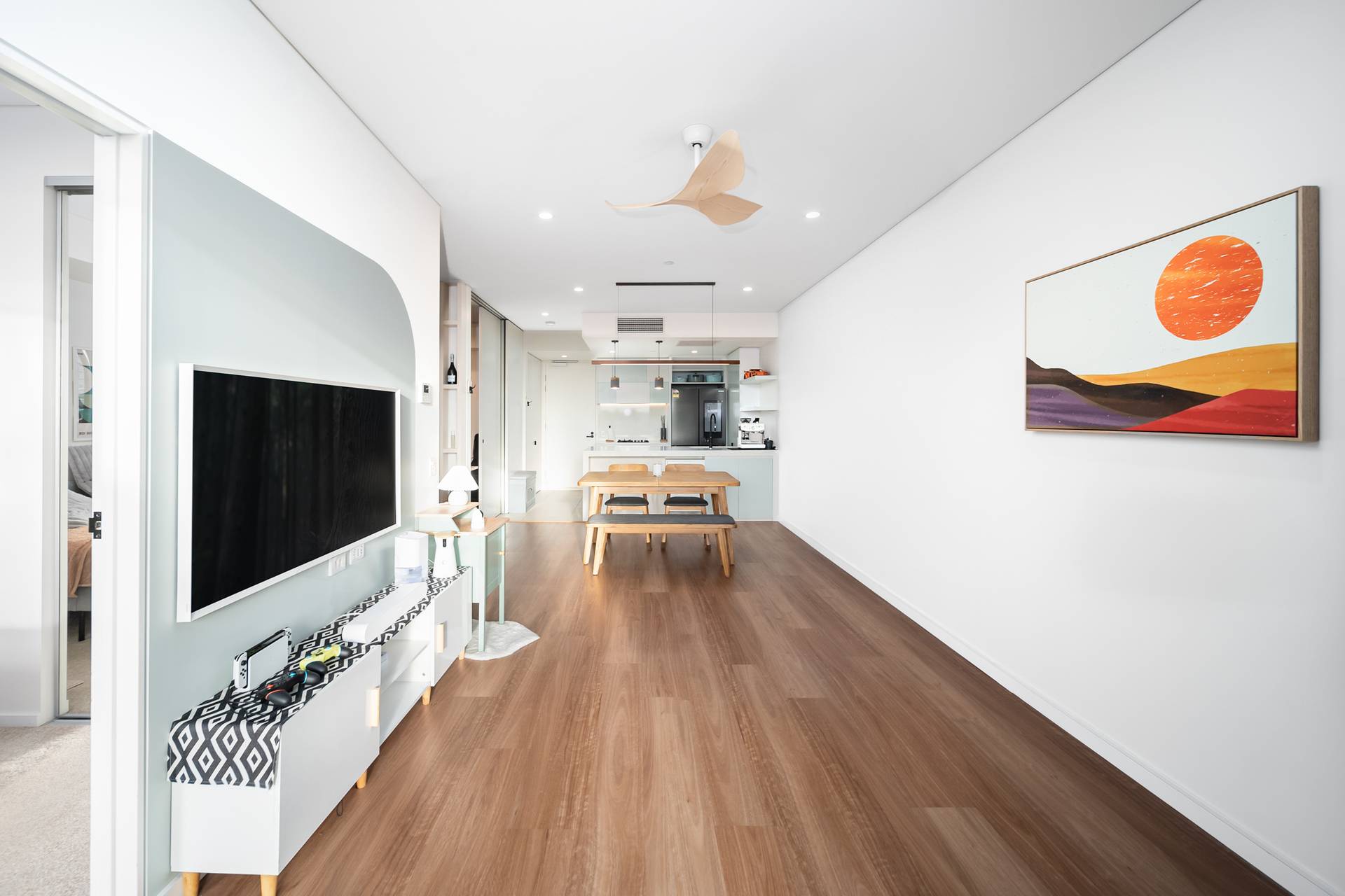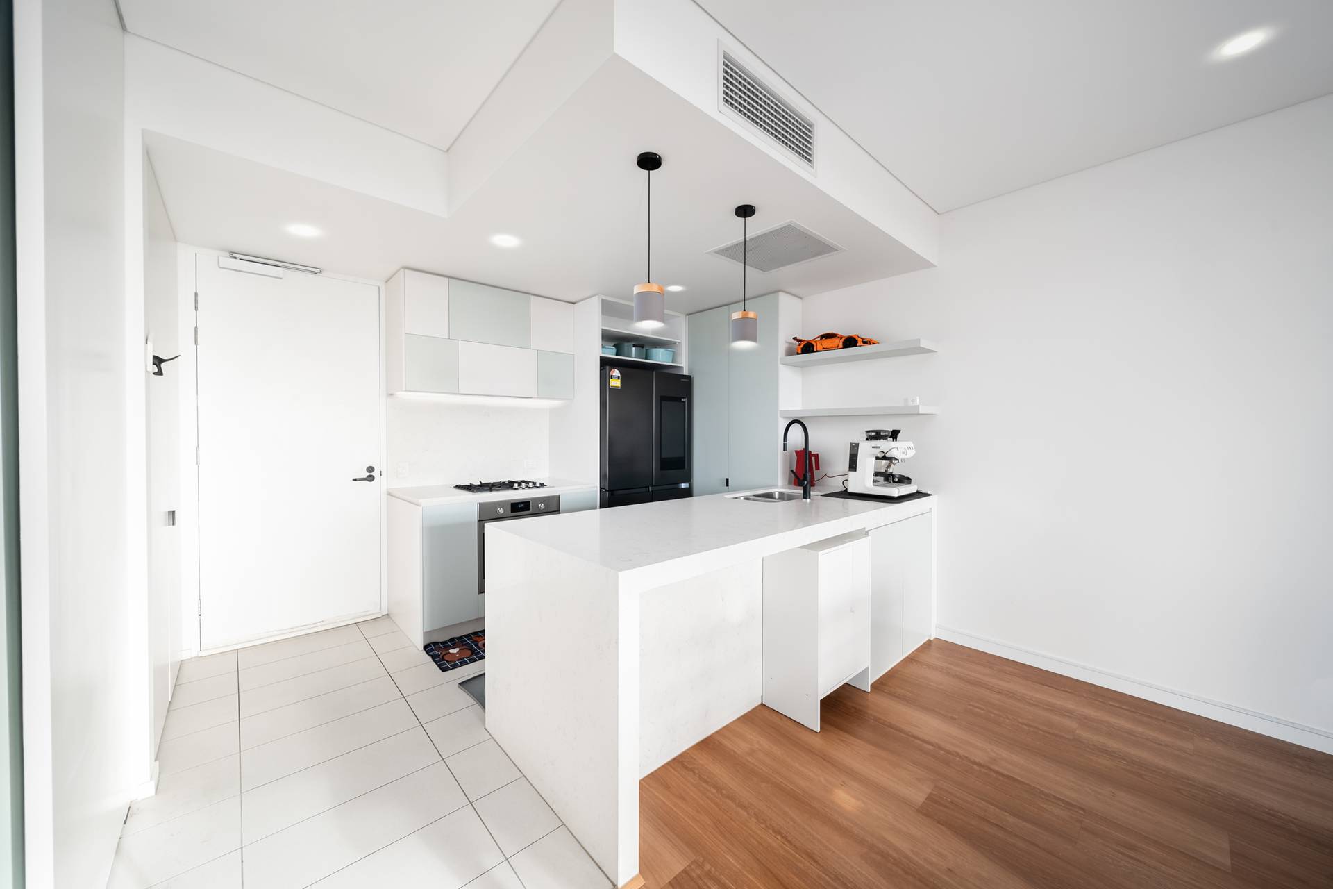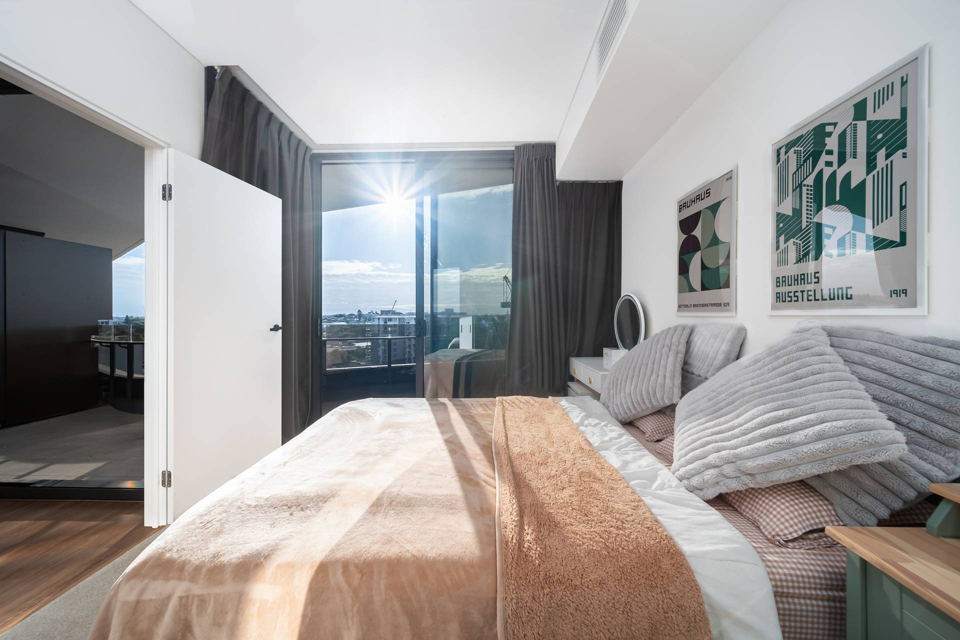 The streamlined interiors are accented by new flooring, feature lighting, 2.7-metre ceilings and walls of glass, creating an illuminated layout that transitions from the Caesarstone kitchen and living area to a balcony delighting in scenic sunsets and north-easterly views.