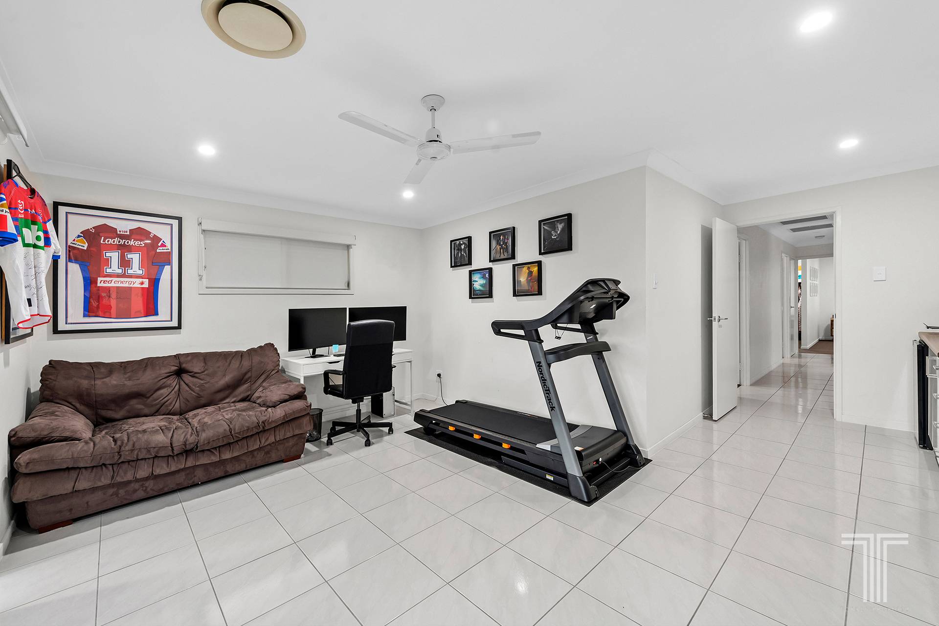 The floor plan features five bedrooms, two bathrooms, a powder room, and a laundry. Four bedrooms are upstairs, including the master suite with a walk-in robe and dual vanity ensuite. Featuring a spacious design with a wet bar/kitchenette and a balcony, the fourth bedroom can also serve as a rumpus to retreat or entertain indoors.