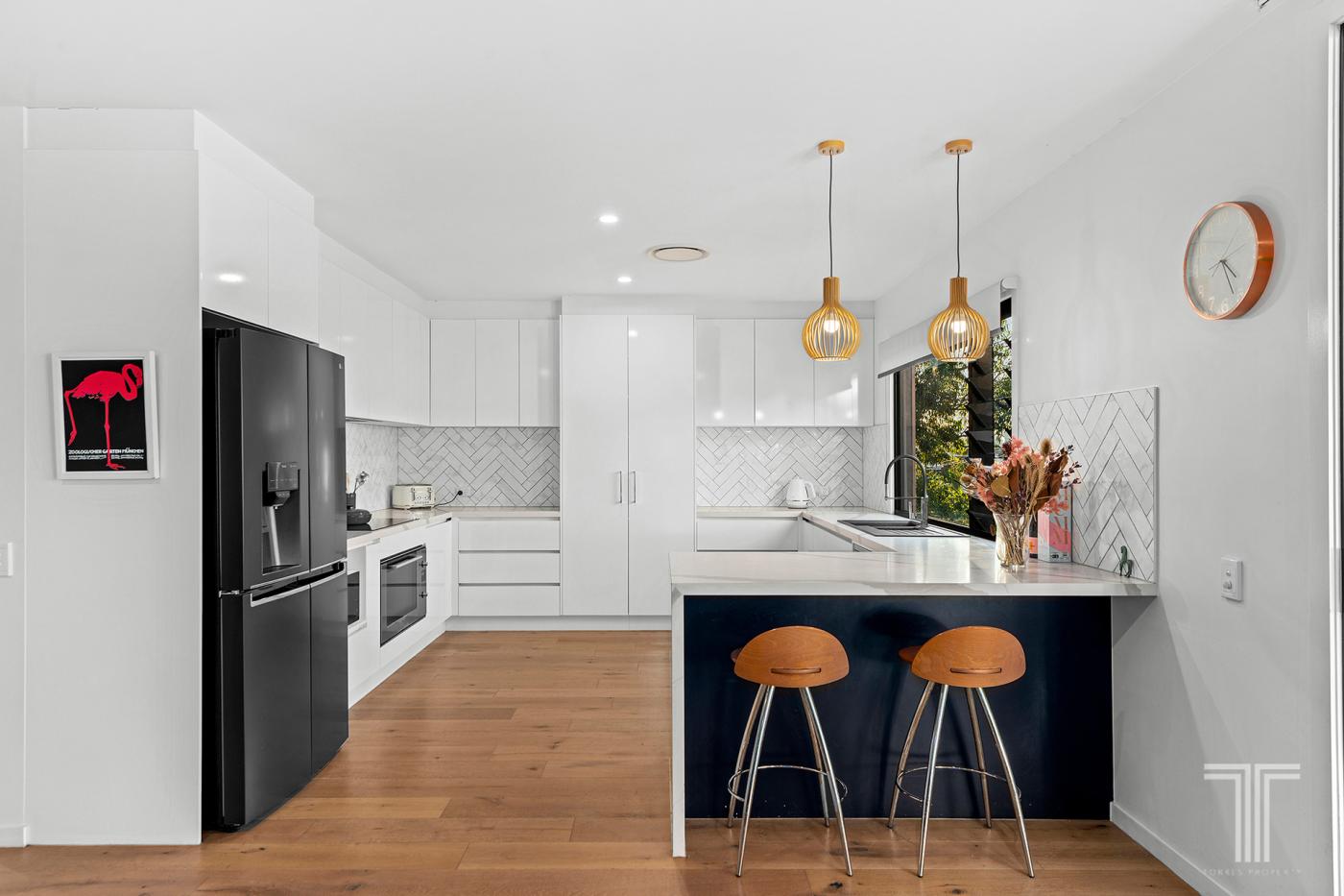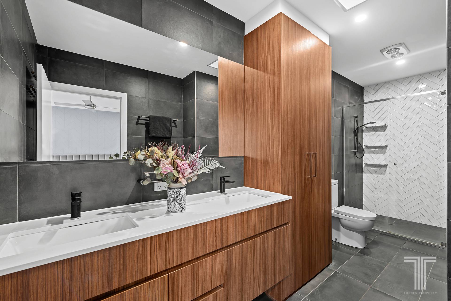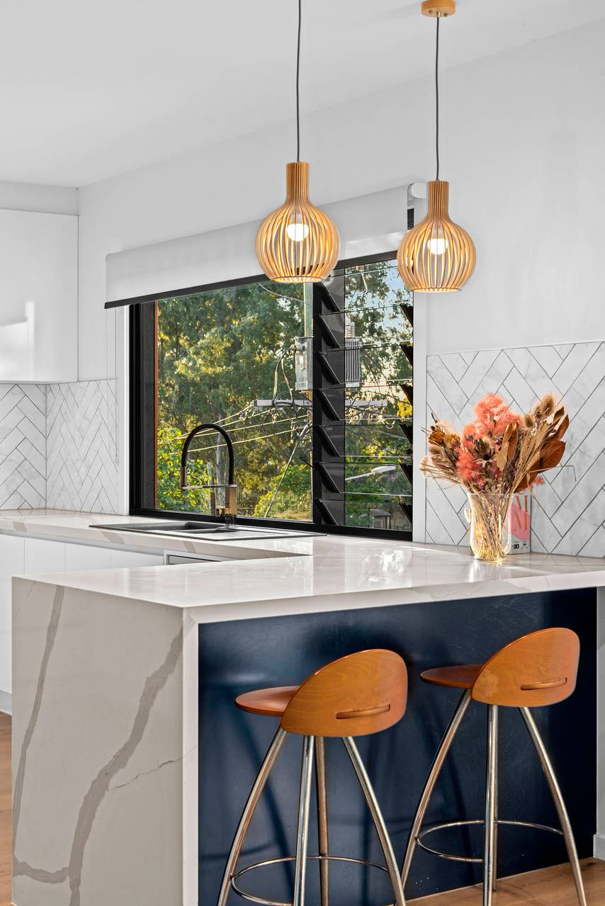 Abundant natural light fills the interiors, highlighting the European oak flooring, 40mm stone benchtops, floor-to-ceiling tiles, and feature herringbone walls – all thoughtfully curated to create an atmosphere of understated luxury and sophistication.