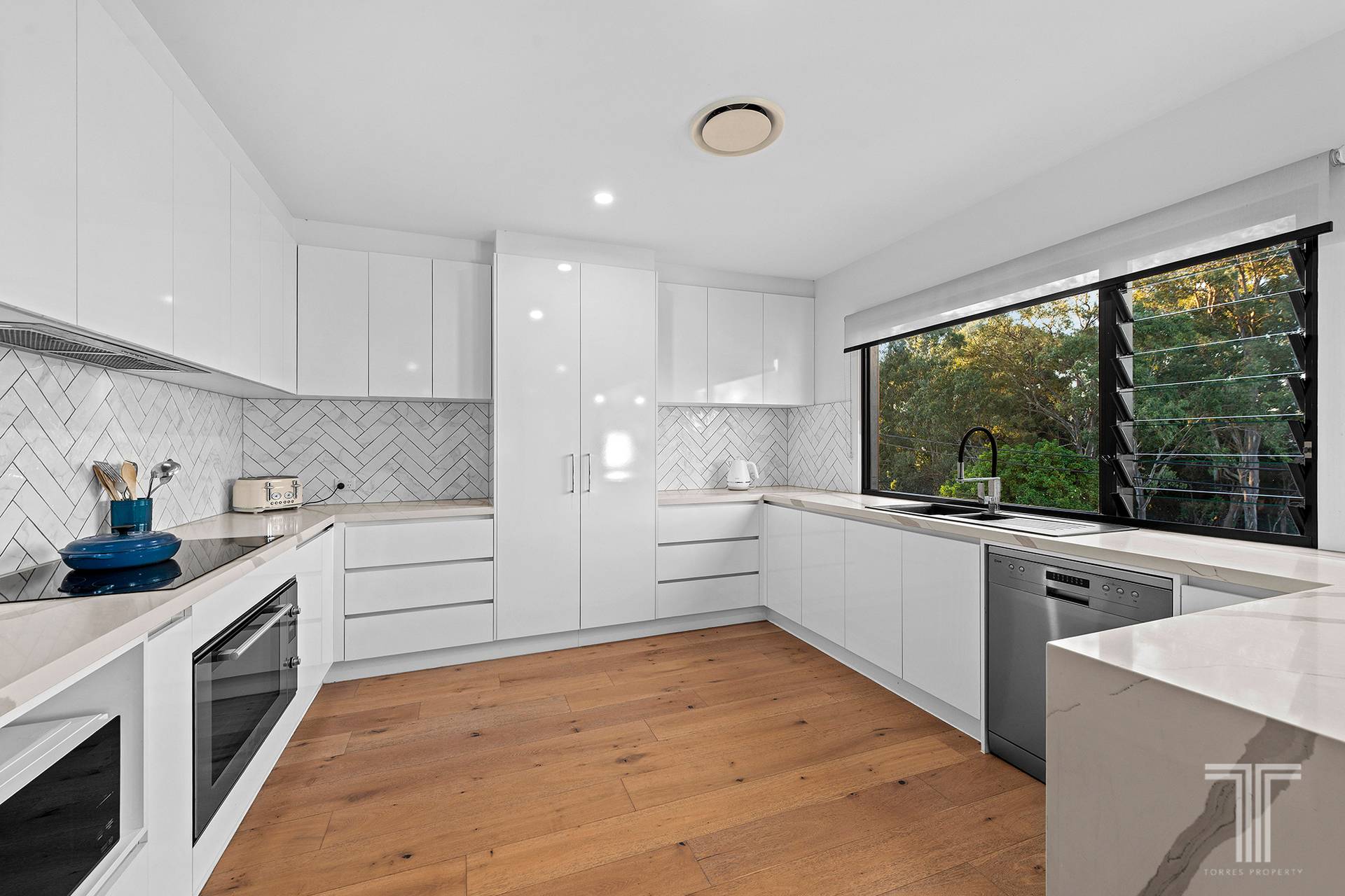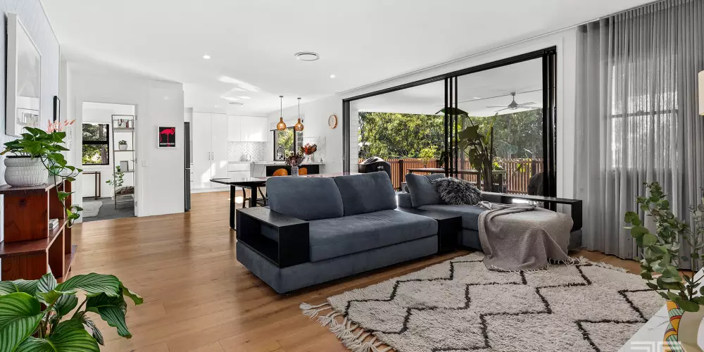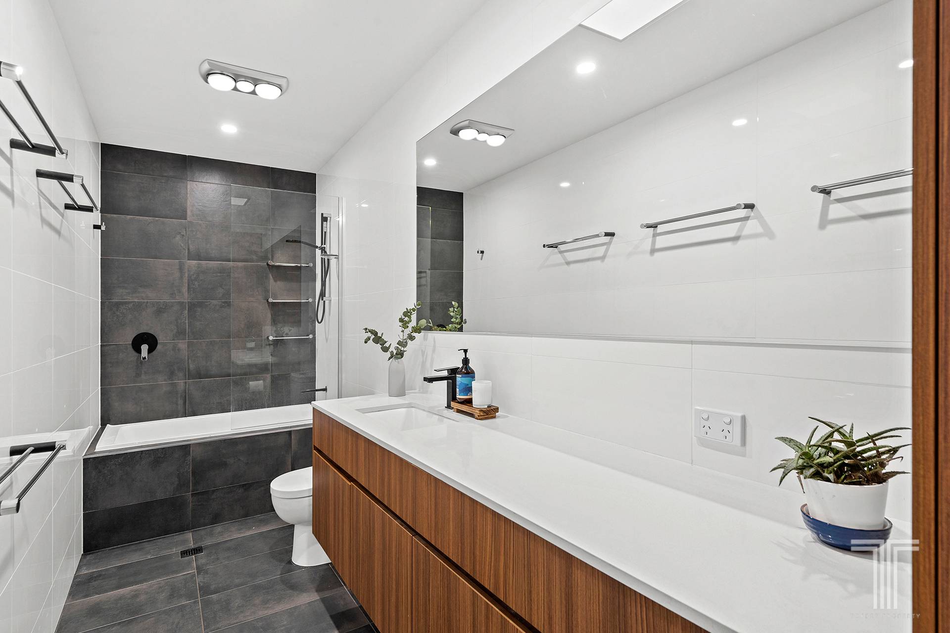 Abundant natural light fills the interiors, highlighting the European oak flooring, 40mm stone benchtops, floor-to-ceiling tiles, and feature herringbone walls – all thoughtfully curated to create an atmosphere of understated luxury and sophistication.