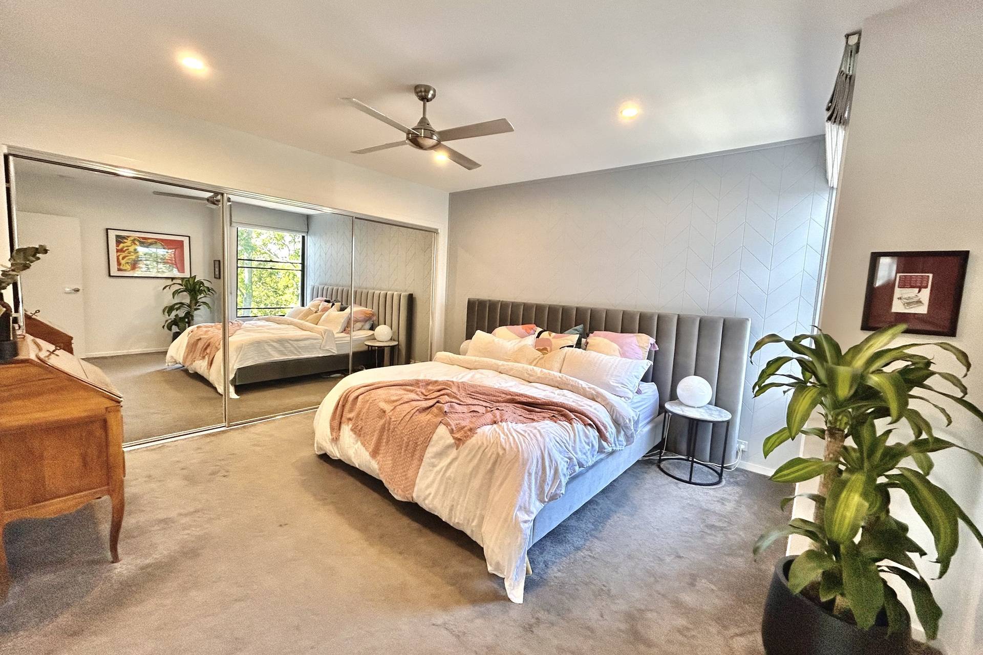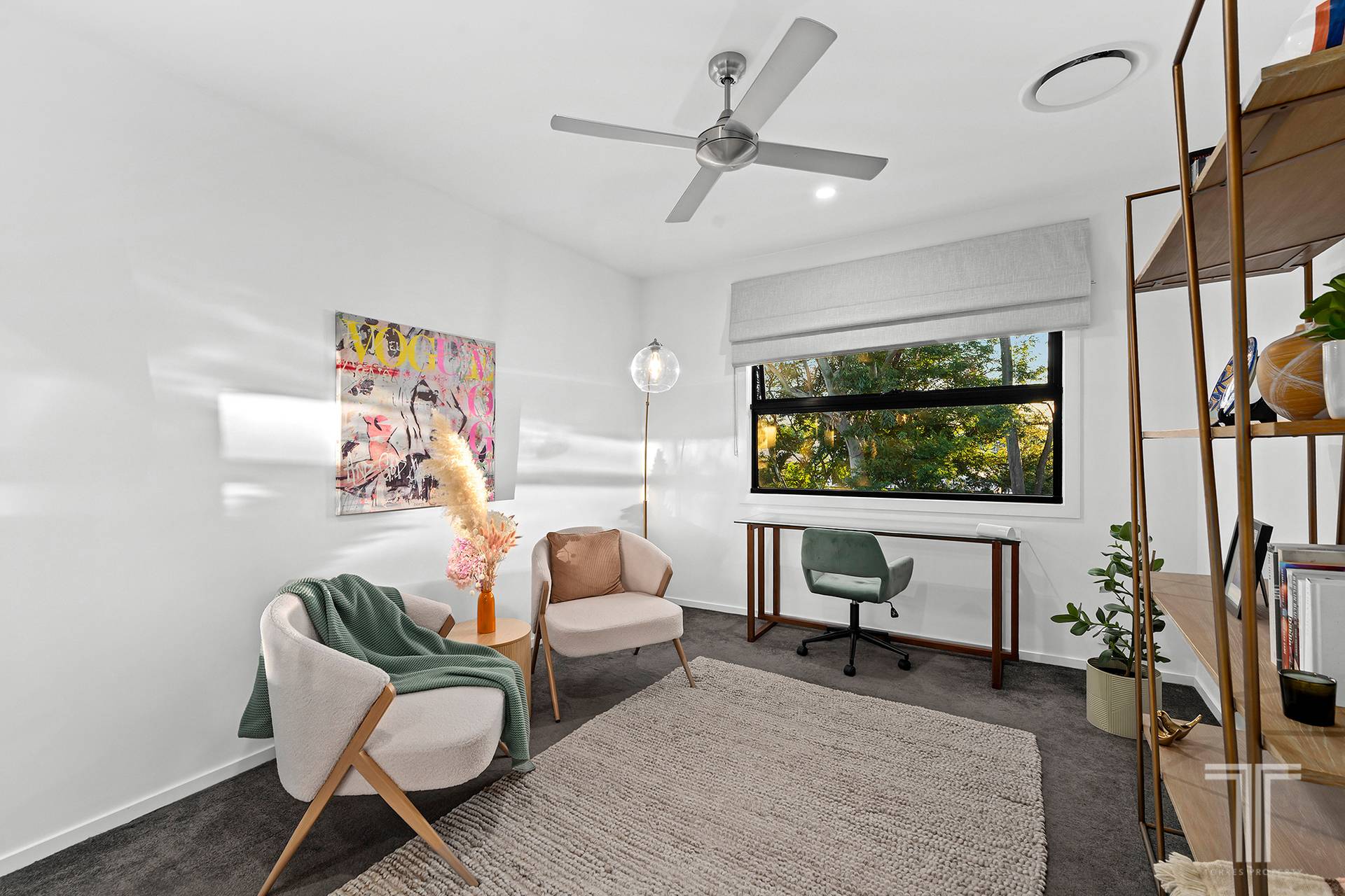 The open-plan living and dining areas flow into a generous kitchen equipped with waterfall benchtops, ILVE appliances, and extensive storage, all set against a leafy, light-filled backdrop. The stunning scenery continues outdoors, with the huge 40sqm balcony set against a backdrop of tree-lined outlooks and city views – ideal for entertaining and seamless indoor-outdoor living. Each of the three generous bedrooms include built-in robes and enjoys a leafy outlook through wide-set windows. The master bedroom features a large private ensuite with dual vanities and a skylight. A versatile fourth room can serve as a home office, media room, or second living room, catering to a variety of lifestyle needs. Completing the layout, an oversized laundry offers generous bench space and additional storage.