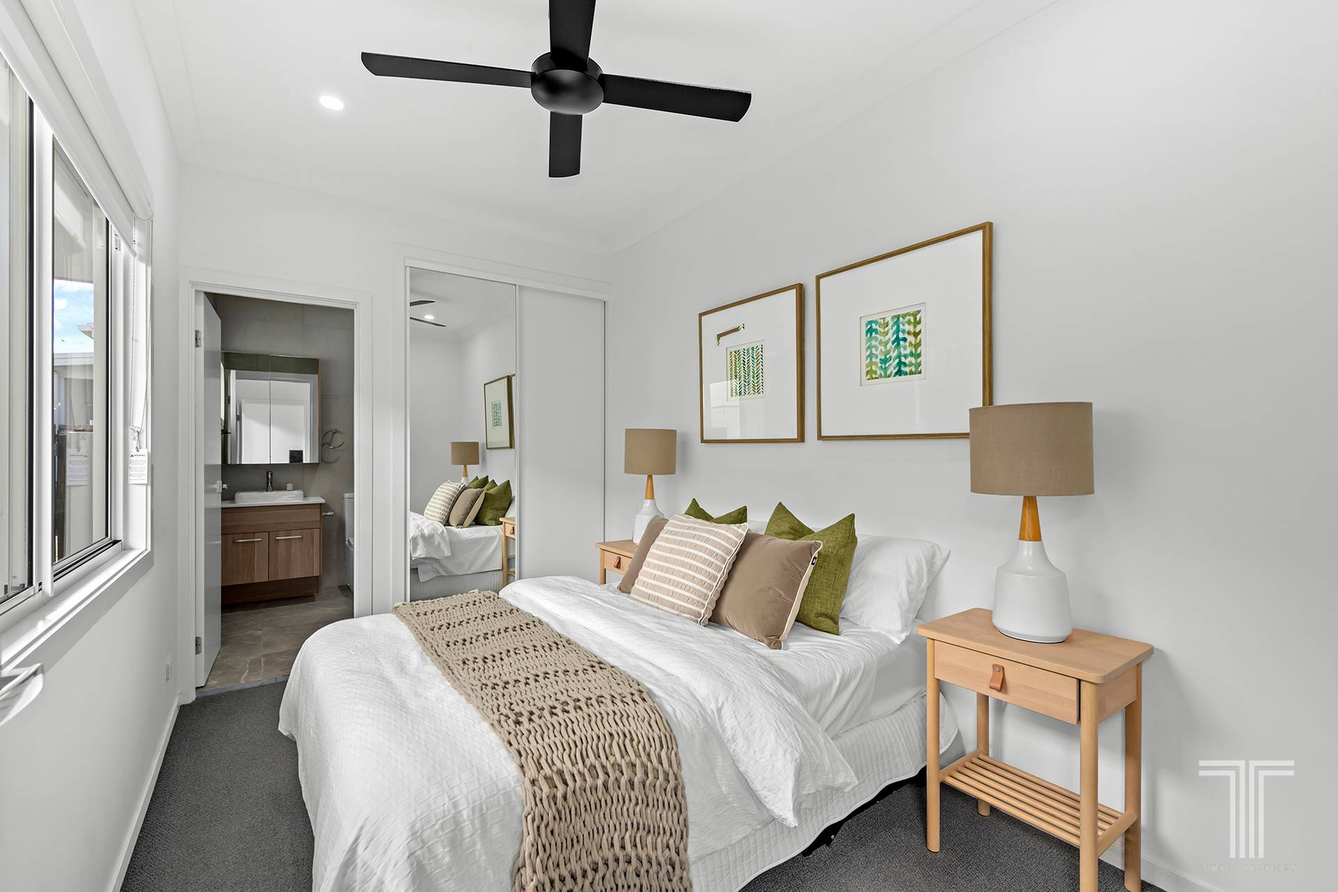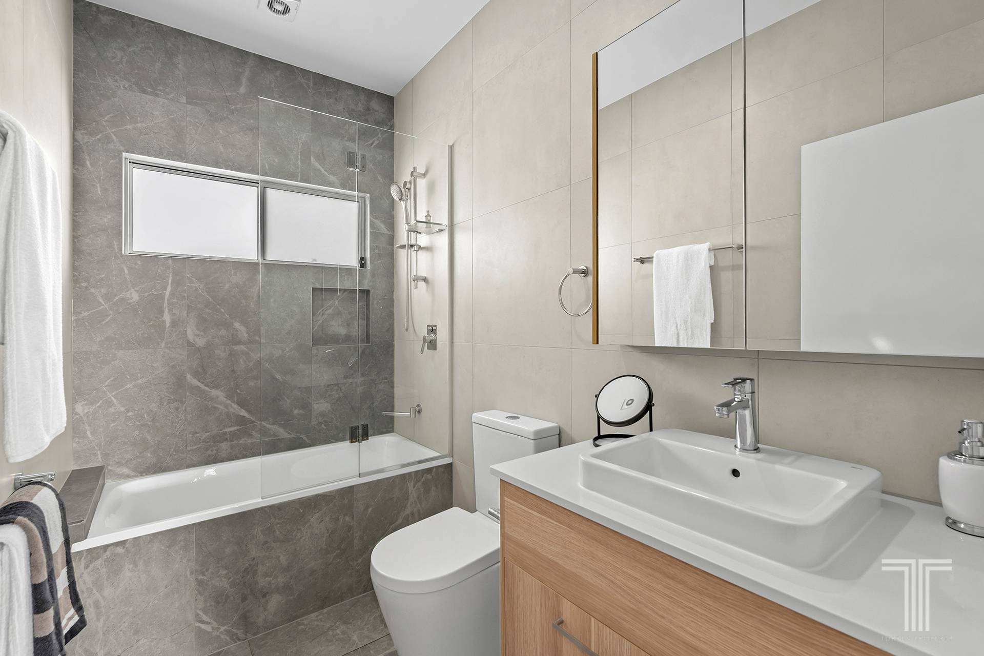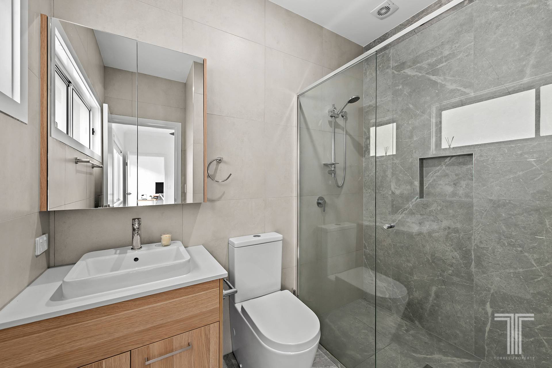 Inside, the home boasts three spacious bedrooms, each fitted with ceiling fans, ducted air conditioning, block-out blinds, and plush carpeting. The master bedroom upstairs features a private ensuite with floor-to-ceiling tiles, a monsoon showerhead, and a generous walk-in robe. The second bedroom downstairs is also ensuited, making it ideal for guests or multigenerational living, and features floor-to-ceiling tiles. The third bedroom includes a mirrored built-in wardrobe, as does the second bedroom.