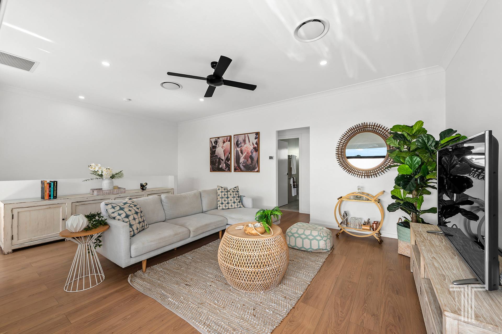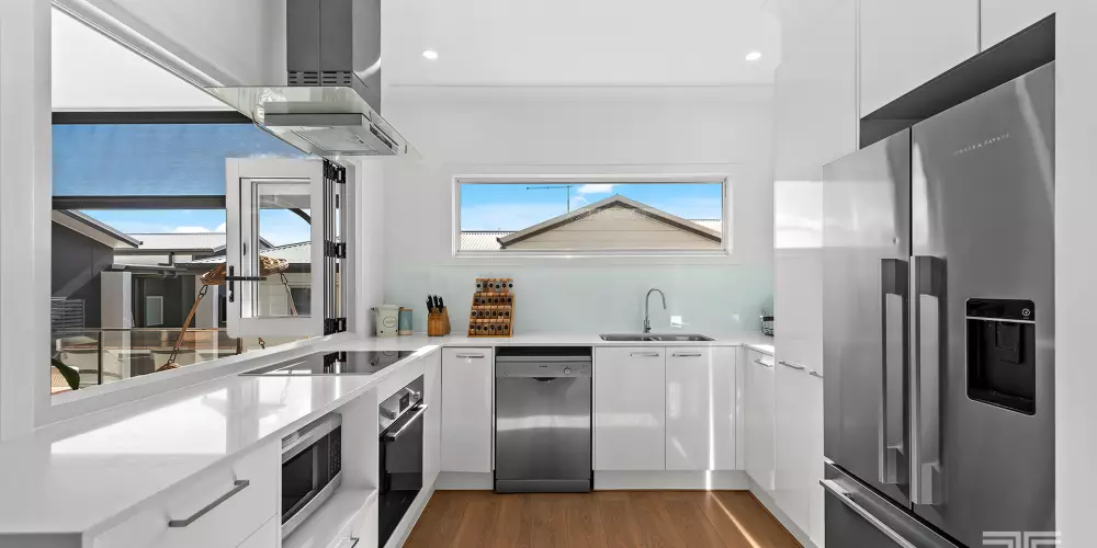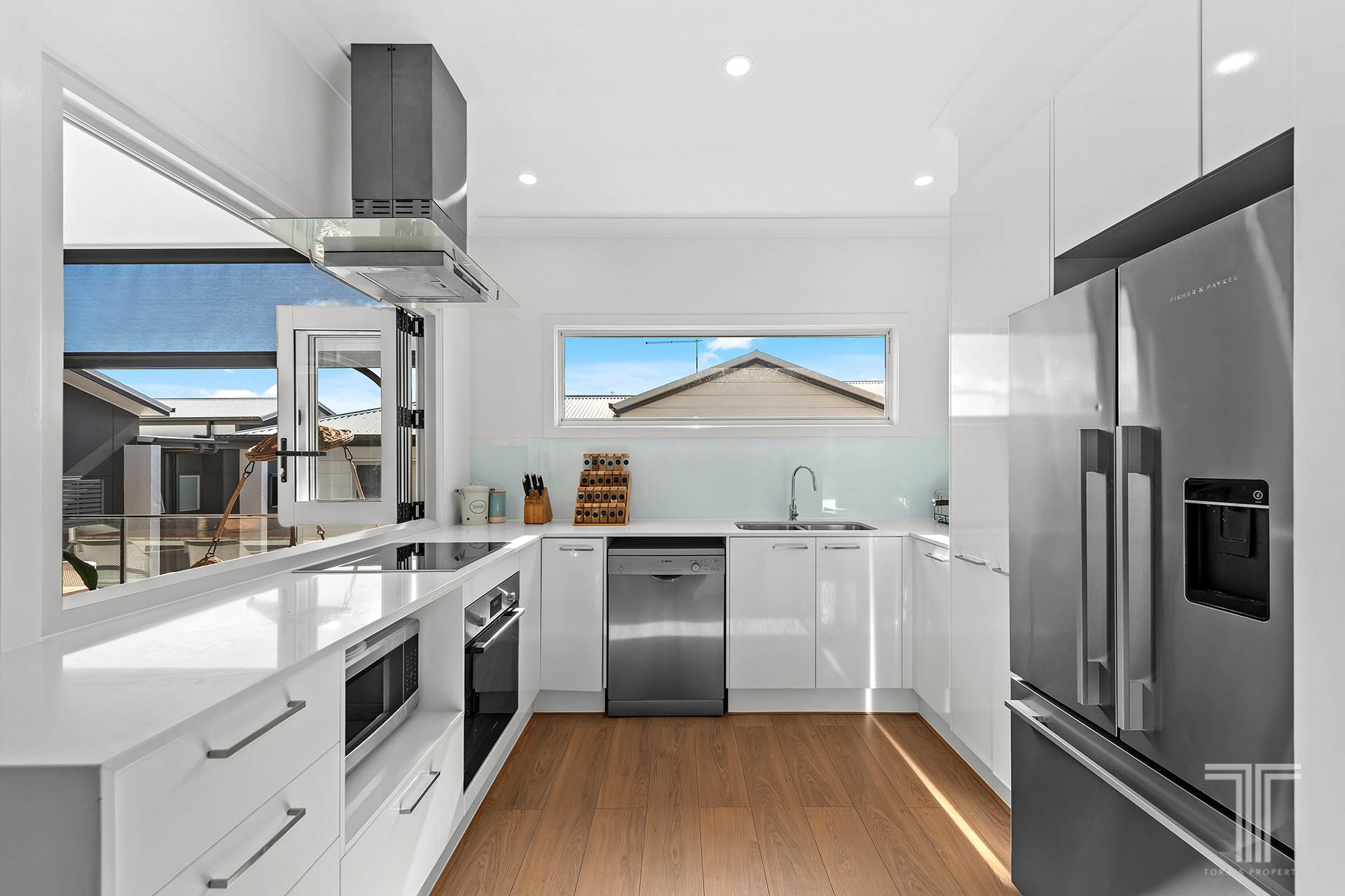 The home's open-plan living and dining area is light-filled and spacious, offering excellent flow to the outdoor spaces. The modern kitchen is a chef's delight, featuring stone benchtops, soft-close cabinetry, Bosch appliances (oven and dishwasher), range hood, servery window, and display lighting.