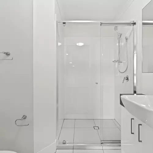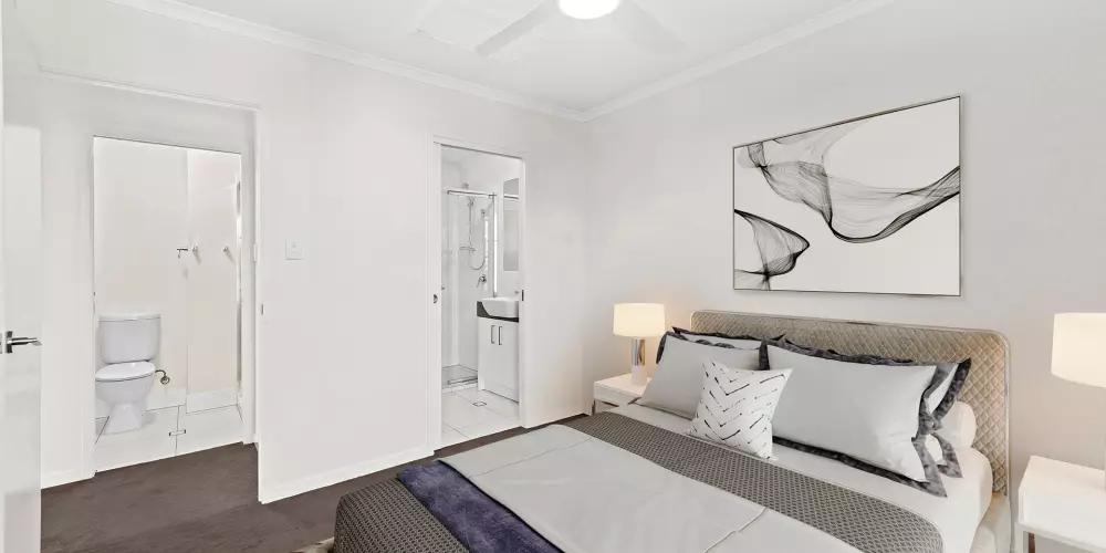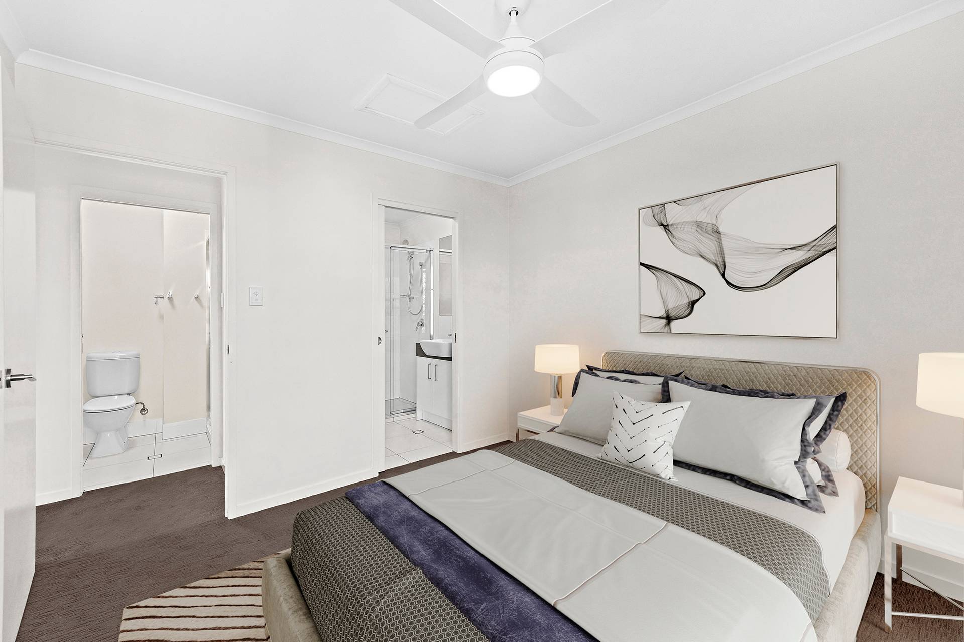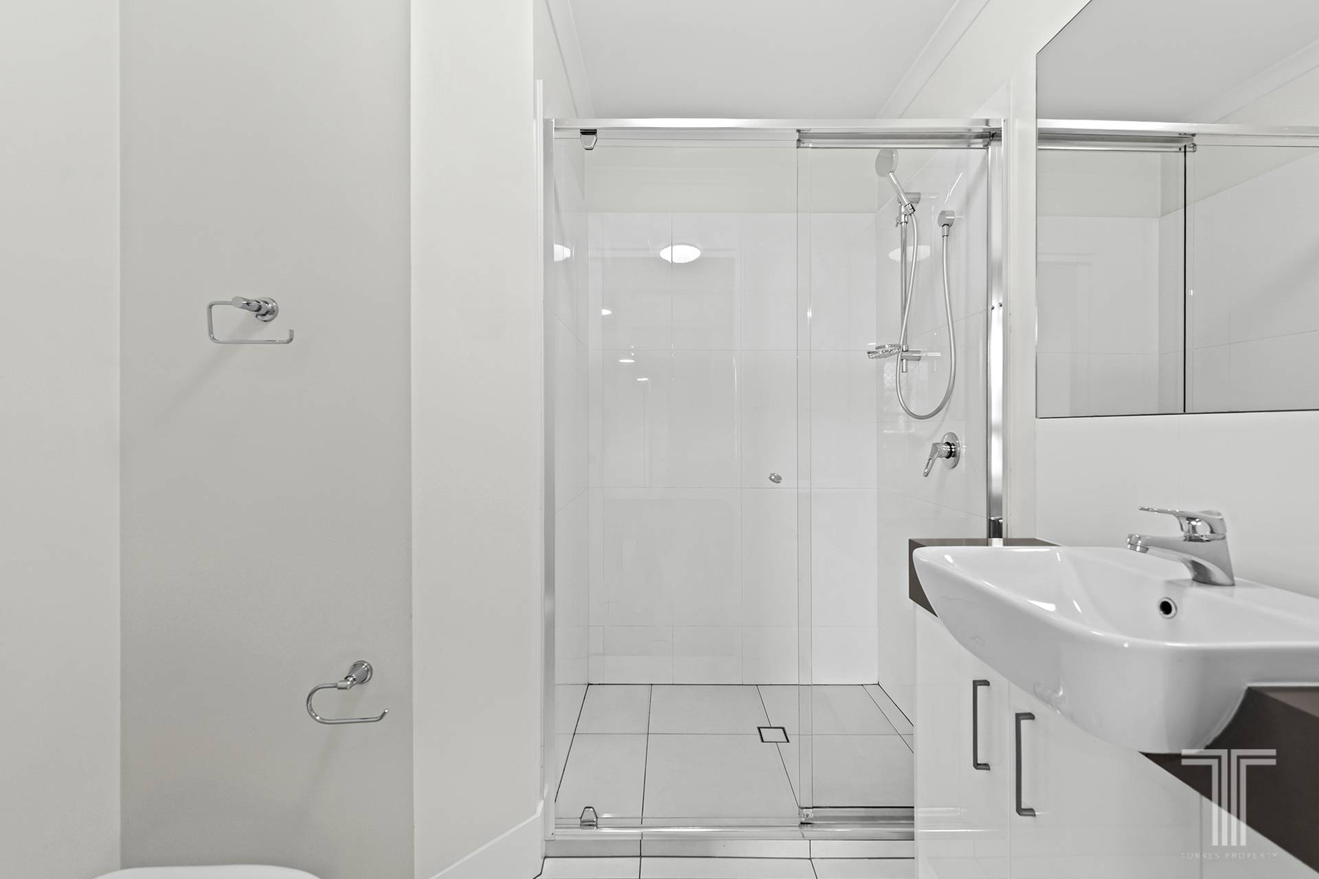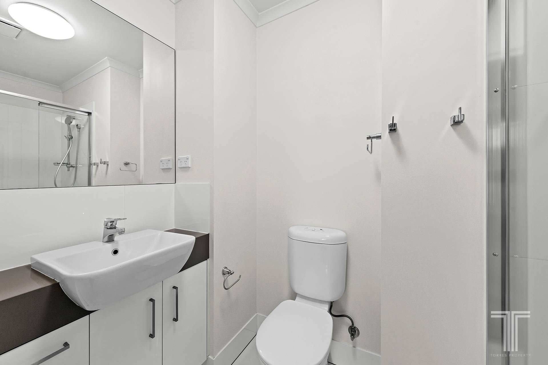 The apartment offers two generously sized bedrooms, each equipped with built-in wardrobes. The master bedroom enjoys the luxury of its own with a private ensuite bathroom. Throughout the apartment, ample natural light creates a warm and welcoming atmosphere. The living and dining area is air-conditioned for year-round comfort. The bathrooms are designed with large vanity units, providing ample bench space. An internal laundry adds to the convenience of the apartment.