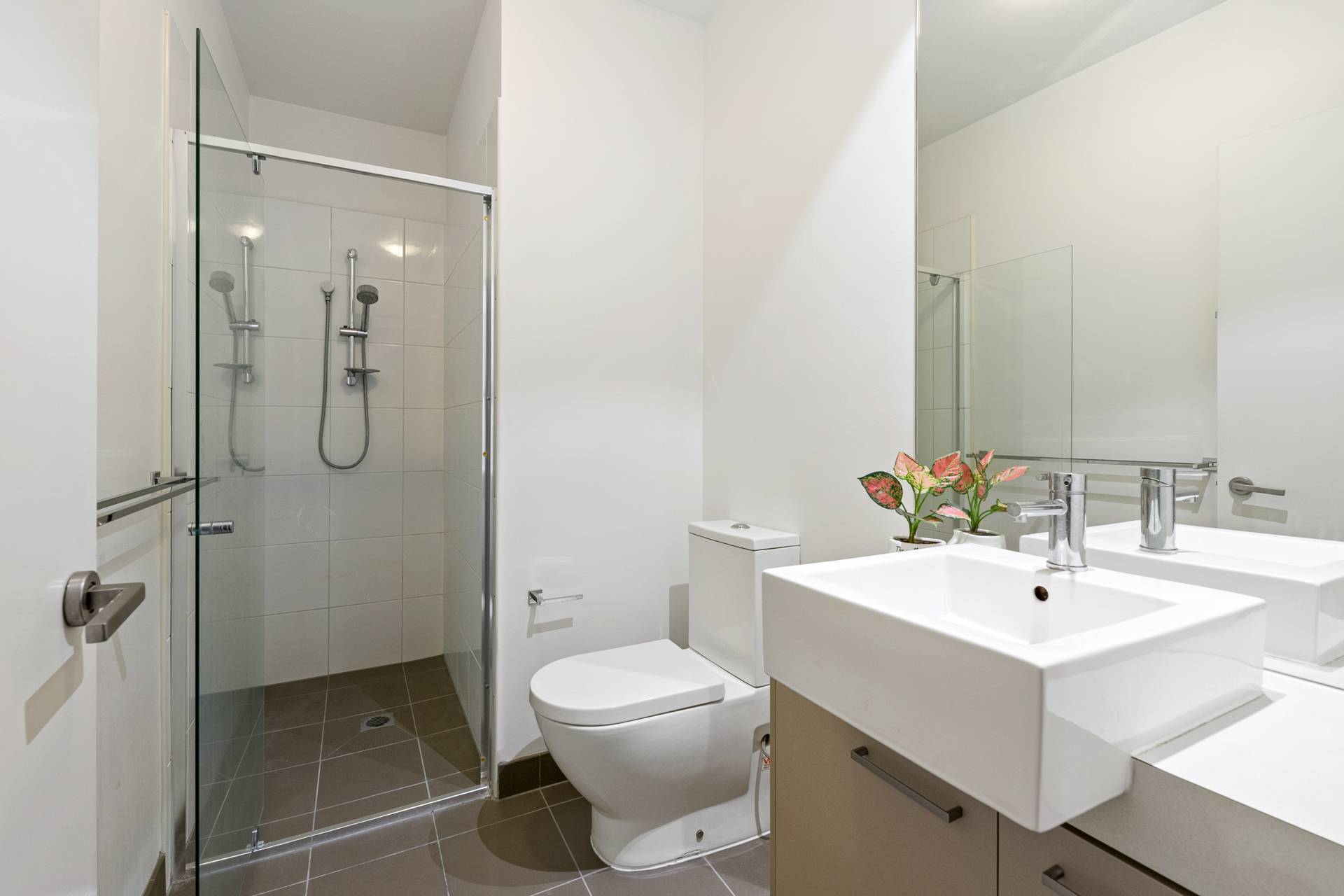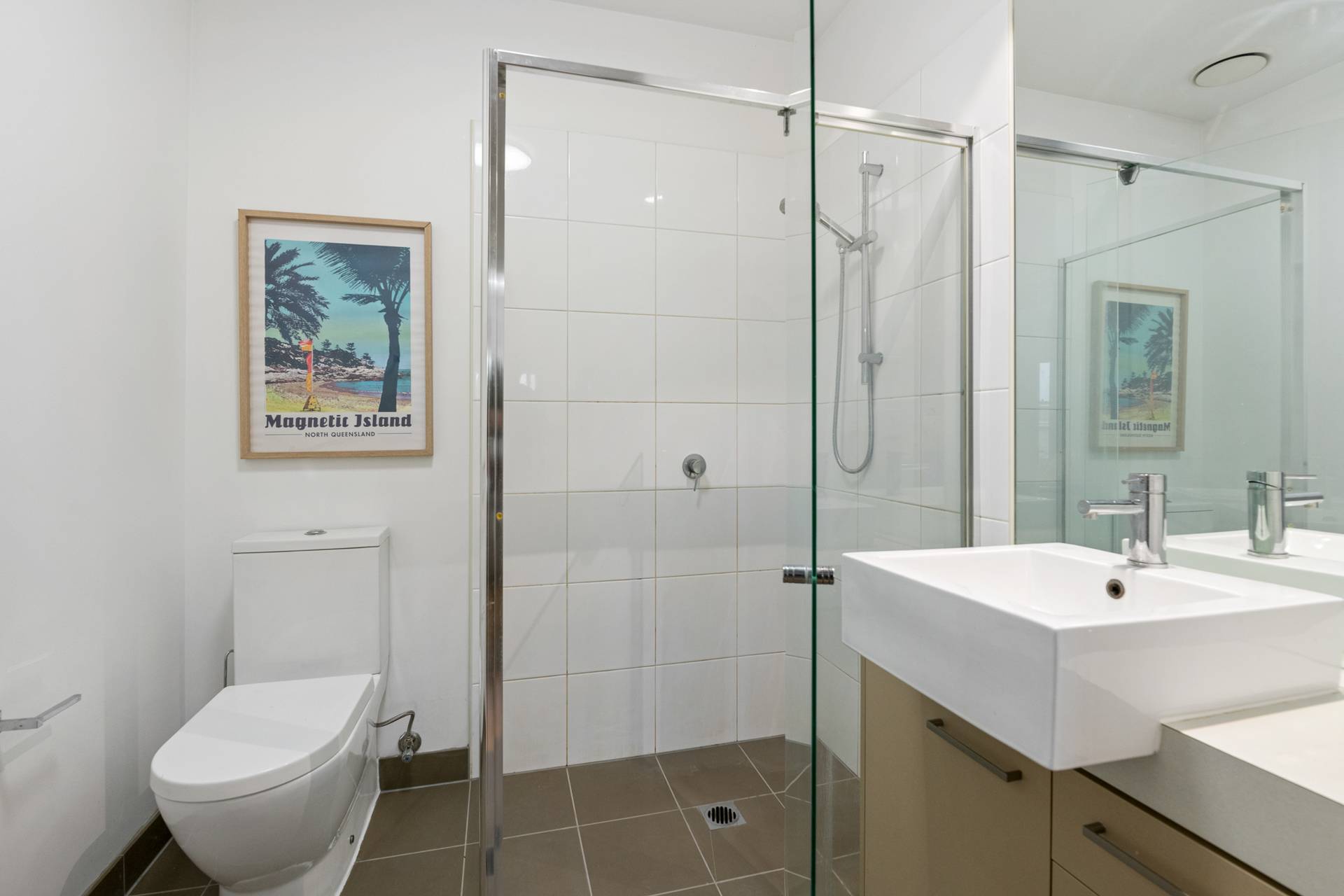 Both bedrooms feature ensuites, including the main bedroom with a walk-in robe and the second bedroom with a built-in robe and study nook. The internal laundry is concealed, and there is secure basement parking for one car, plus multiple visitor bays.