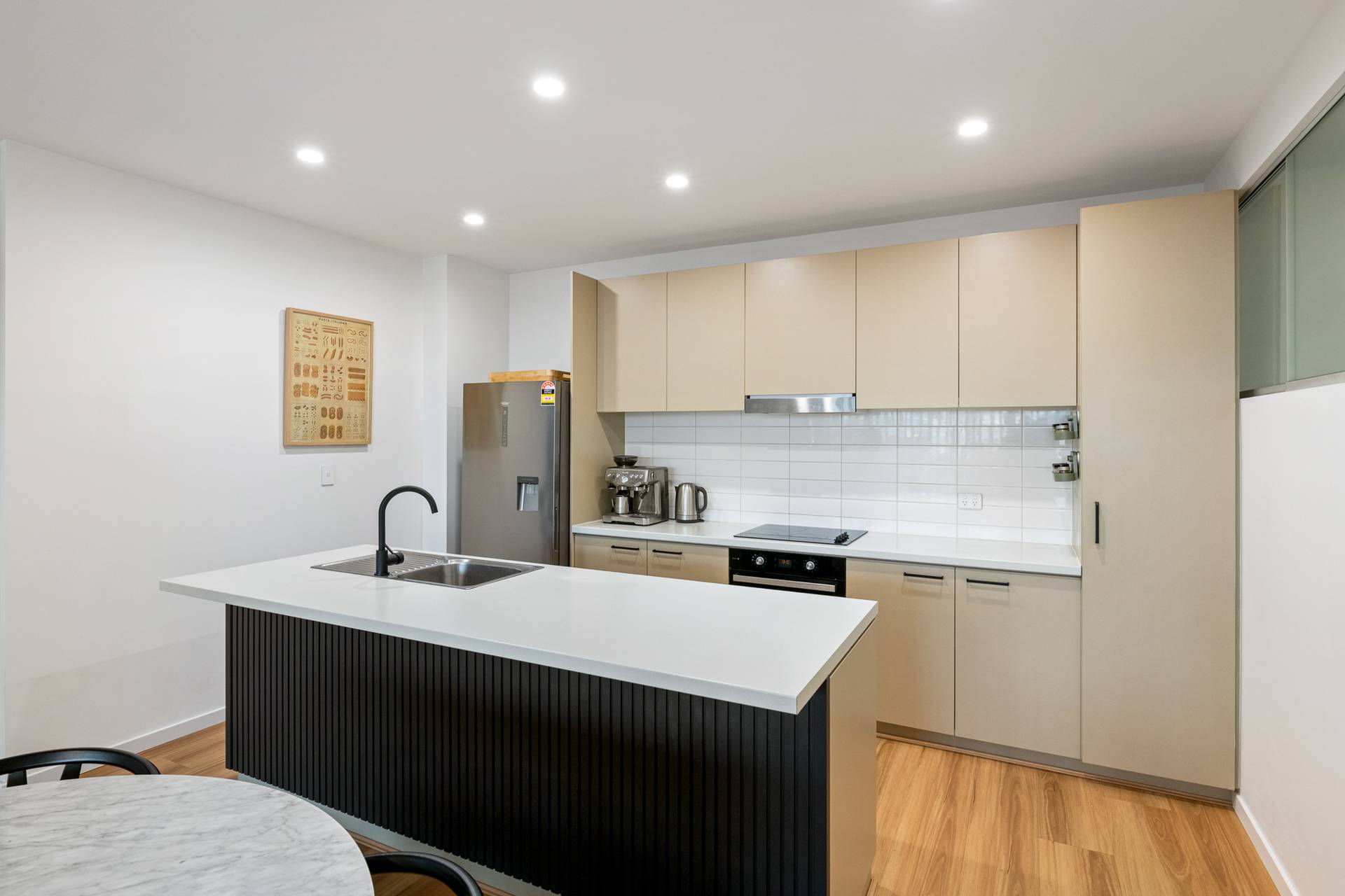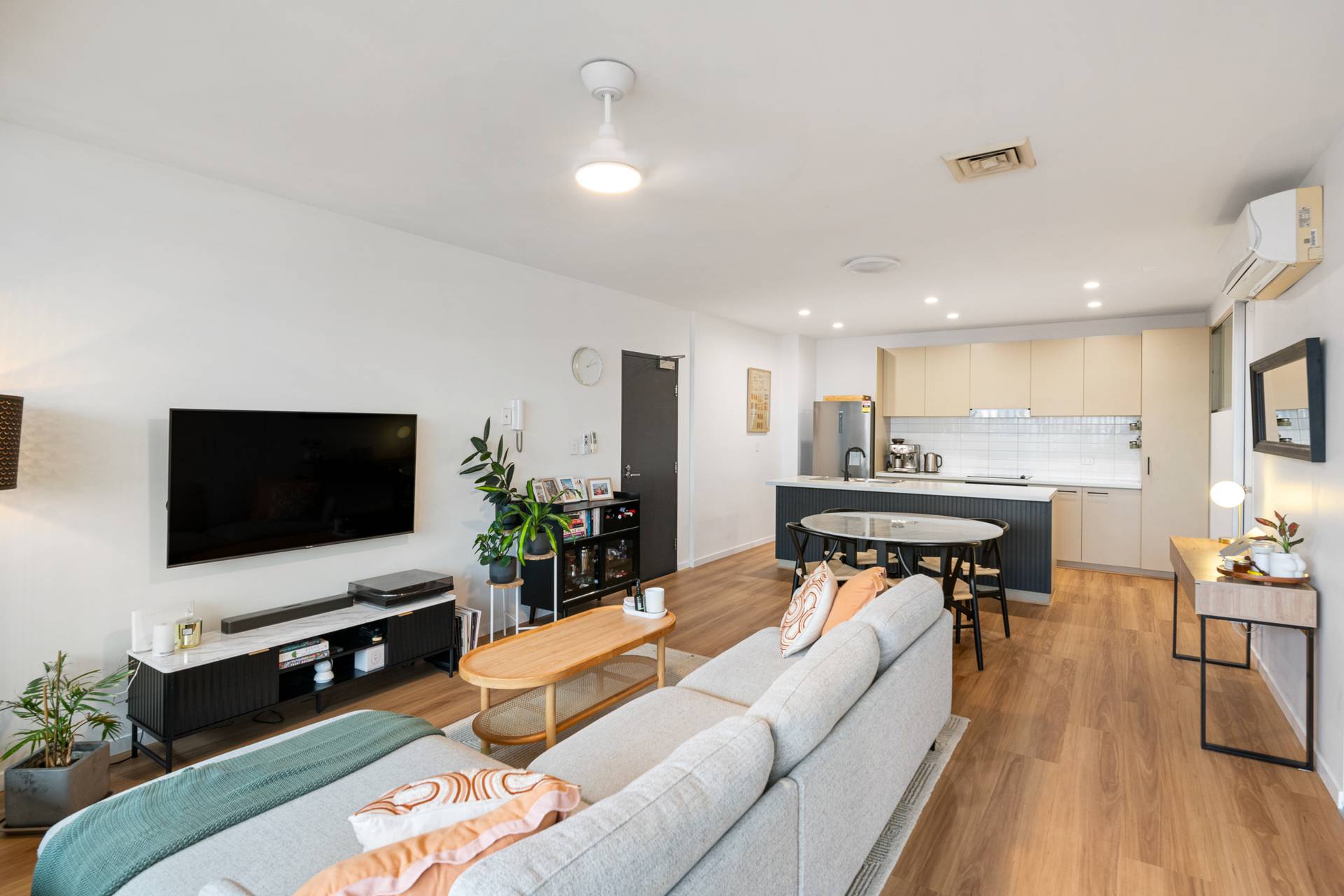 The open design invites indoor-outdoor flow, featuring a spacious living/dining area and a balcony offering relaxed comfort and entertaining by the stylish kitchen with an island bench and upgraded appliances.