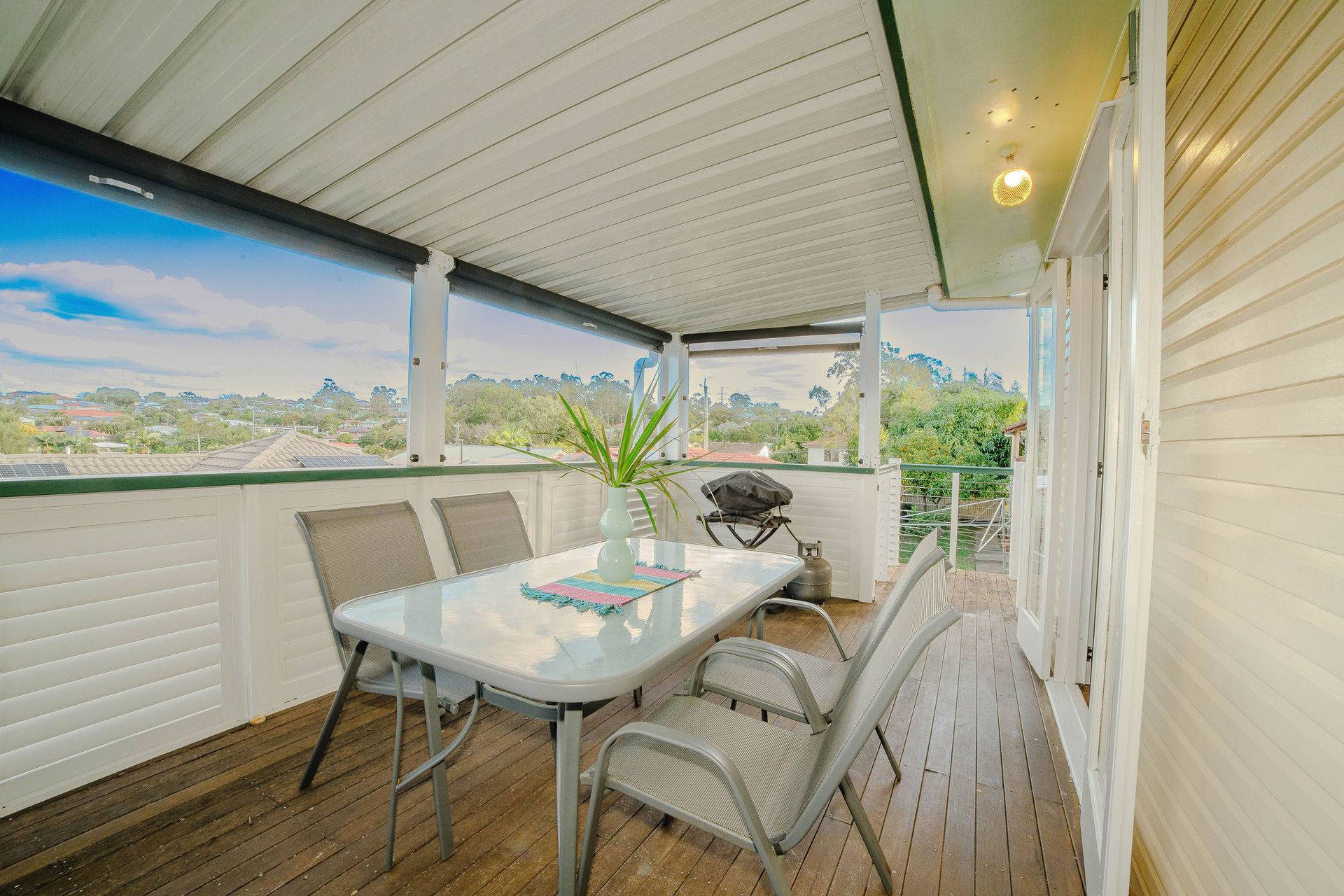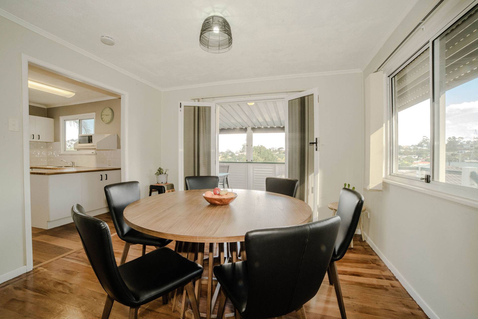 Refined hardwood floors adorn the upper level, where an air-conditioned living area and dining room flow into the stylishly updated kitchen, featuring abundant storage, a filtered water tap, and new benchtops. The front balcony and rear deck extend from this central living zone, allowing you to lounge and entertain outdoors while admiring the tranquil, tree-lined scenery and cooling breezes.