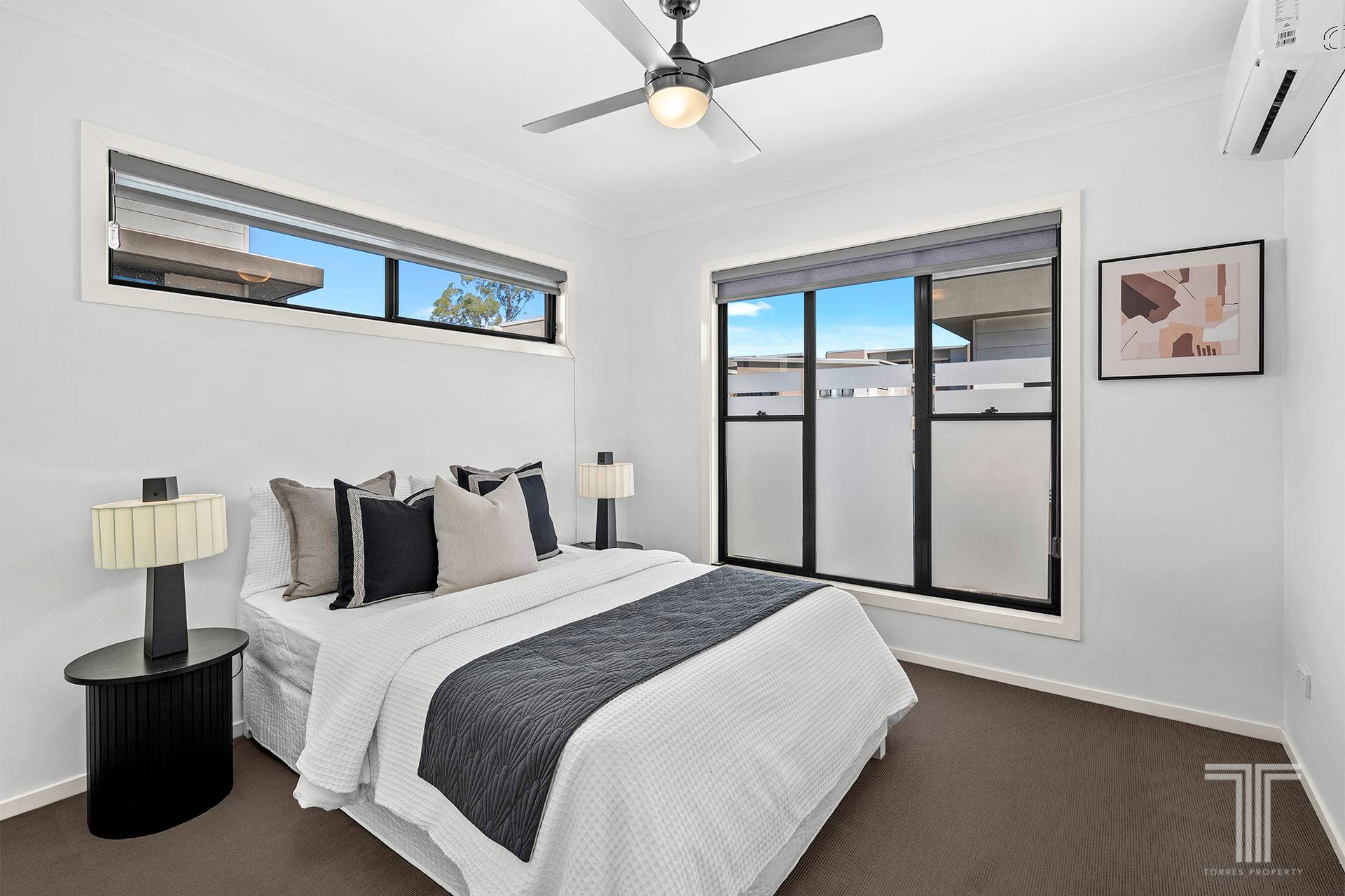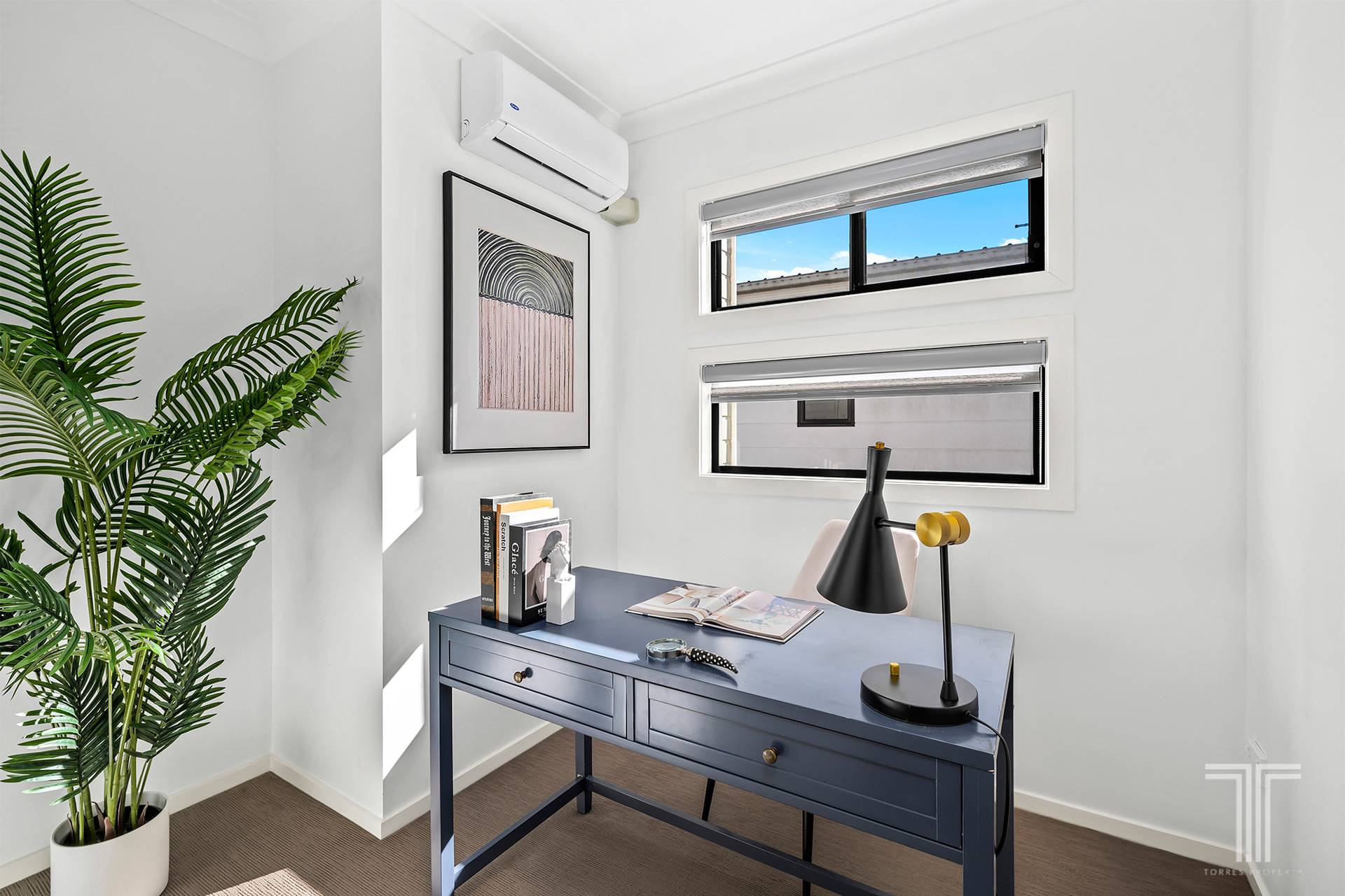 Upstairs, a thoughtfully planned layout includes a study nook, three spacious bedrooms, and two elegant bathrooms. Each bedroom features built-in robes, air-conditioning, and ceiling fans, while the master retreat adds a touch of luxury with a walk-in robe and private ensuite.
