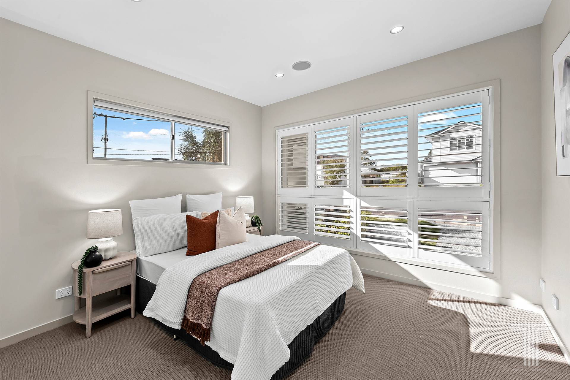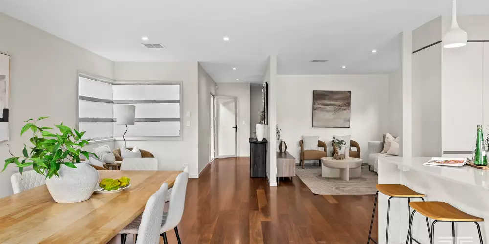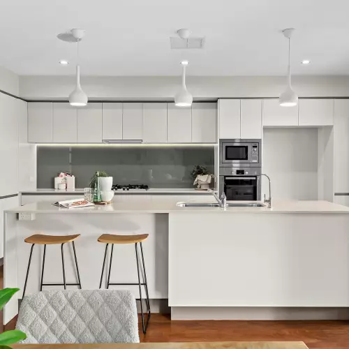 Imbued with stylish sophistication, the interiors reveal timber floors, plantation shutters, and a stunning kitchen and bathrooms. Ducted air-conditioning and downlights enhance the uplifting atmosphere, while natural sunlight streams throughout, illuminating the contemporary design.