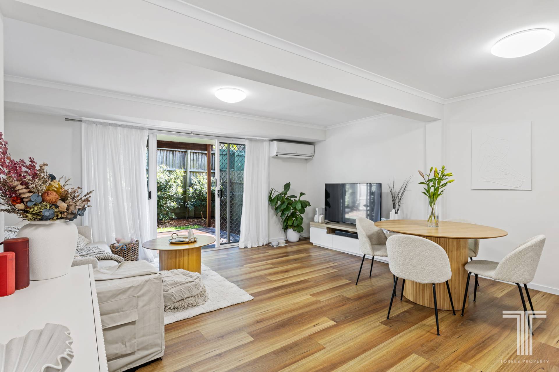 - Open plan living and dining area with timber flooring and air conditioning