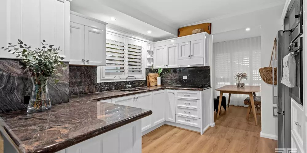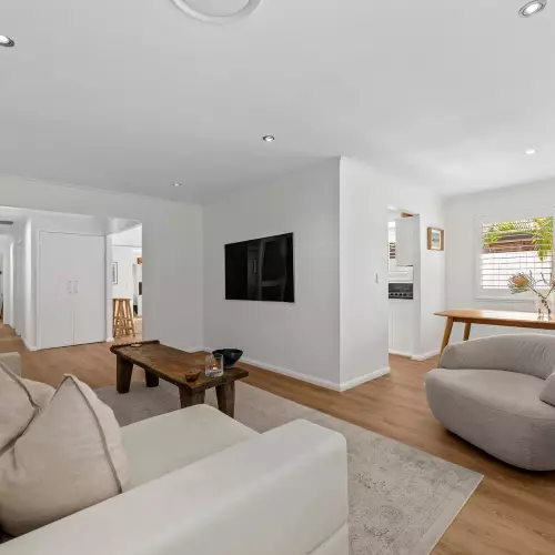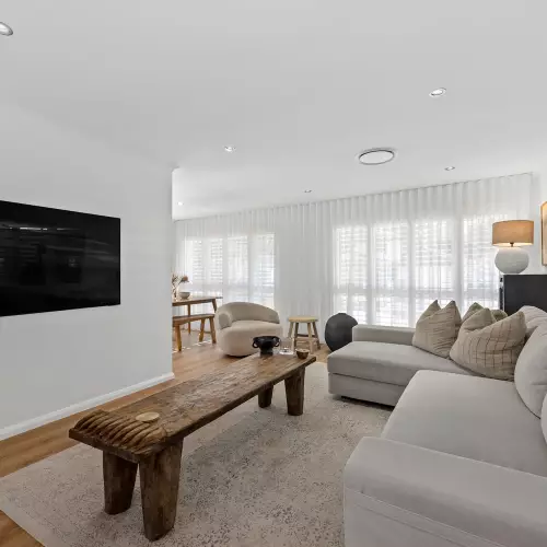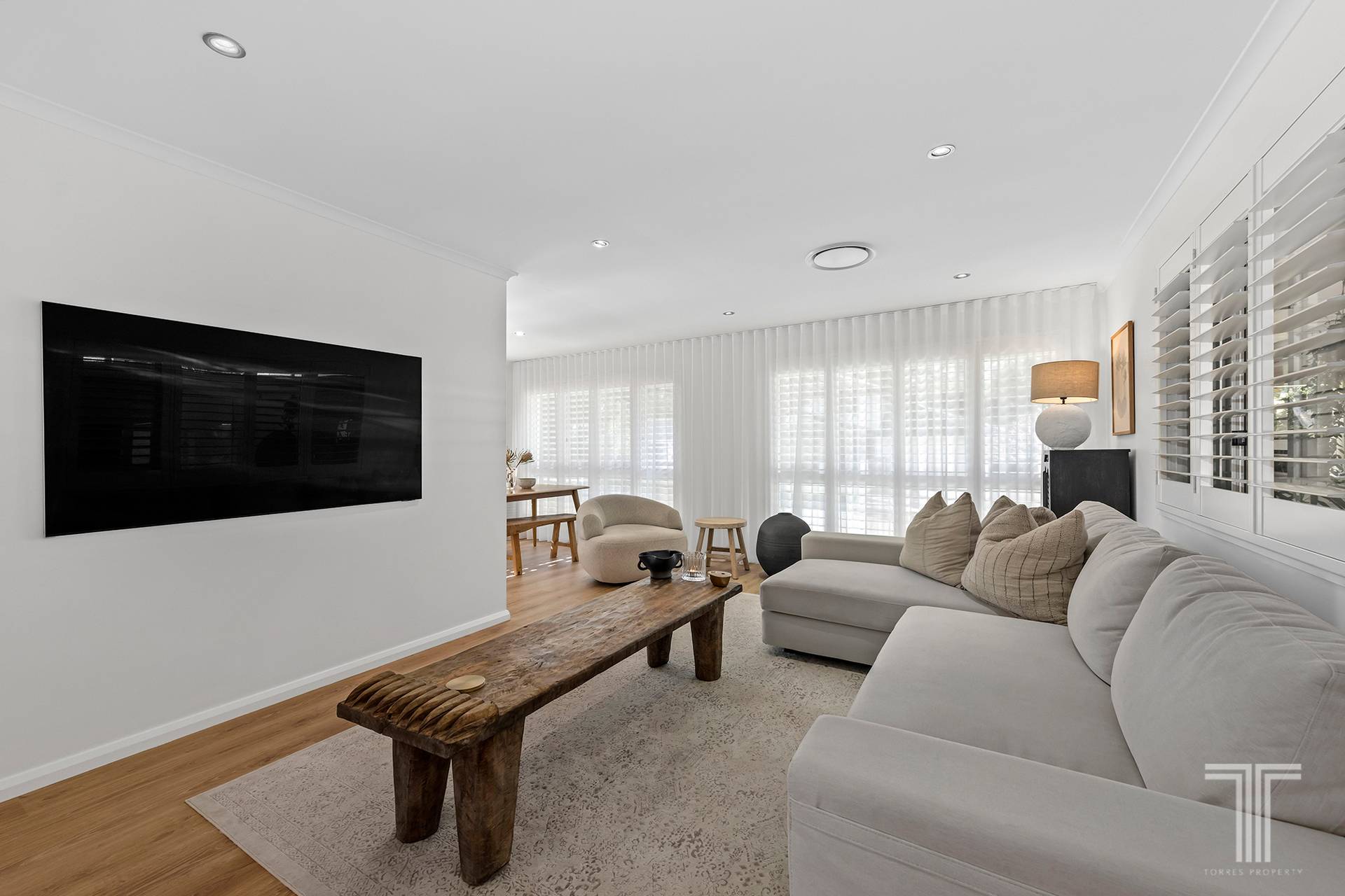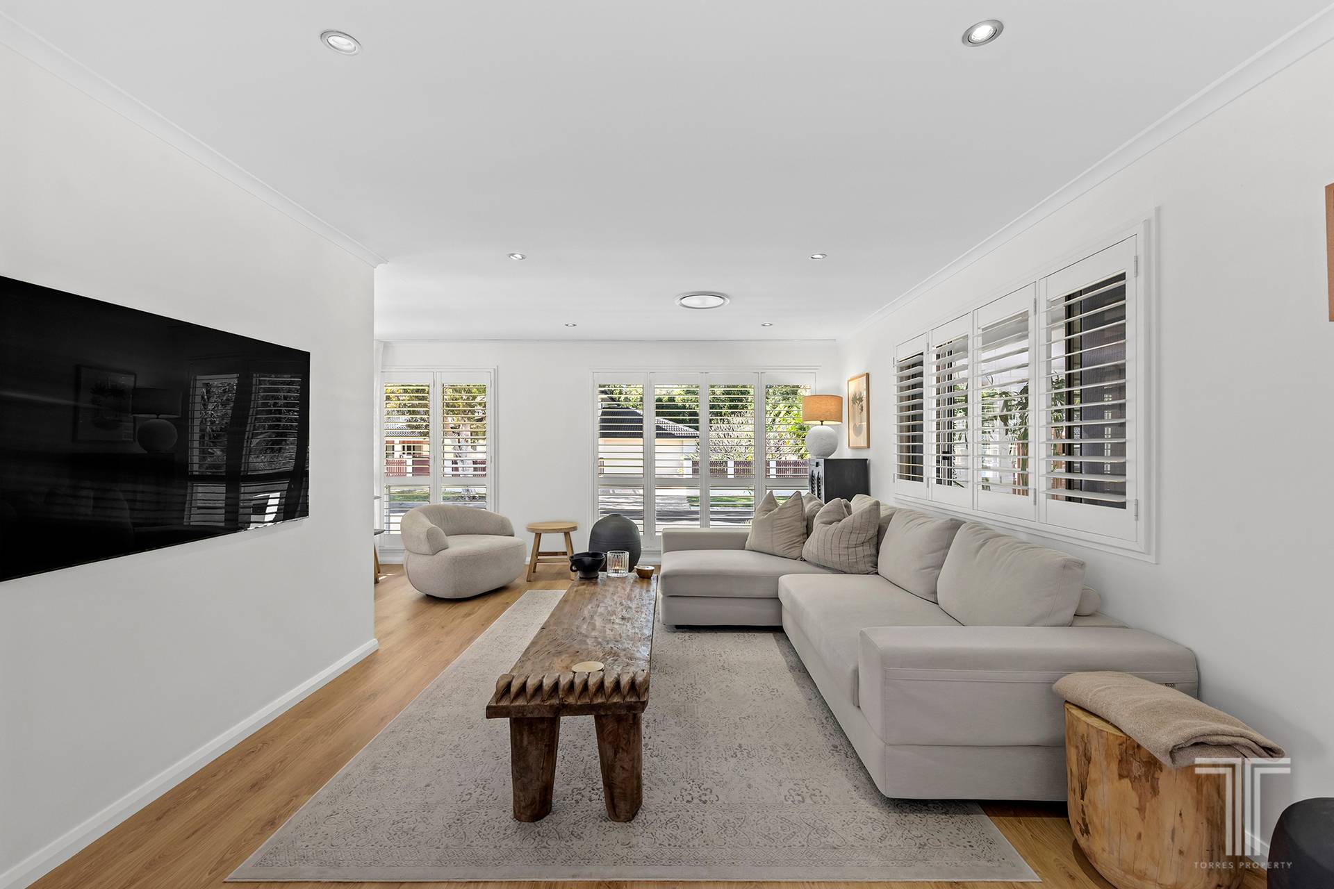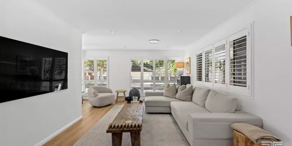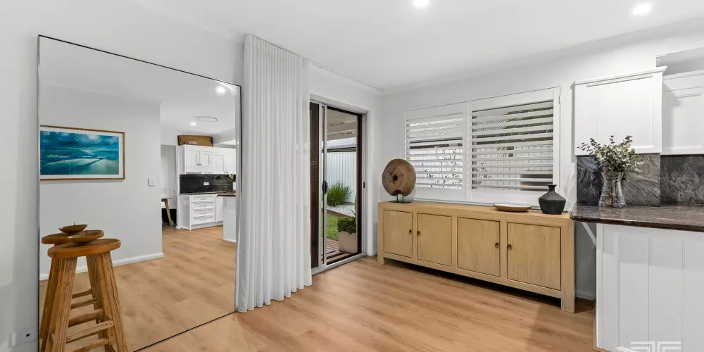 Extending across a free-flowing floor plan, stunning floorboards, sheer curtains and plantation shutters infuse the interiors with contemporary style, and comfort is ensured throughout summer and winter with ducted air-conditioning.