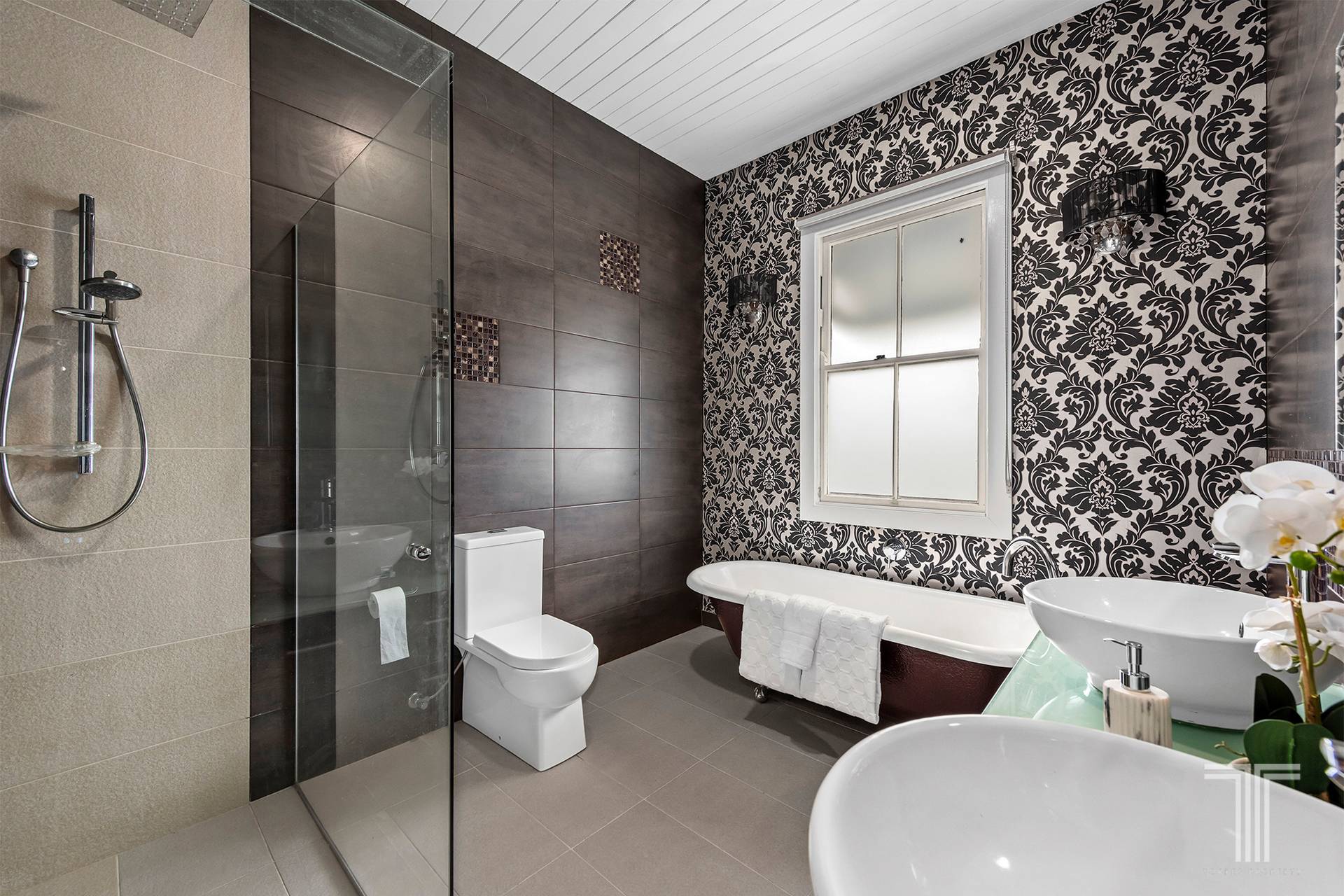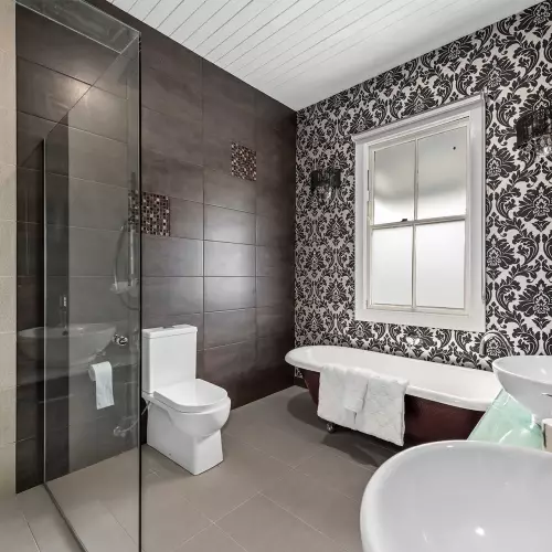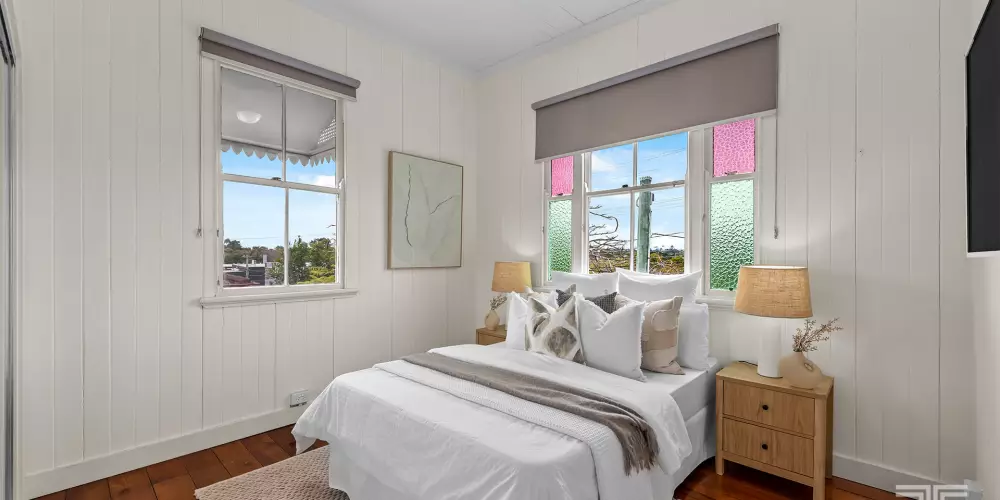 Inside, old and new harmonise across two levels, where renovated kitchens and bathrooms meet the charm of VJ walls, stained glass, and soaring 3.4-metre ceilings.