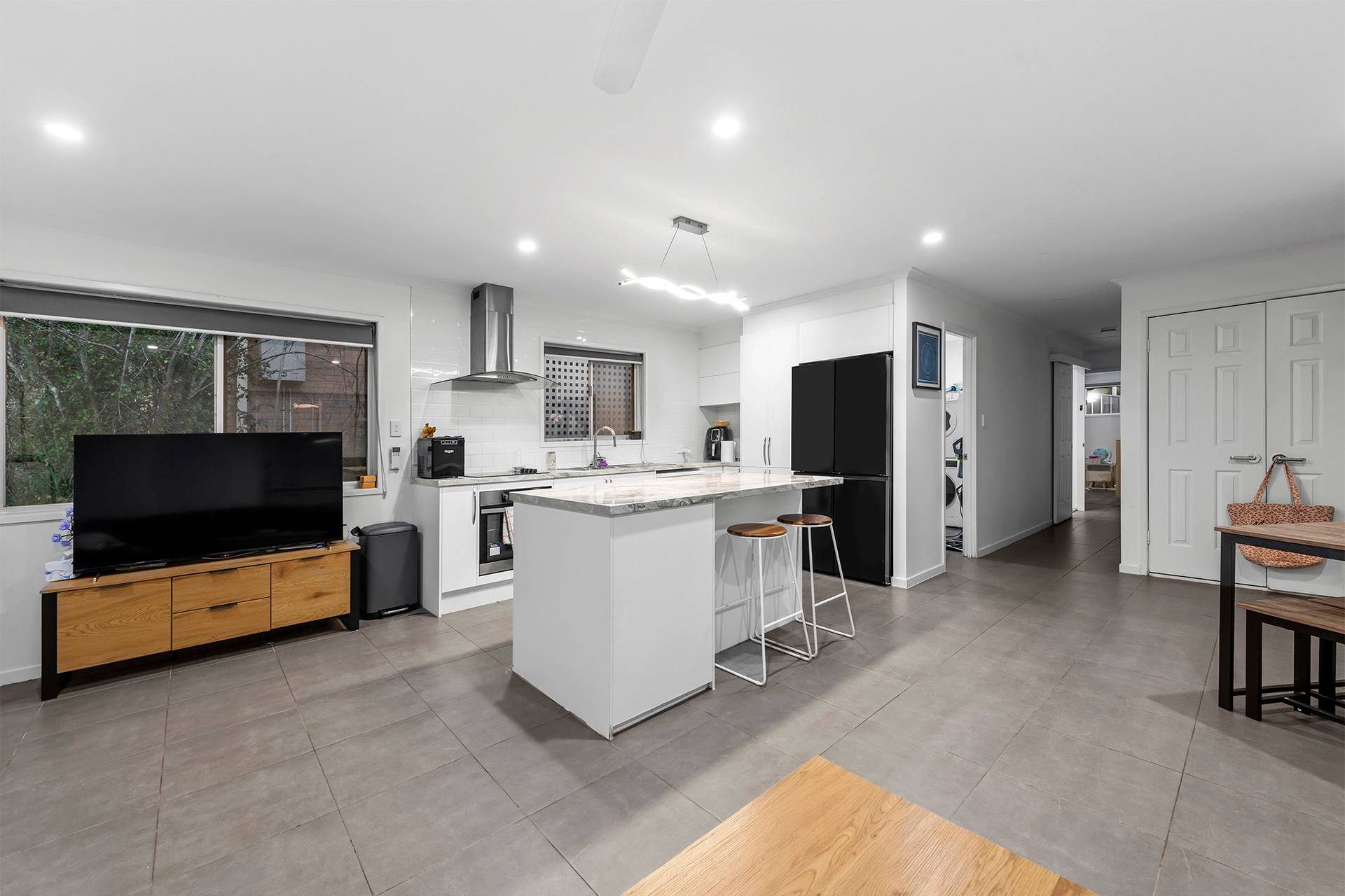 Natural airflow filters into the living and dining area, which fosters family connection with its open design and renovated kitchen, featuring updated fittings and ample storage surrounding an island bench.