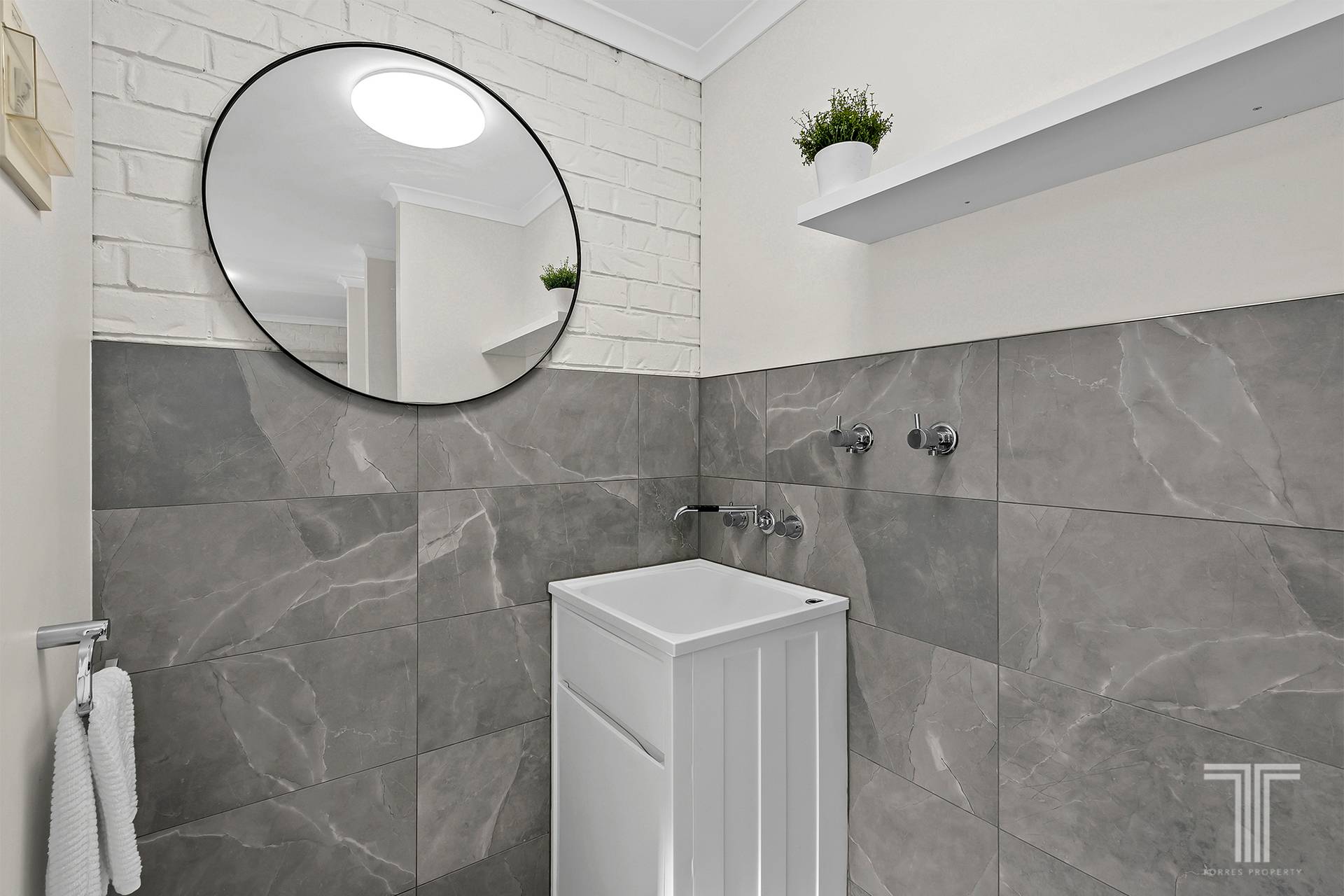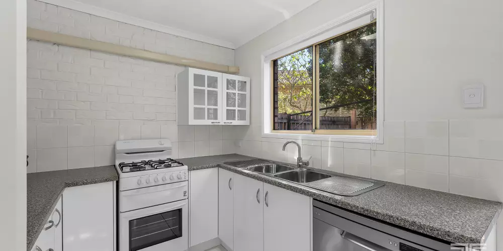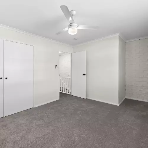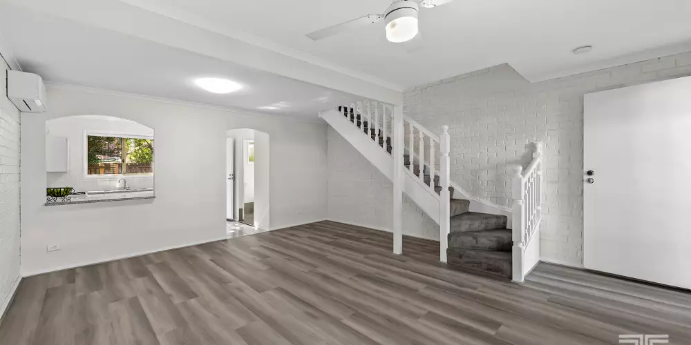 Filled with natural light and cooled by air conditioning, the main living area flows into a modern kitchen with a gas cooktop and dishwasher, then out to a private courtyard perfect for entertaining. The courtyard also offers direct access to the communal green space for added outdoor enjoyment. Upstairs, both bedrooms include built-in robes and ceiling fans. The sleek new bathroom showcases floor-to-ceiling tiles and a rainfall shower. Additional features include a second toilet on the ground floor, internal laundry, and a covered carport.