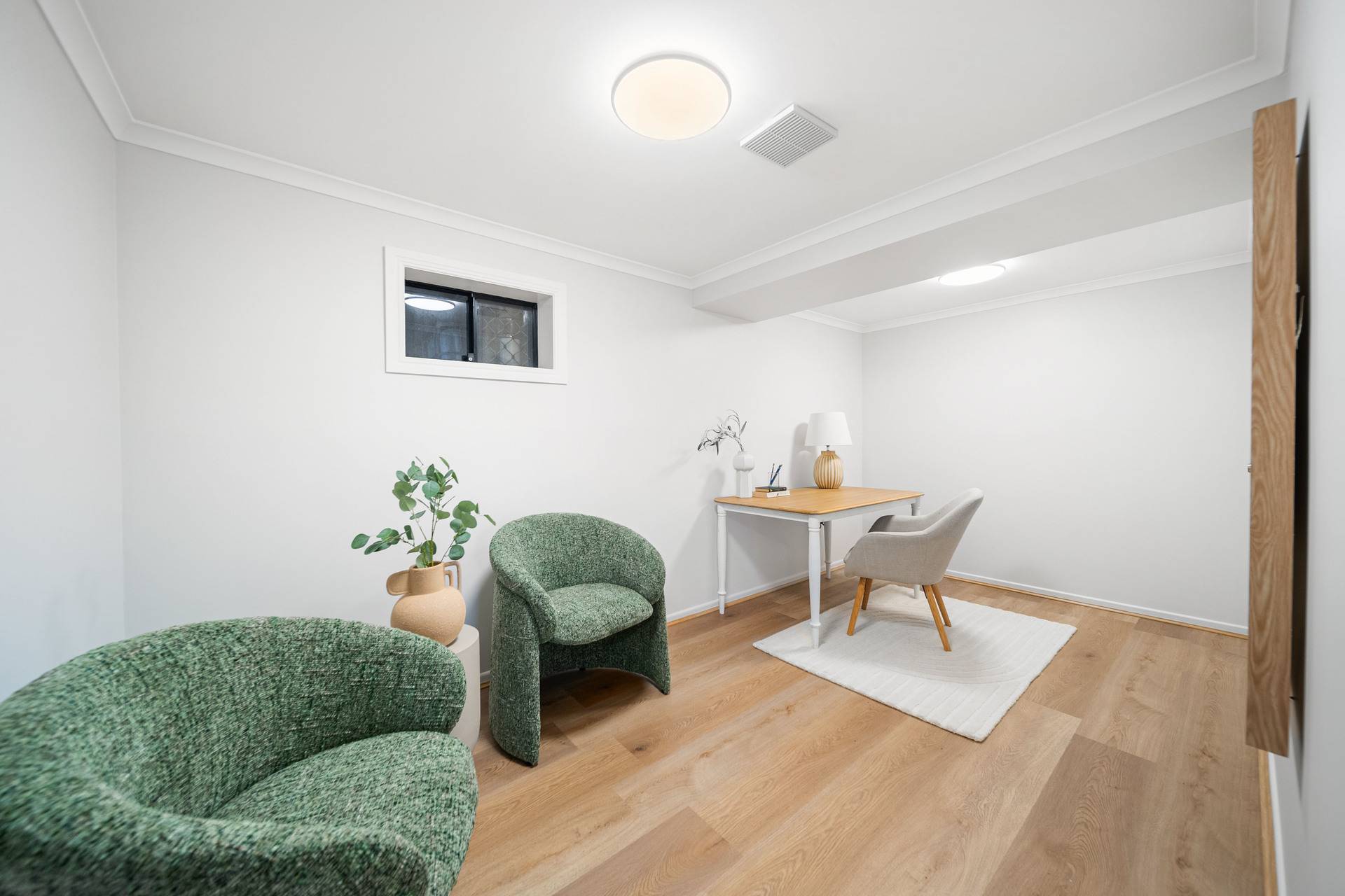 Adding to the appeal, the verdant views extend into the study nook and the main bedroom, which features a private balcony. Two additional bedrooms are located upstairs, while the two multipurpose rooms downstairs offer adaptability for retreating or working from home. Two bathrooms and a laundry finalise the interiors, and the home includes a two-car garage.
