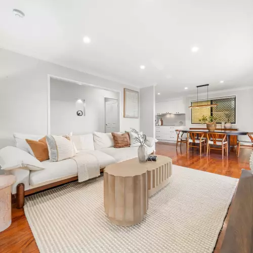Bathed in natural light, the open upper level flows seamlessly across the living and dining spaces, featuring polished timber floors and air conditioning, and into the stonetop kitchen, equipped with modern Bosch appliances.