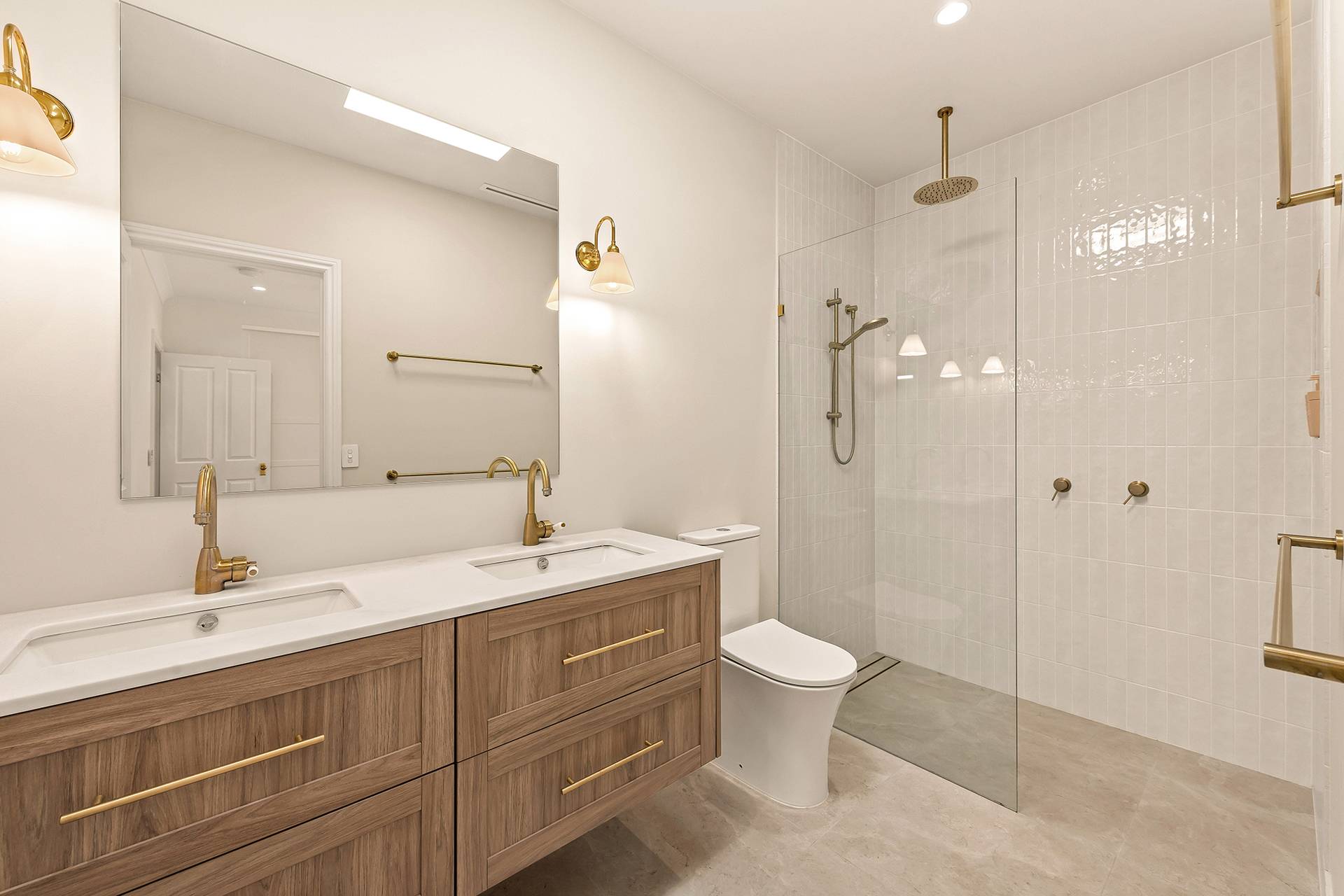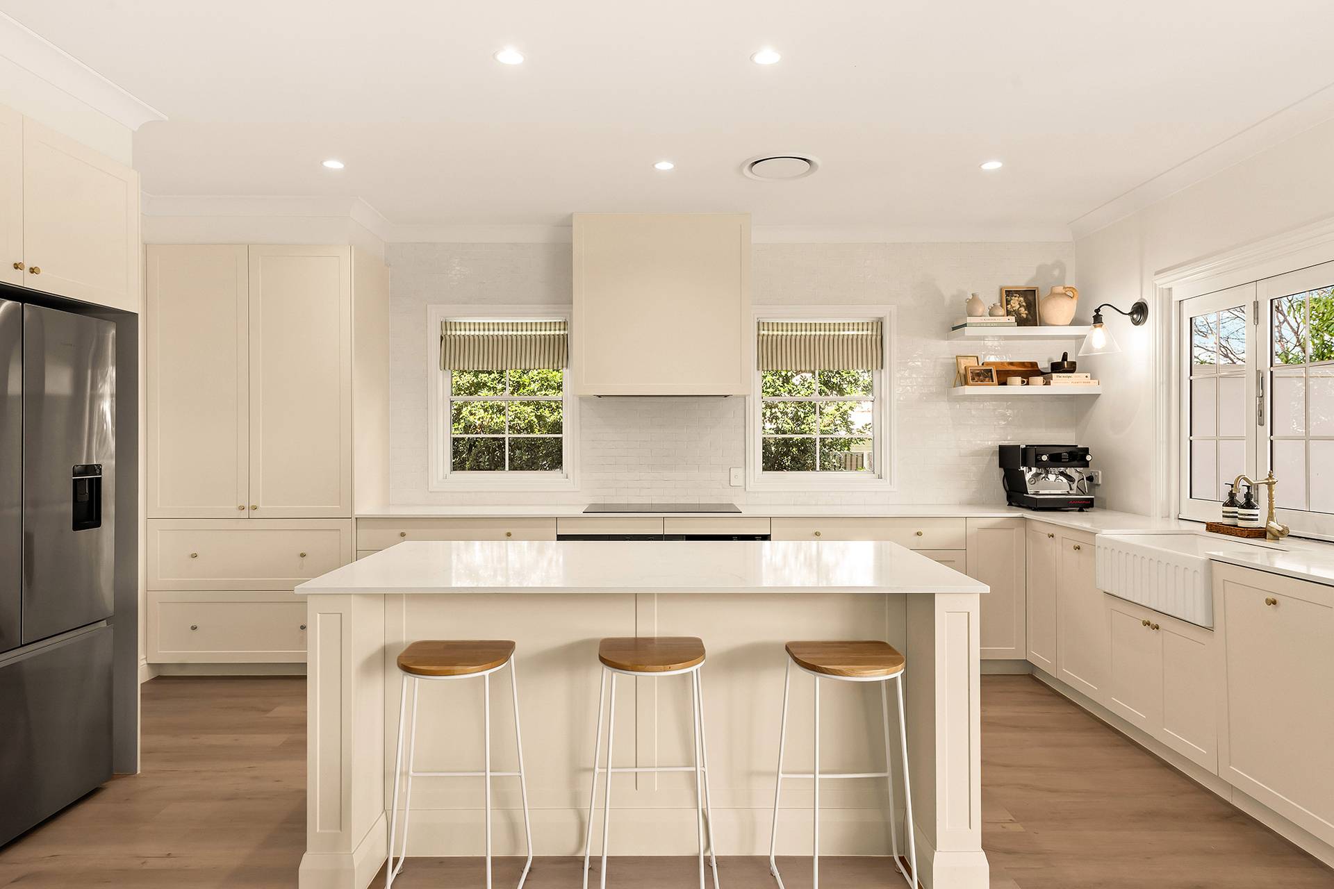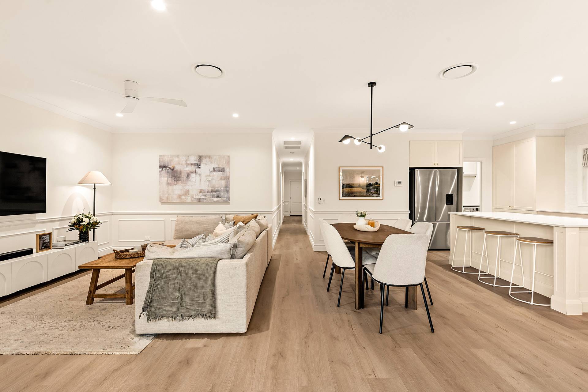 Curated across a single level, 2.7-metre ceilings feature overhead, traditional wainscoting and shaker-style cabinetry adorn the interiors, brass accents and timber tones add warmth, and a stunning display of stone and tiles evokes timeless modern elegance.