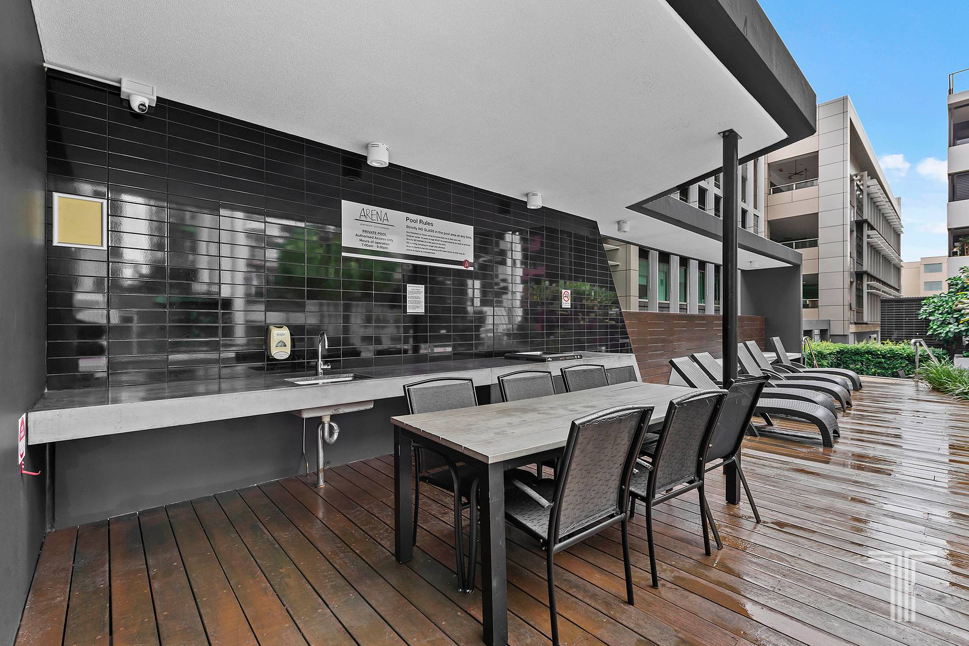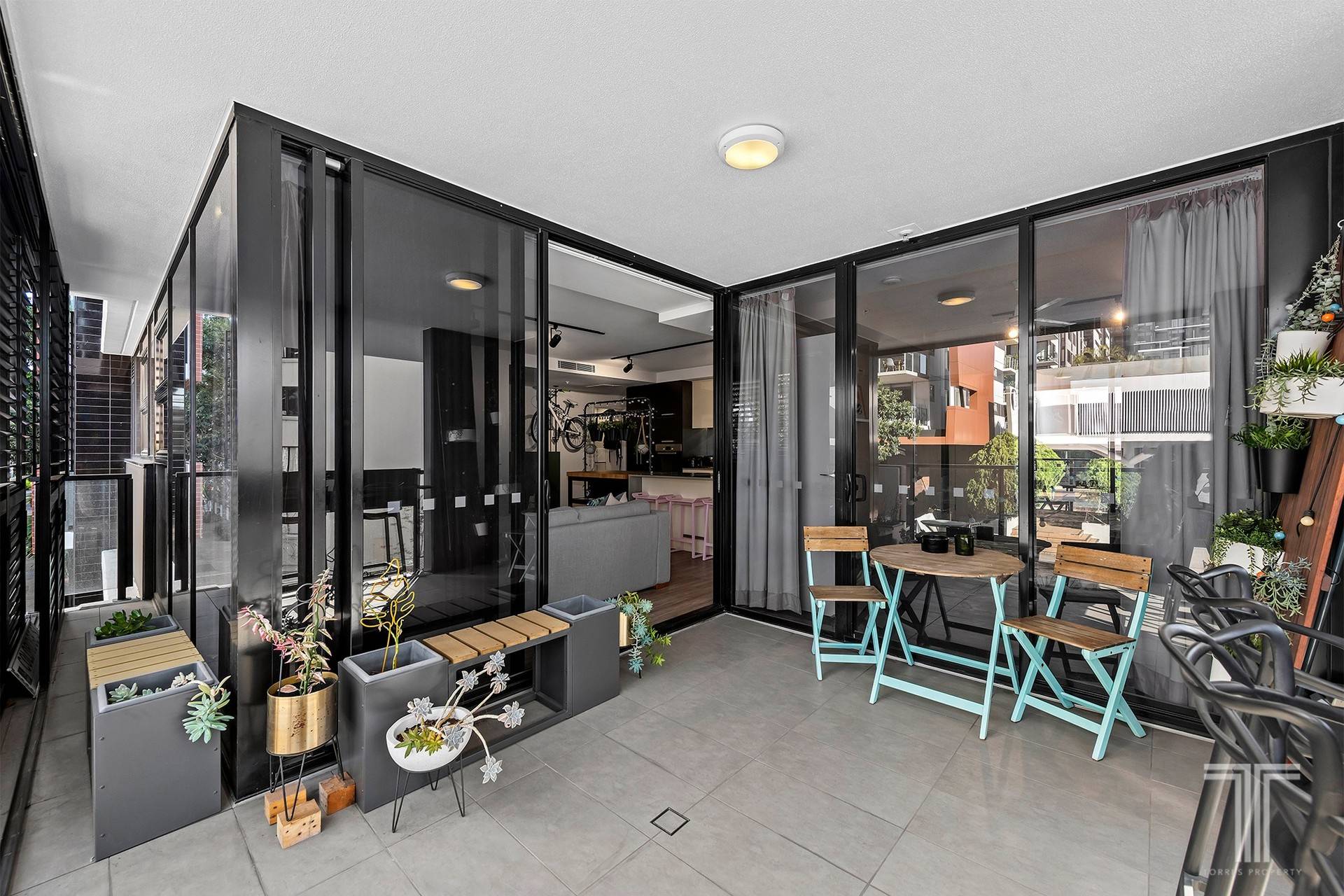 - Balcony with sliding privacy screens