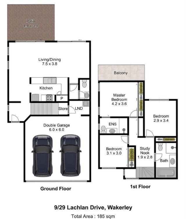 Positioned on the upper level, you will find three bedrooms with built-in robes, a family bathroom and a study nook. Stepping out to a private balcony, the master bedroom also includes an exclusive ensuite adorned with a double basin.