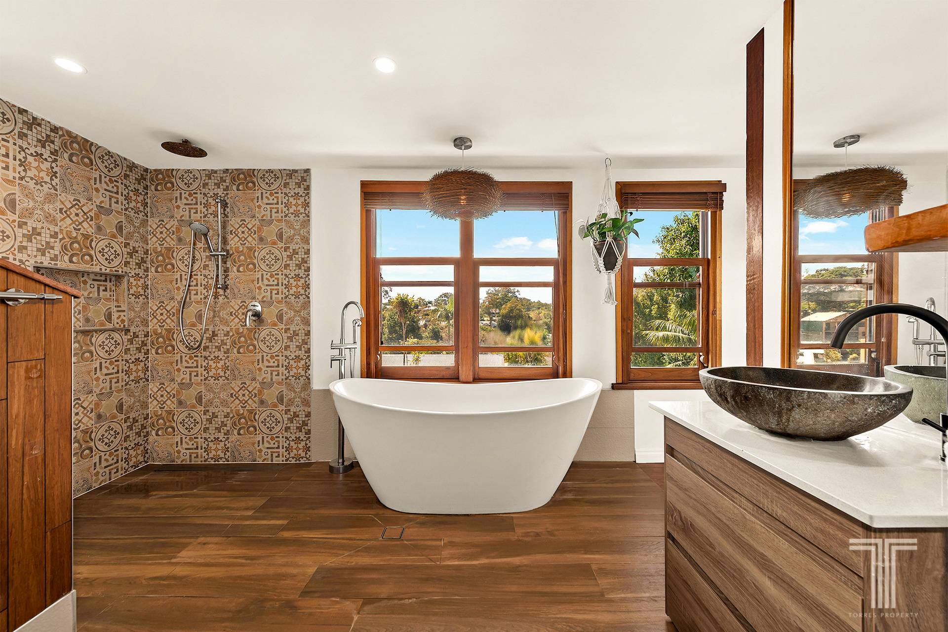 Upstairs, you will discover a retreat, three bedrooms and two bathrooms, including a master suite with a walk-in robe and spa-inspired ensuite soaking in the vistas. Two powder rooms serve the main house and deck, and there is a separate laundry.