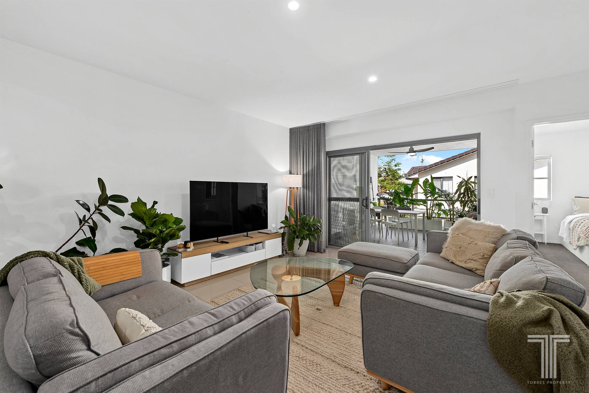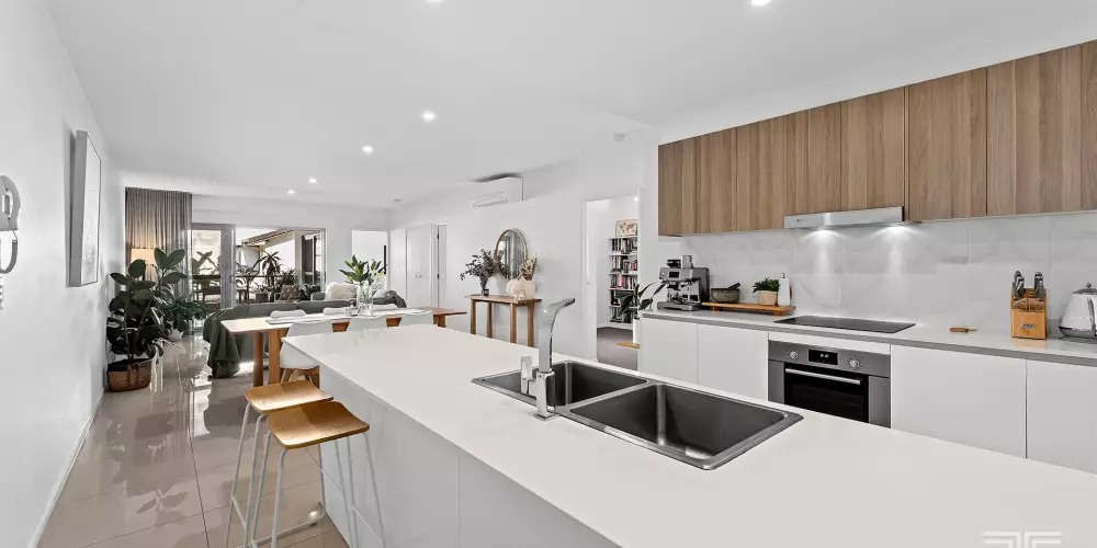 The generous, open-plan layout seamlessly integrates living, dining, and a gourmet kitchen, equipped with sleek finishes, ample storage, a double sink, oven, and dishwasher — ideal for the home chef.