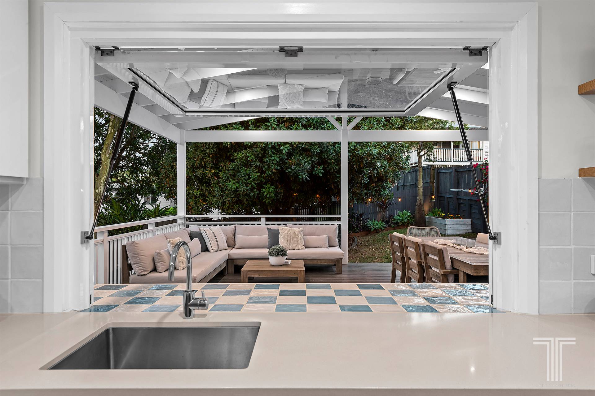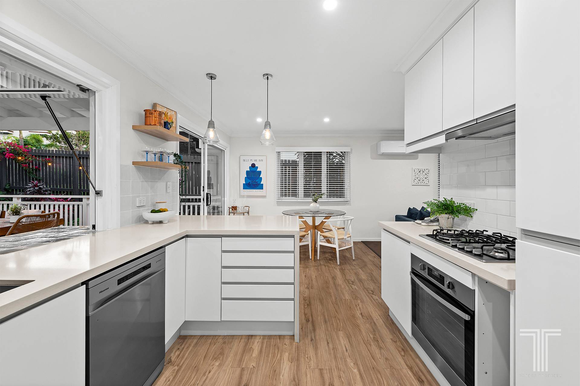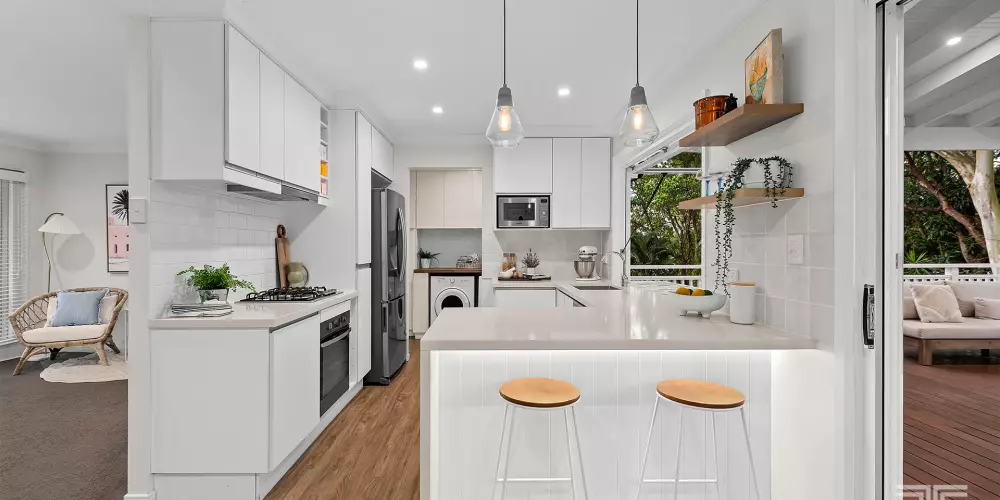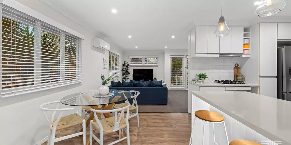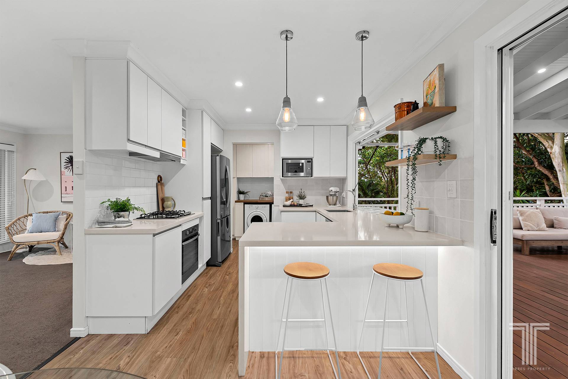 Upstairs, flow from the air-conditioned living area to the transformed kitchen, showcasing style and space with stone benchtops, a breakfast bar, and stainless steel appliances.