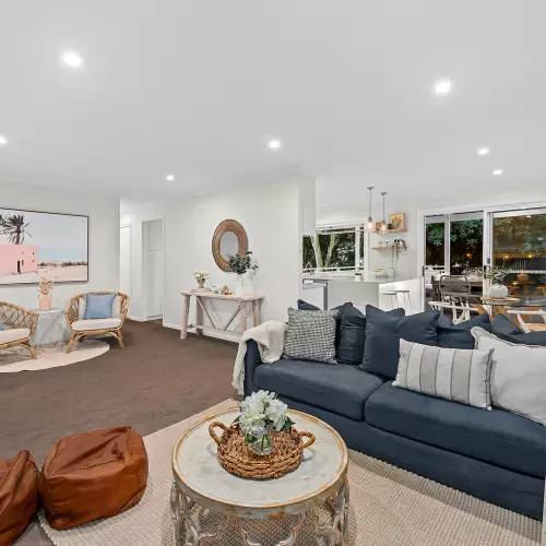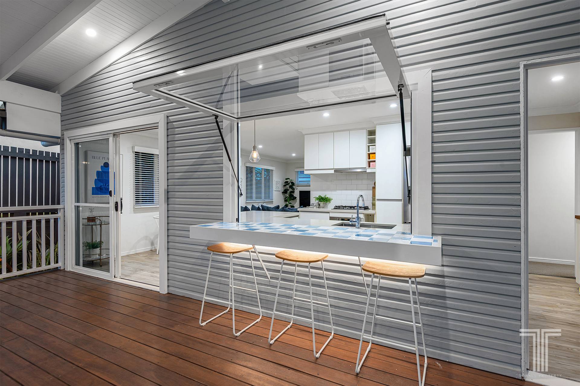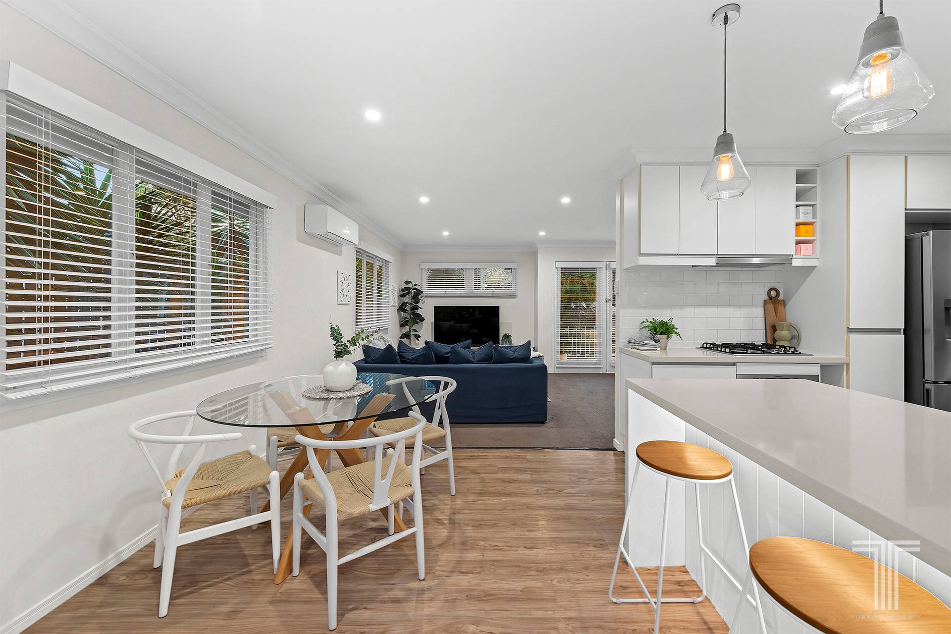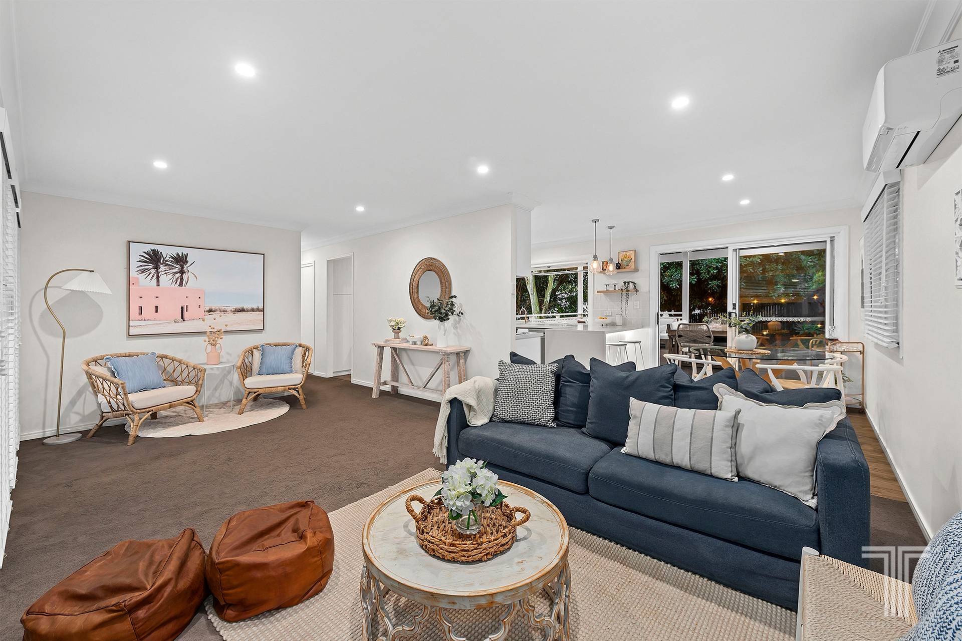 Upstairs, flow from the air-conditioned living area to the transformed kitchen, showcasing style and space with stone benchtops, a breakfast bar, and stainless steel appliances.
