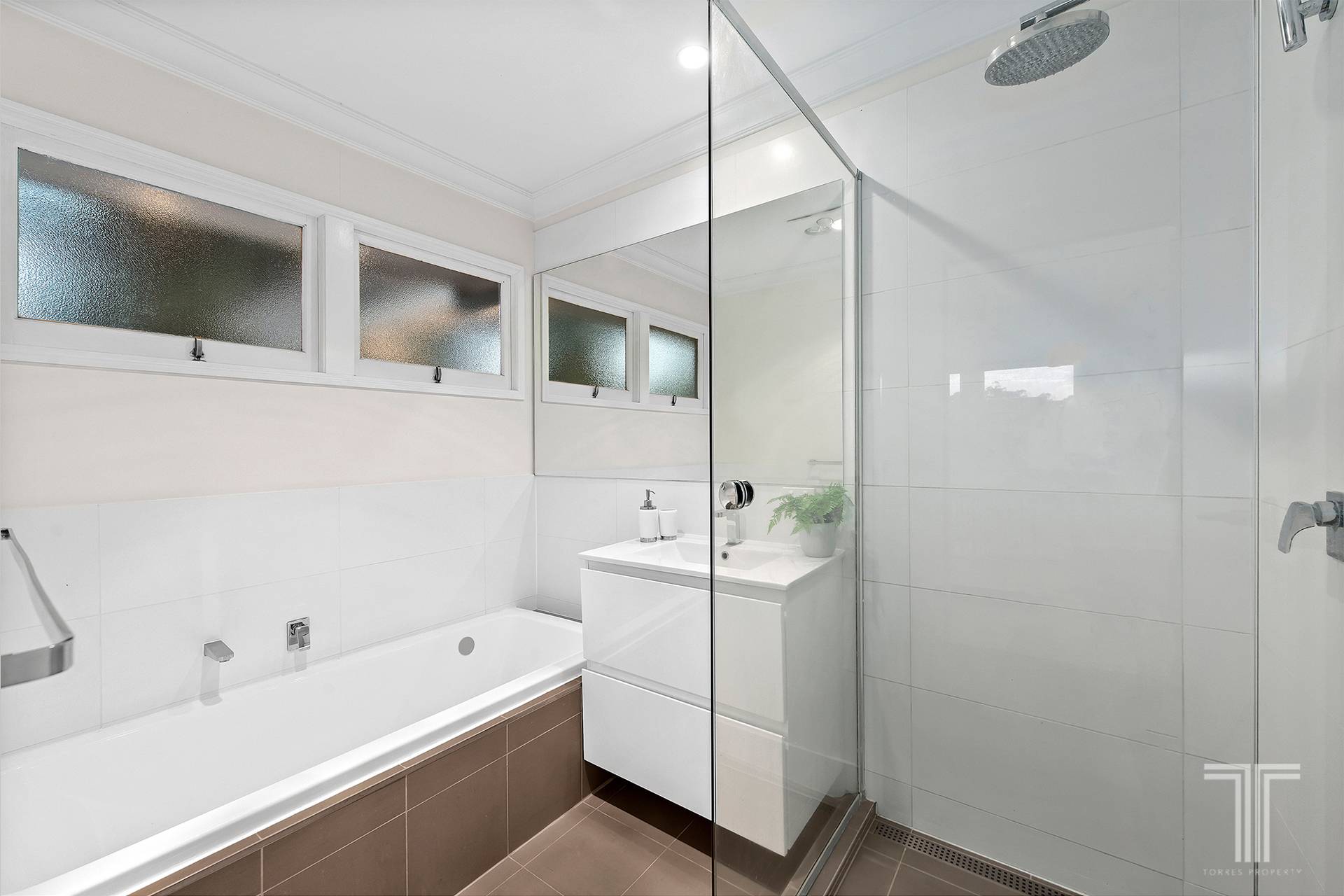 Three carpeted bedrooms are upstairs, and the modern bathroom features a shower, bathtub and separate toilet. The internal laundry is easily accessible from the kitchen, and a second bathroom is located downstairs. With a double garage, garden shed, and under-deck area, the house offers ample storage space.