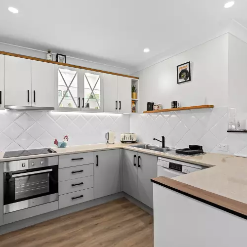 The inviting interiors showcase a flowing layout, featuring an air-conditioned living/dining area and a beautifully renovated kitchen equipped with an Arc oven, Omega stovetop, and Esatto dishwasher. A newly added dining table with a beach-style top enhances the open-plan feel, creating a more spacious and welcoming environment for family meals and entertaining.