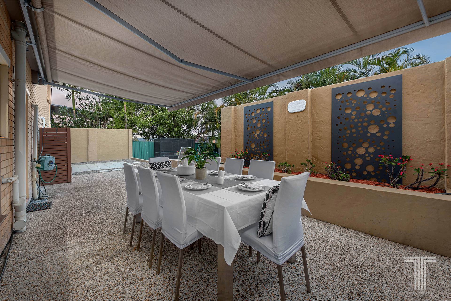 A shaded entertaining area with retractable awning provides the perfect year-round outdoor escape, flowing to a private yard bordered by neat hedging and open green space.