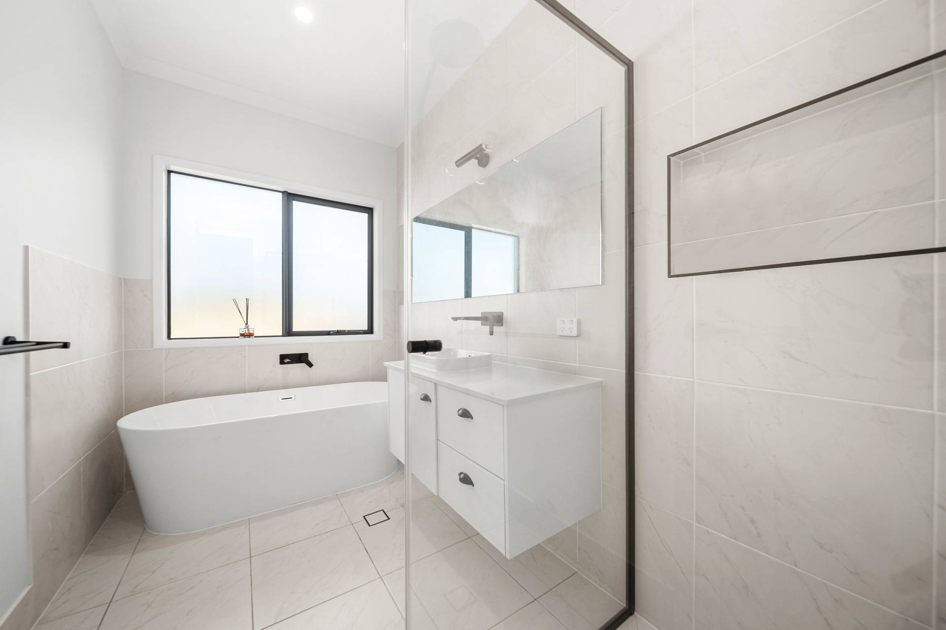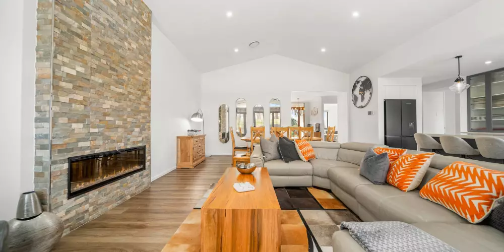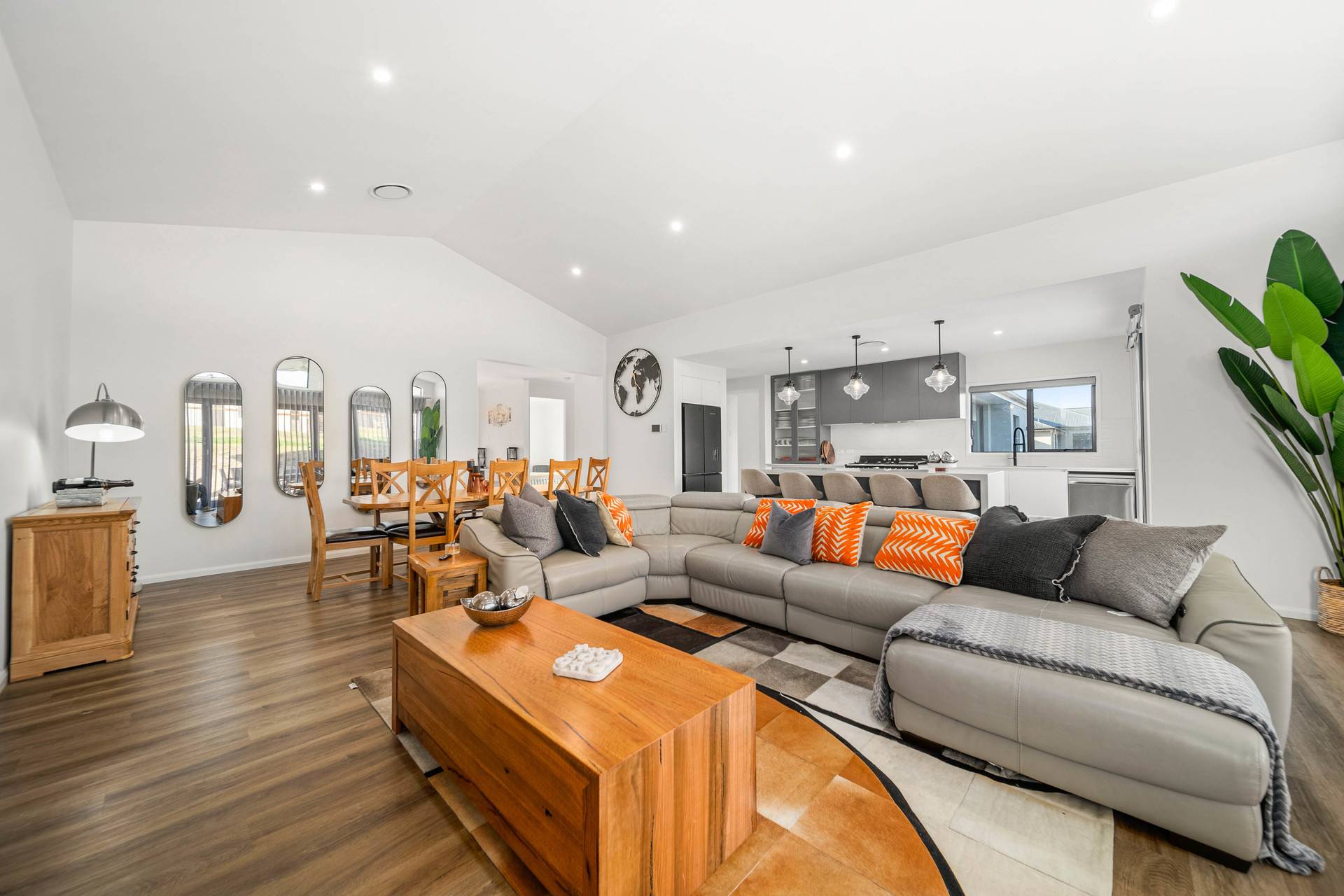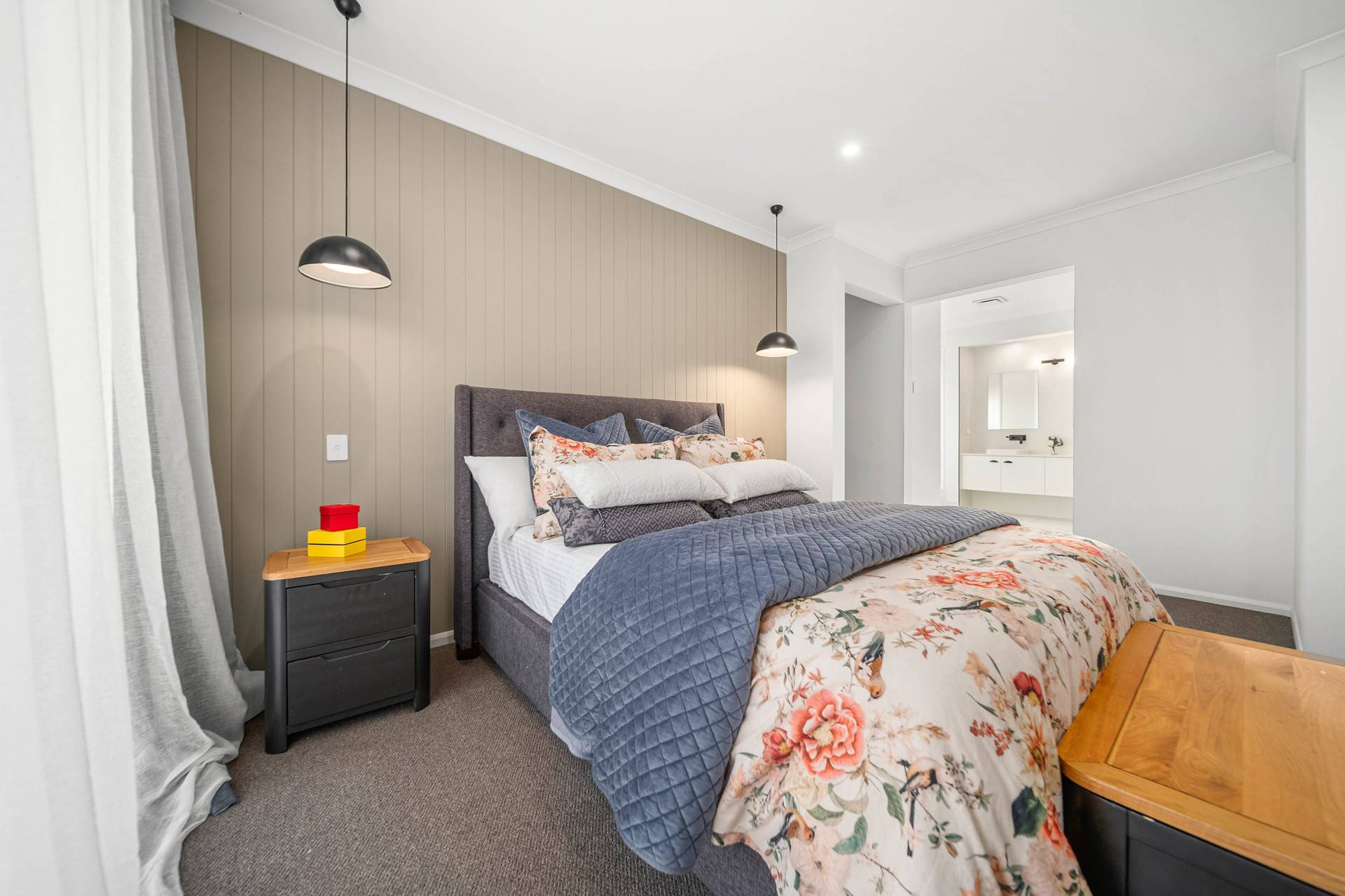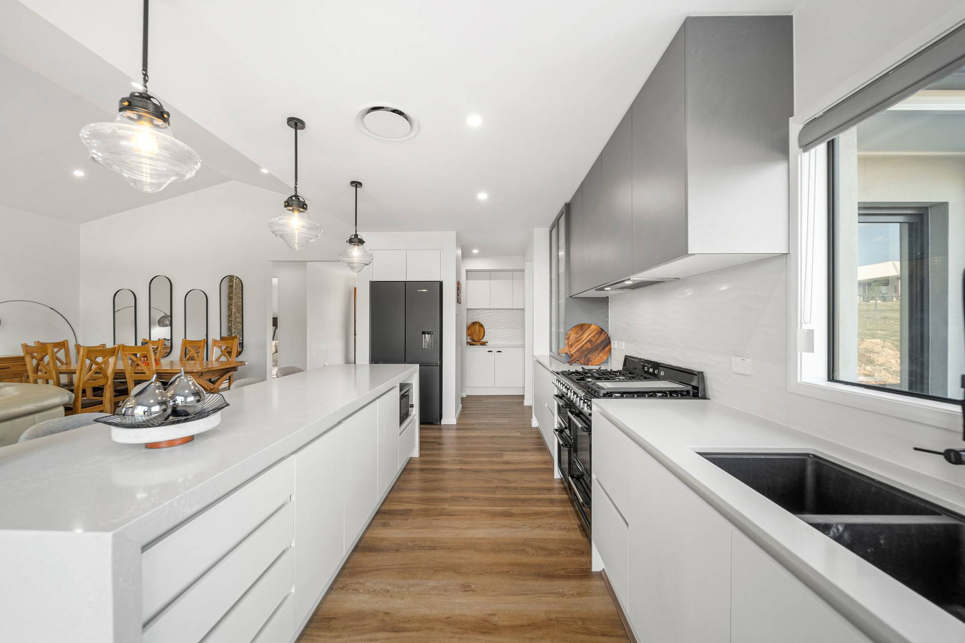 Expertly crafted and elegantly appointed, masonry render, stone and VJ feature walls, spotted gum cladding, and floating hybrid vinyl floors highlight the flowing layout. Perfect for living and entertaining, 2.7m ceilings rise to a soaring 4m cathedral roof in the living/dining area, which is warmed by an electric fireplace and extends to the culinary kitchen, where 60mm Caesarstone encases the granite sink, Smeg appliances and walk-in pantry.