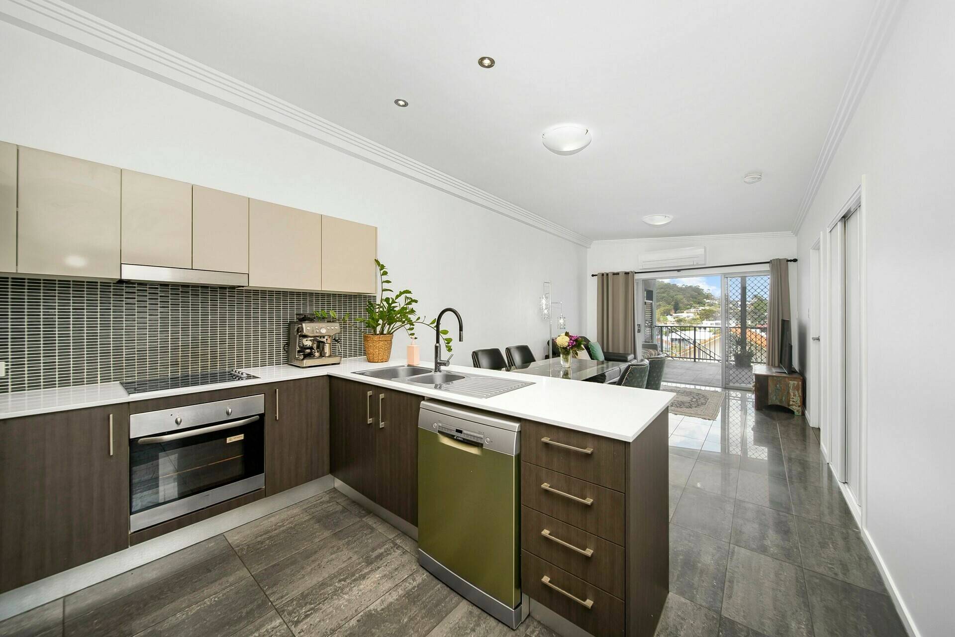 Laid with sleek tiled flooring and finished with stone benchtops, the air-conditioned kitchen and living/dining area flow through glass doors to the expansive entertainer's balcony, creating a single, spacious retreat to lounge, share meals, and host guests amid the breezes.