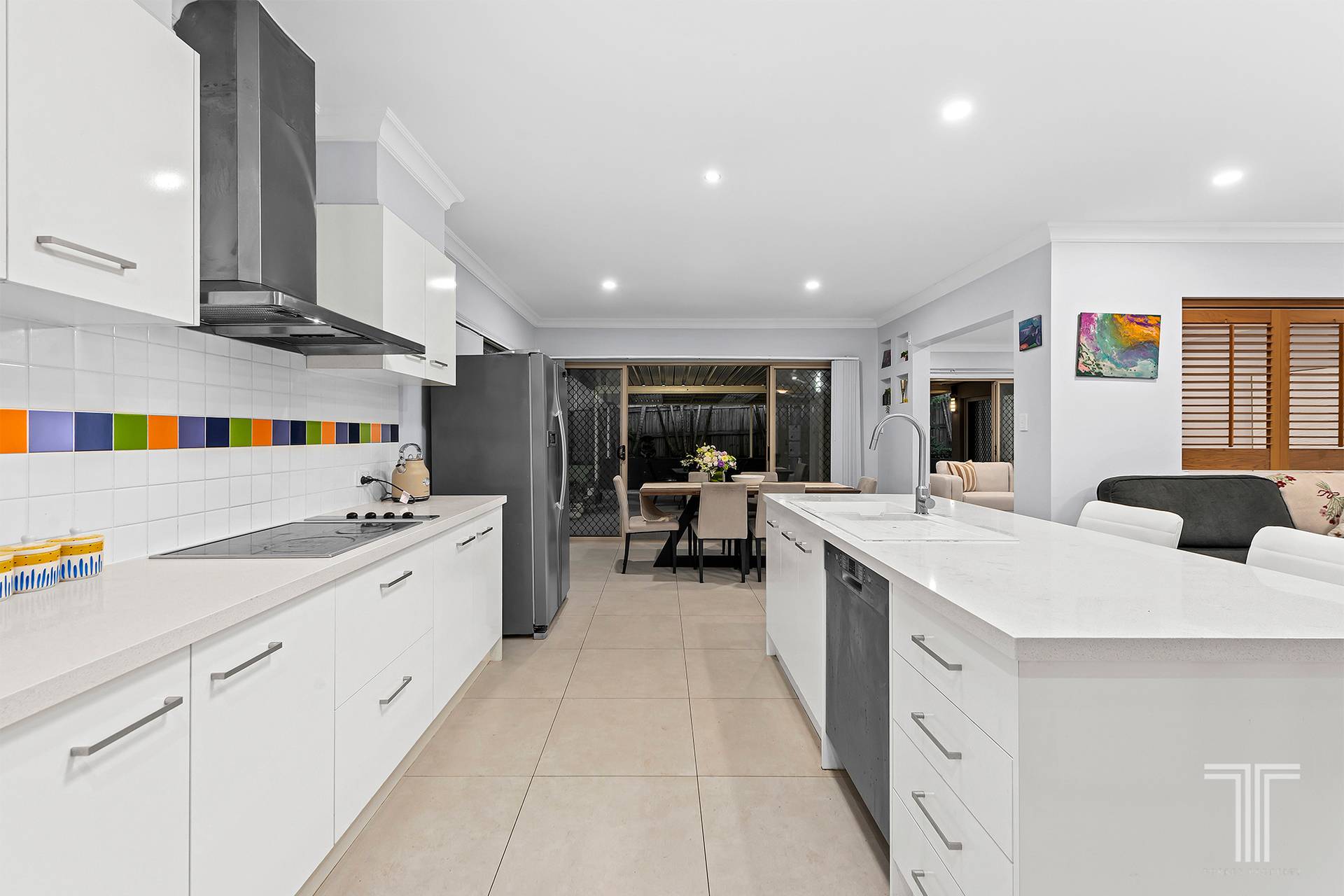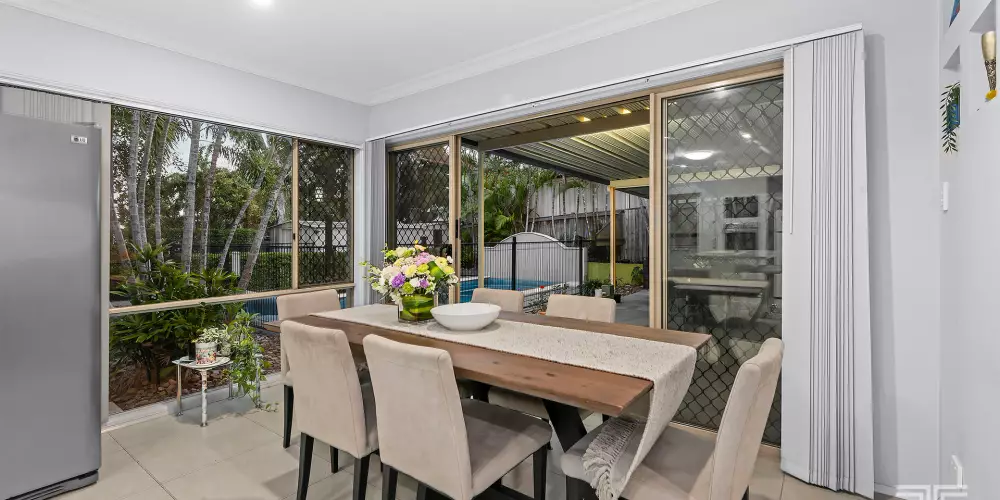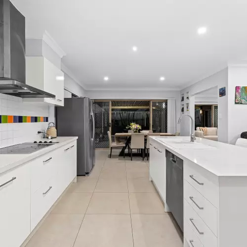 At the heart of the home lies the central kitchen and dining area, seamlessly connecting to the main living spaces. Styled in soft, neutral tones, it creates a warm and functional hub for daily family life. Flowing through sliding doors, the home opens to a massive outdoor alfresco area, large enough to host two separate dining or lounge settings. It's the perfect setting for summer barbecues, family celebrations, or simply relaxing poolside as the sun sets.