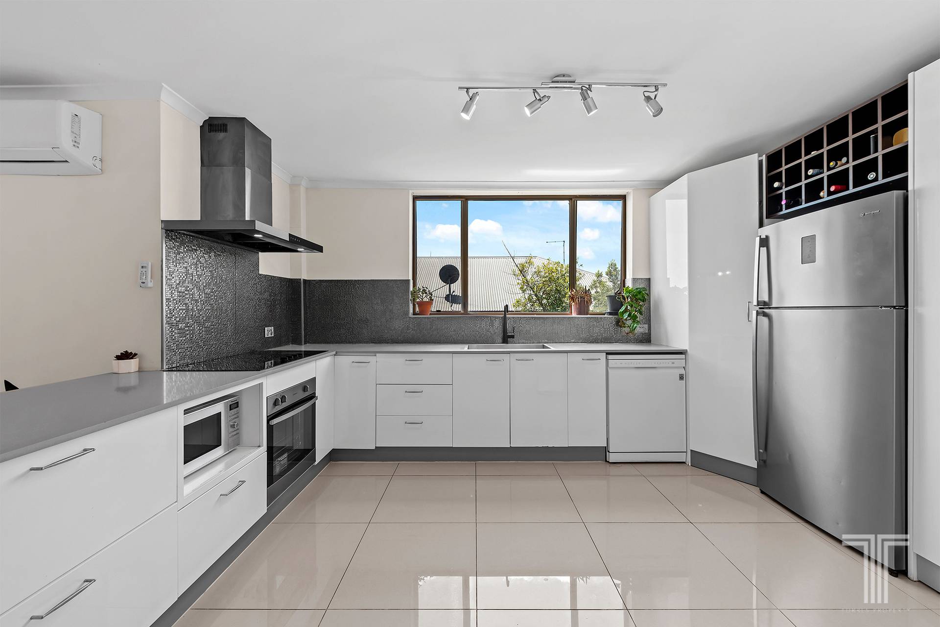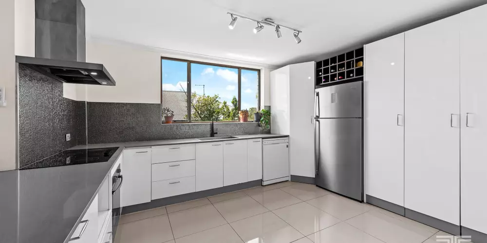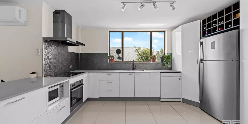 Experience the relaxing atmosphere indoors, where a living and dining area displays sleek tiles and air-conditioning, and an adjoining balcony invites morning coffee and afternoon wines while taking in the views. The modern style is matched with utility in the renovated kitchen, featuring stone benchtops, generous storage, and a concealed European laundry within the open design.