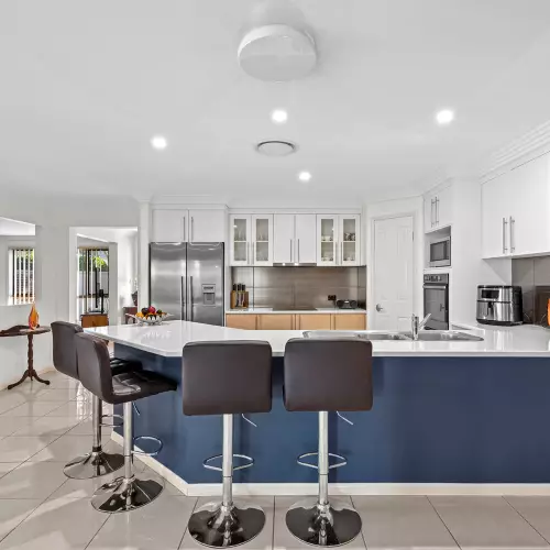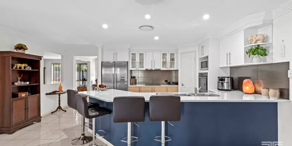 At the heart of the home, the expansive open-plan kitchen, dining and family zones are designed for connected living. The gourmet kitchen is a chef's delight, appointed with extensive stone-look benchtops, a breakfast bar, and premium stainless-steel Westinghouse appliances. A second lounge can be seamlessly integrated for a grand sense of openness or closed off for private family enjoyment.