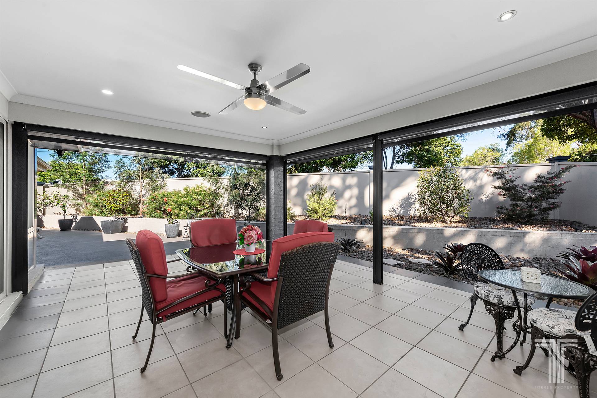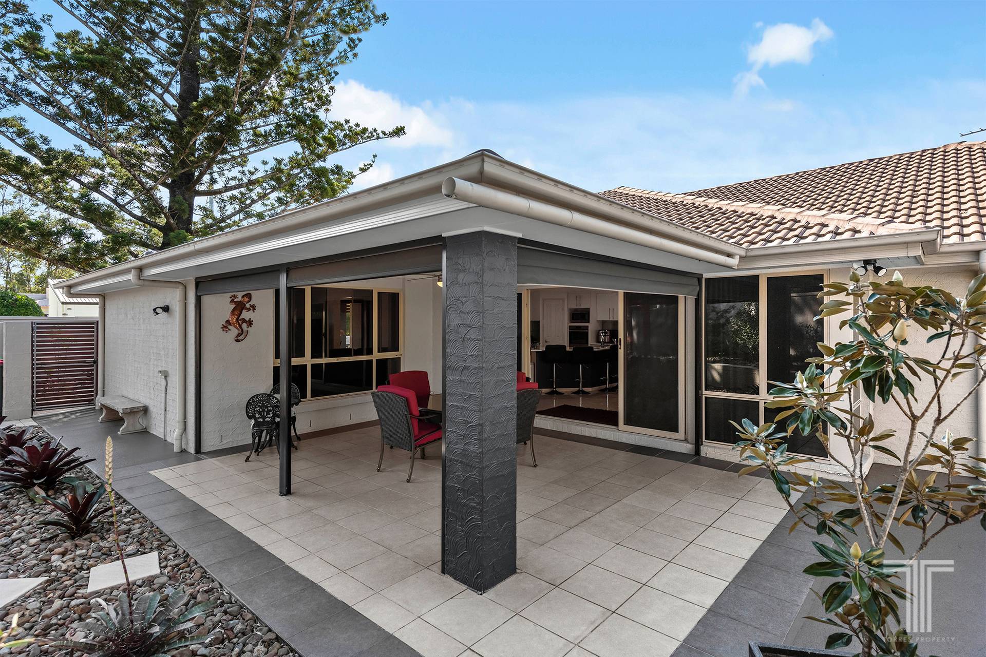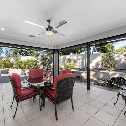 Transitioning effortlessly to the outdoors, glass sliding doors reveal an inviting alfresco patio that can be fully enclosed for year-round entertaining. Surrounded by tropical gardens and a peaceful, low-maintenance landscape, this idyllic retreat promises serenity, privacy and endless moments of relaxation.