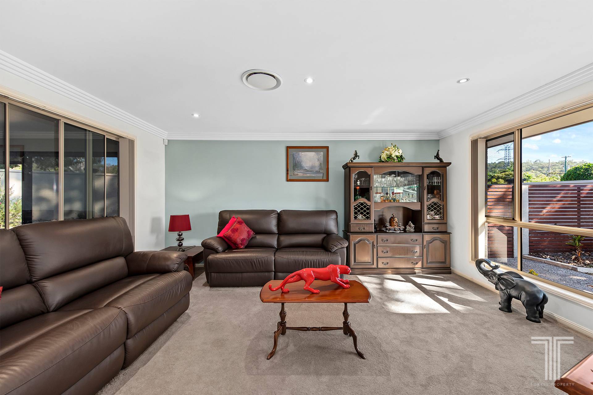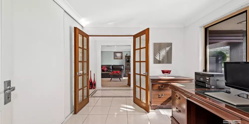 Exuding contemporary elegance, the interiors are beautifully appointed with sleek tiled flooring, soft plush carpet, and striking feature walls that together create a calming, modern ambience. Beyond the welcoming entryway, a formal lounge offers an intimate retreat framed by tranquil garden vistas-an ideal setting for refined entertaining or quiet relaxation.