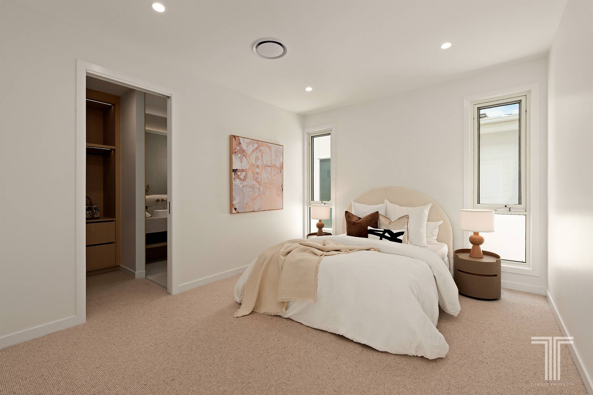 The home's intelligent layout offers versatility for families and guests alike. Three spacious bedrooms upstairs, each feature built-in storage, their own ensuites and refined finishes, with the master suite elevated by its commanding city views and luxurious private ensuite. The upper level maintains a sense of intimacy and calm with 2.7-metre-high spaces that frame the skyline beautifully while the fourth bedroom (or media room) and office/guest bedroom provide further flexibility for modern living with soaring 2.9-metre ceilings.