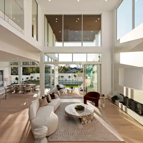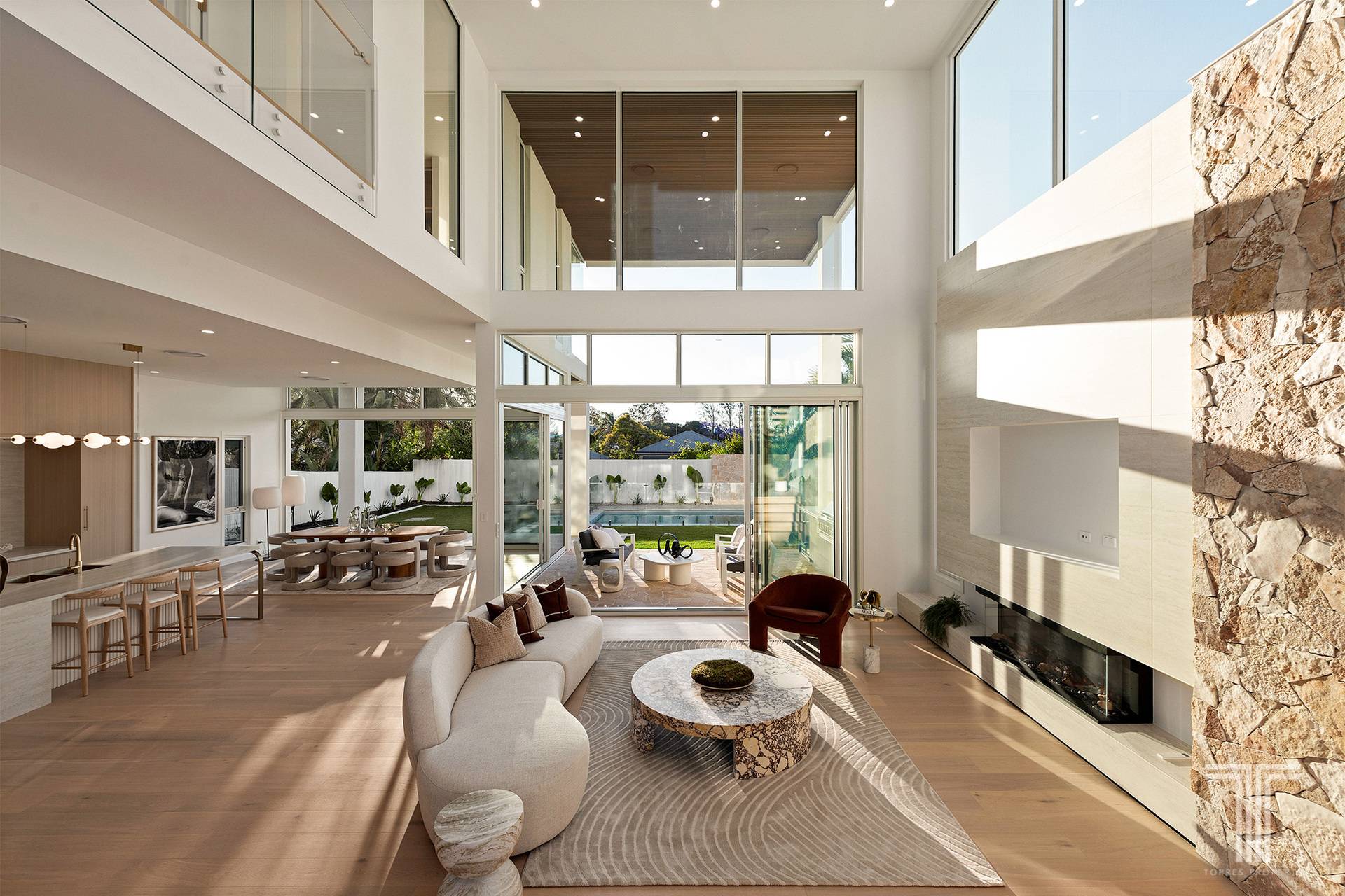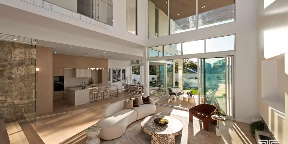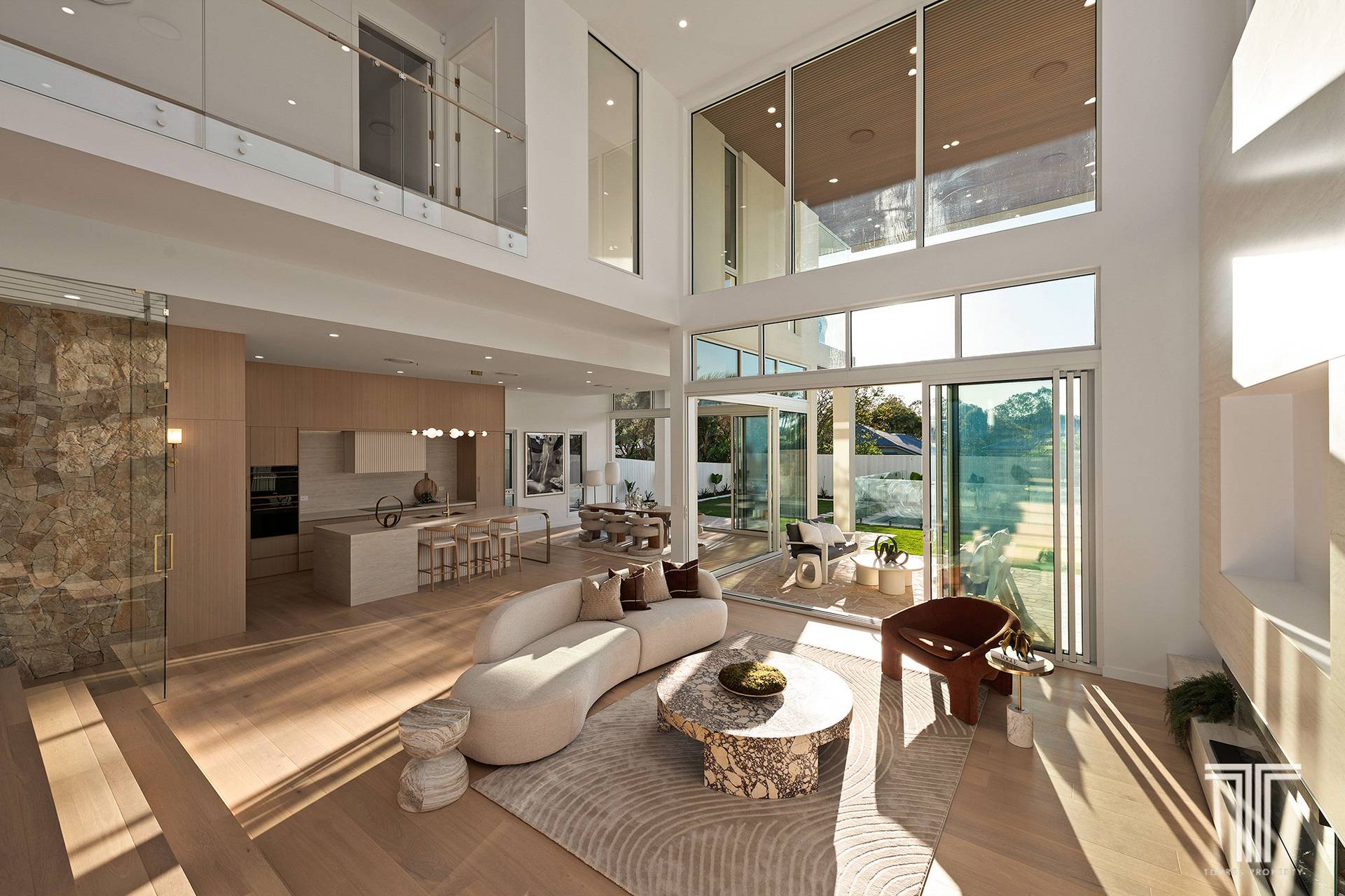 The central living area is the showpiece, crowned by a 7-metre-high ceiling that enhances the natural light and visual volume of the space. Full-height glazing invites uninterrupted views of the city skyline and an ever-present connection to the outdoors, while motorised remote-control curtains, integrated lighting, and a comprehensive smart home monitoring and security system provide effortless convenience.