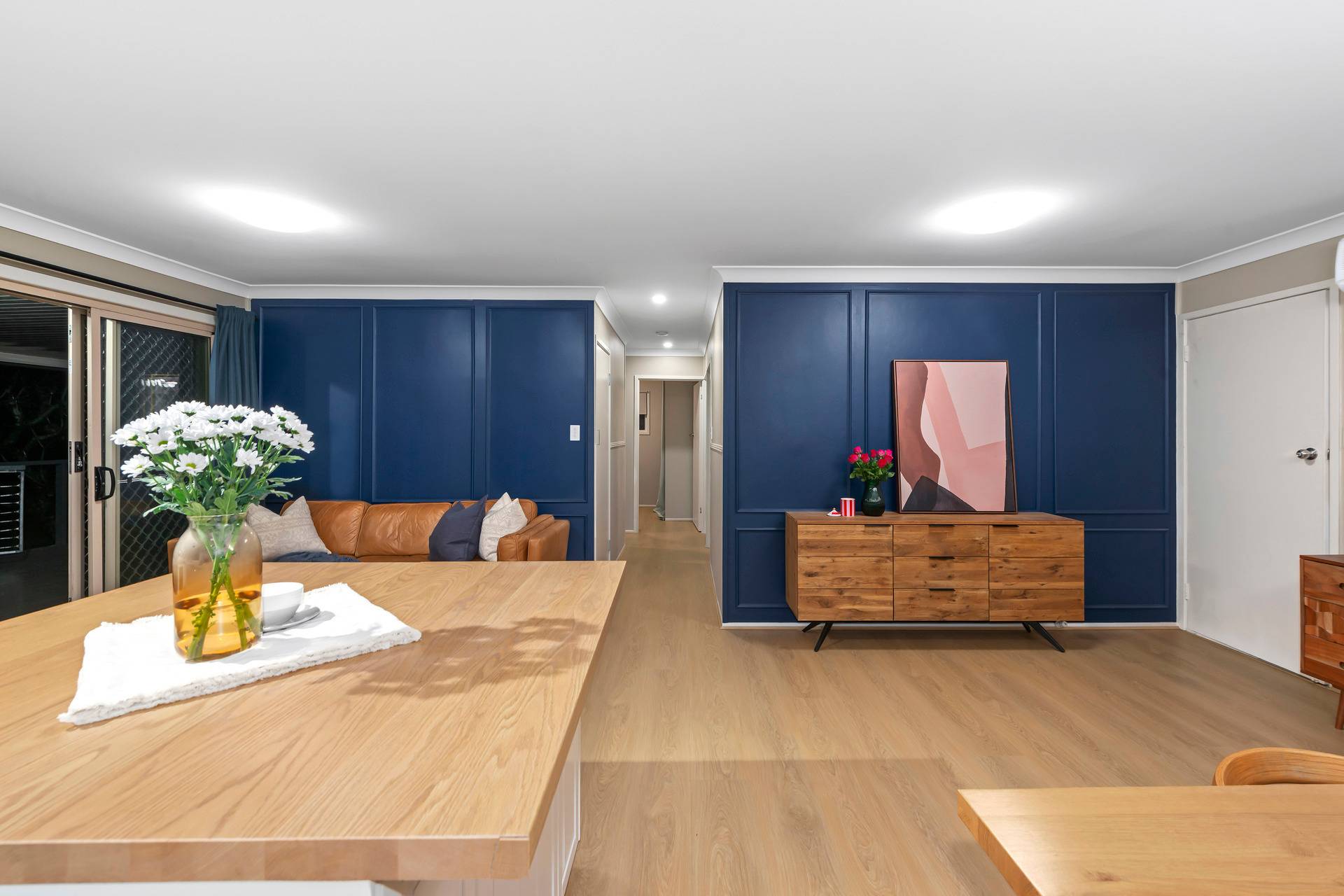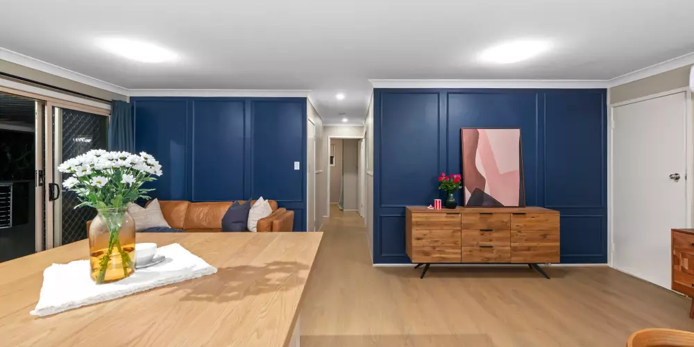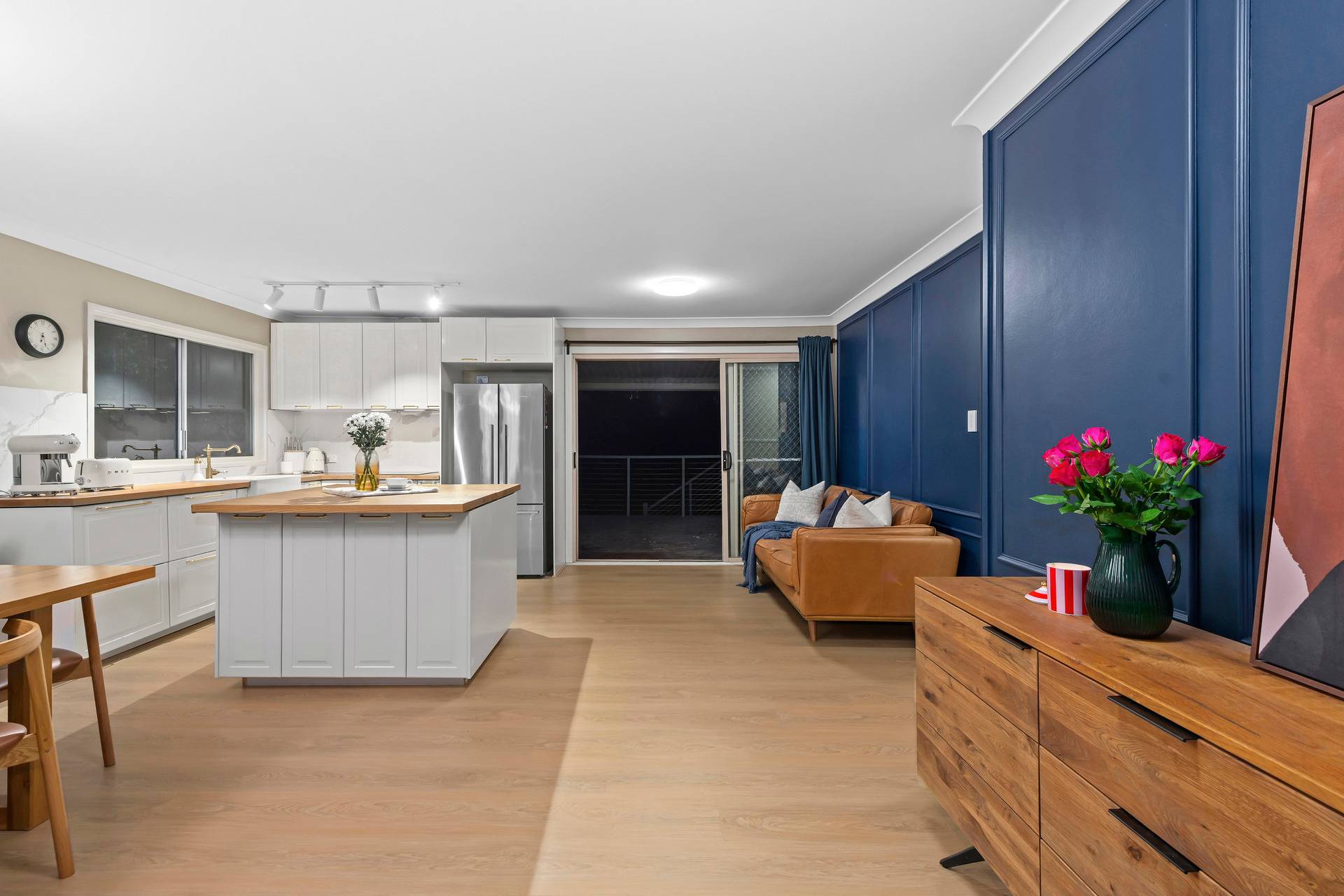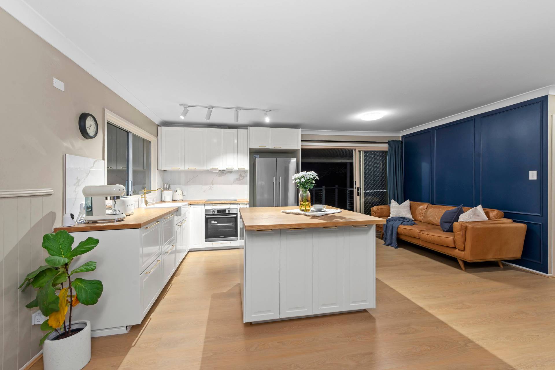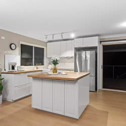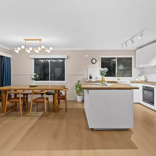 At the heart of the home sits the Italian-inspired kitchen, a true centrepiece for family gatherings. Beautifully renovated with waterproof timber benchtops, a breakfast bar, and quality finishes, it seamlessly connects to the open-plan living and dining areas. The natural hardwood timber floors and freshly painted designer walls add warmth and elegance, creating a welcoming space where family memories are made.