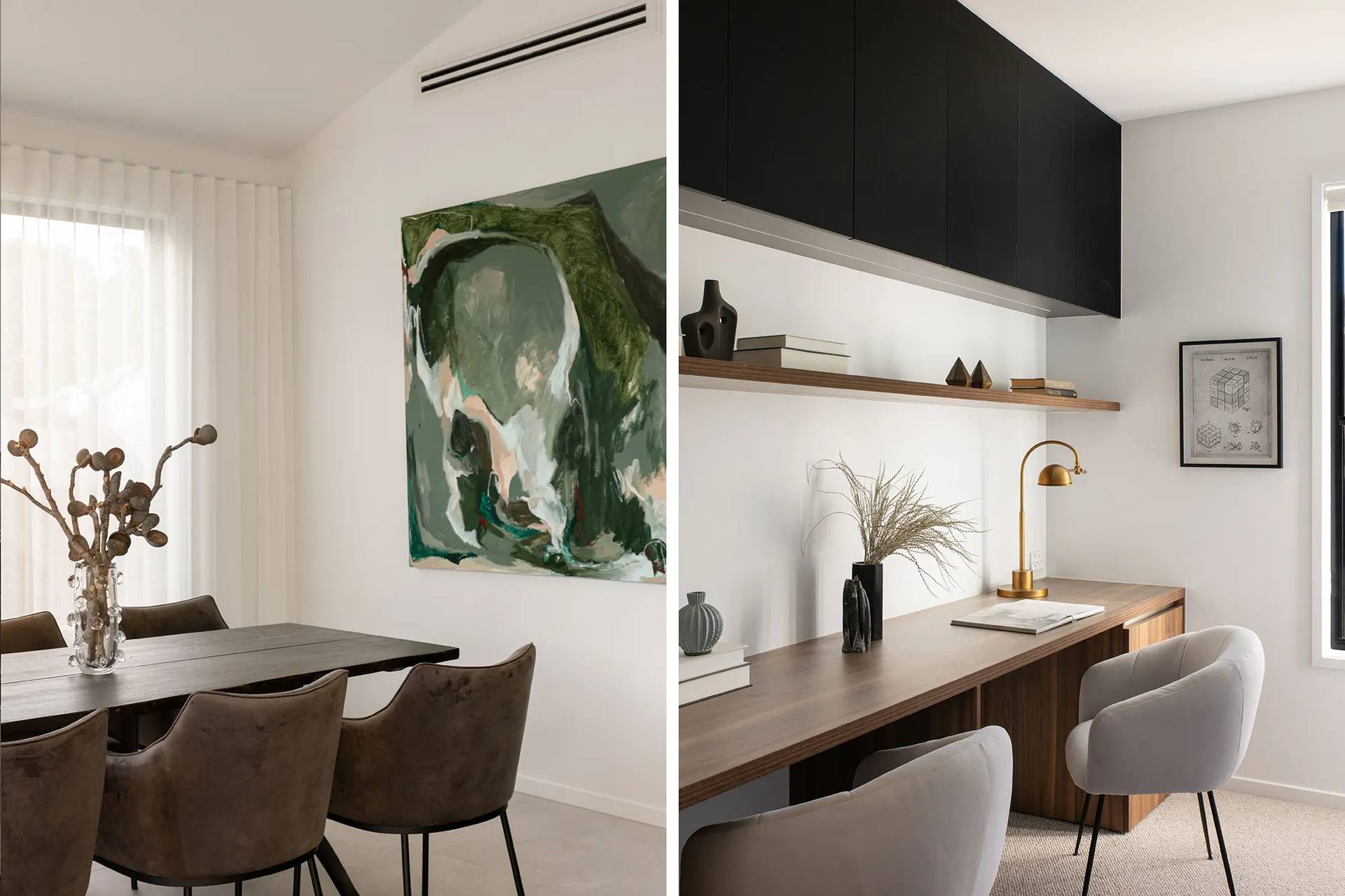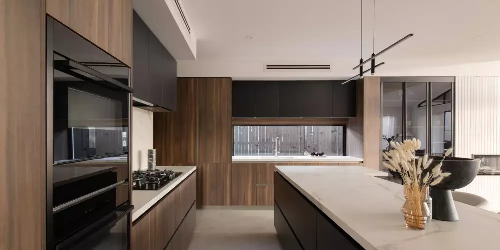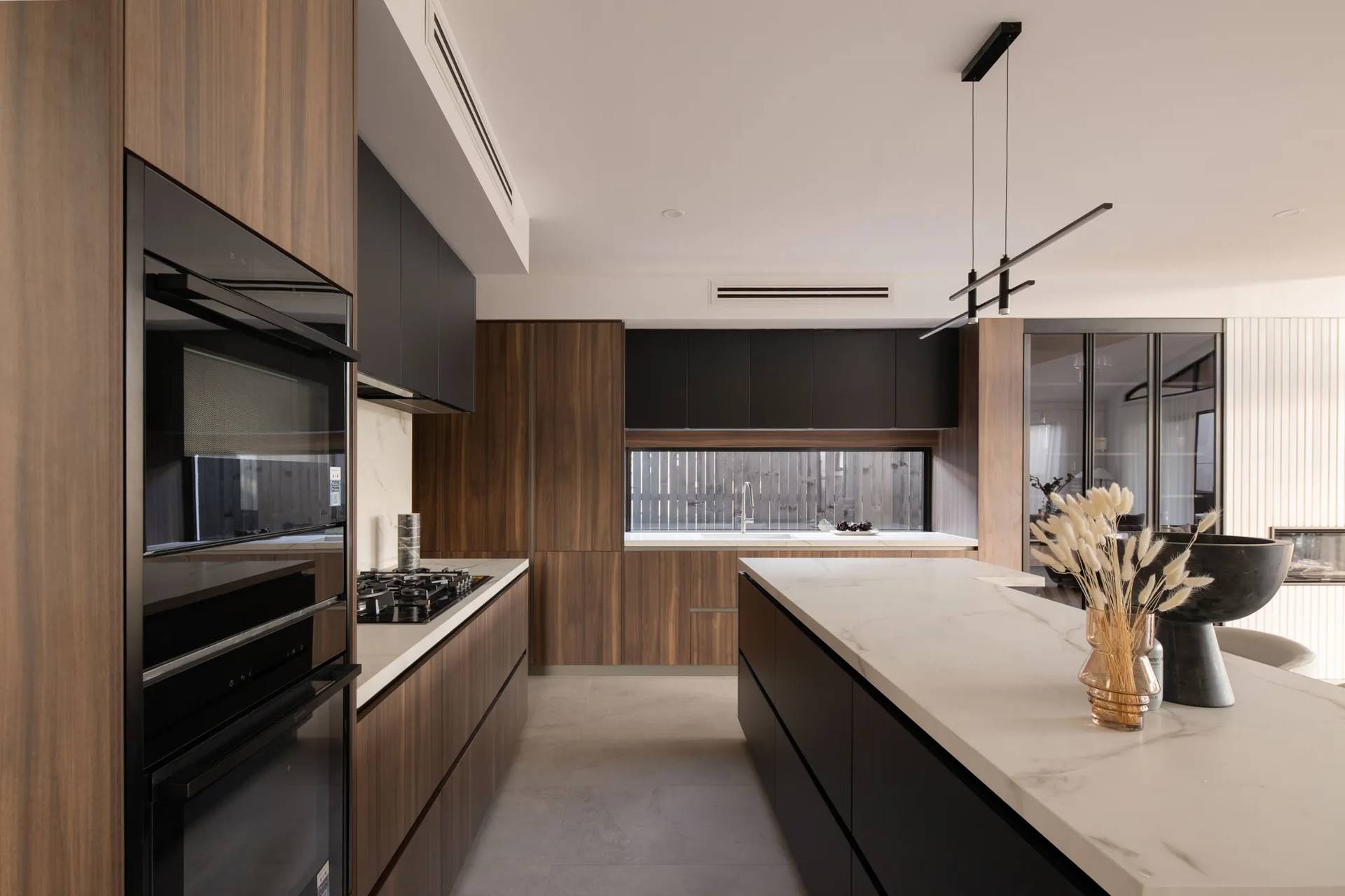 Commanding presence on a 642sqm corner allotment, the dual level residence captivates from the first glance with its bold modern facade, pitched roofline, gated entry, and meticulously landscaped surrounds. Every detail has been curated to the highest standard, combining contemporary architectural form with refined natural textures of walnut timber accents, sleek tiled flooring, Italian joinery and soaring ceilings.