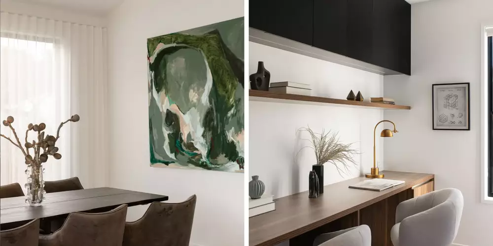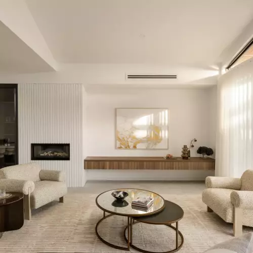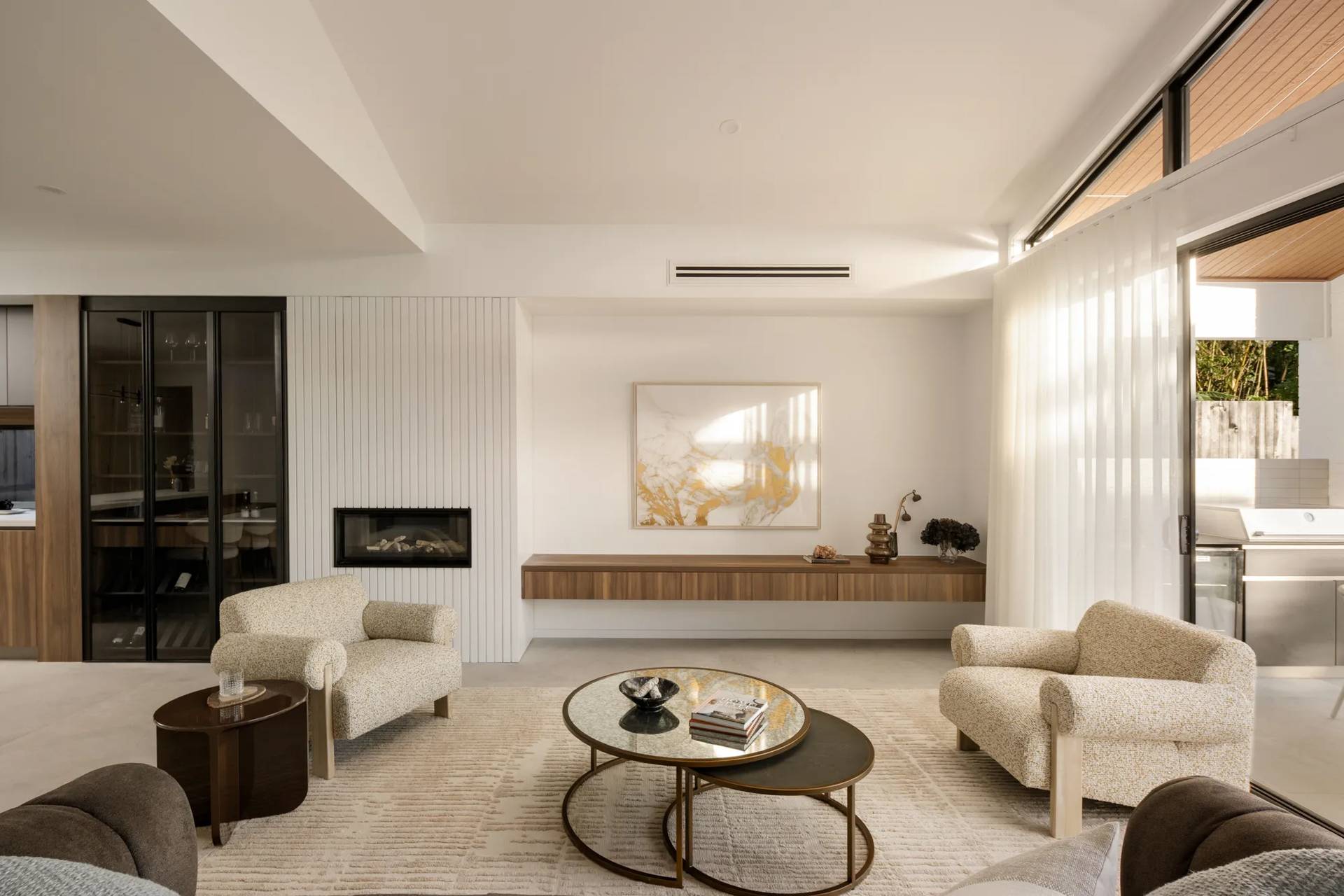 Illuminated in natural light, the expansive open plan living and dining space is the heart of the home. A statement fireplace, generous window spaces that enhance natural illumination, bespoke wine display create a setting of understated grandeur. The Italian made designer custom kitchen pairs form and function to perfection, featuring a generous breakfast island, butler's pantry, Porcelain surfaces, Neff appliances, and an abundance of storage ideal for the culinary connoisseur.
