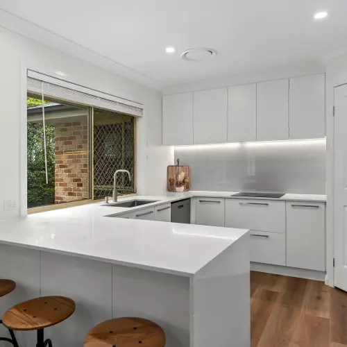 Large windows frame the tree-lined setting and draw natural light throughout the open-plan living and dining area. The kitchen sits at the heart of the home, complete with stonetop finishes, soft-close cabinetry, a spacious pantry and quality appliances.