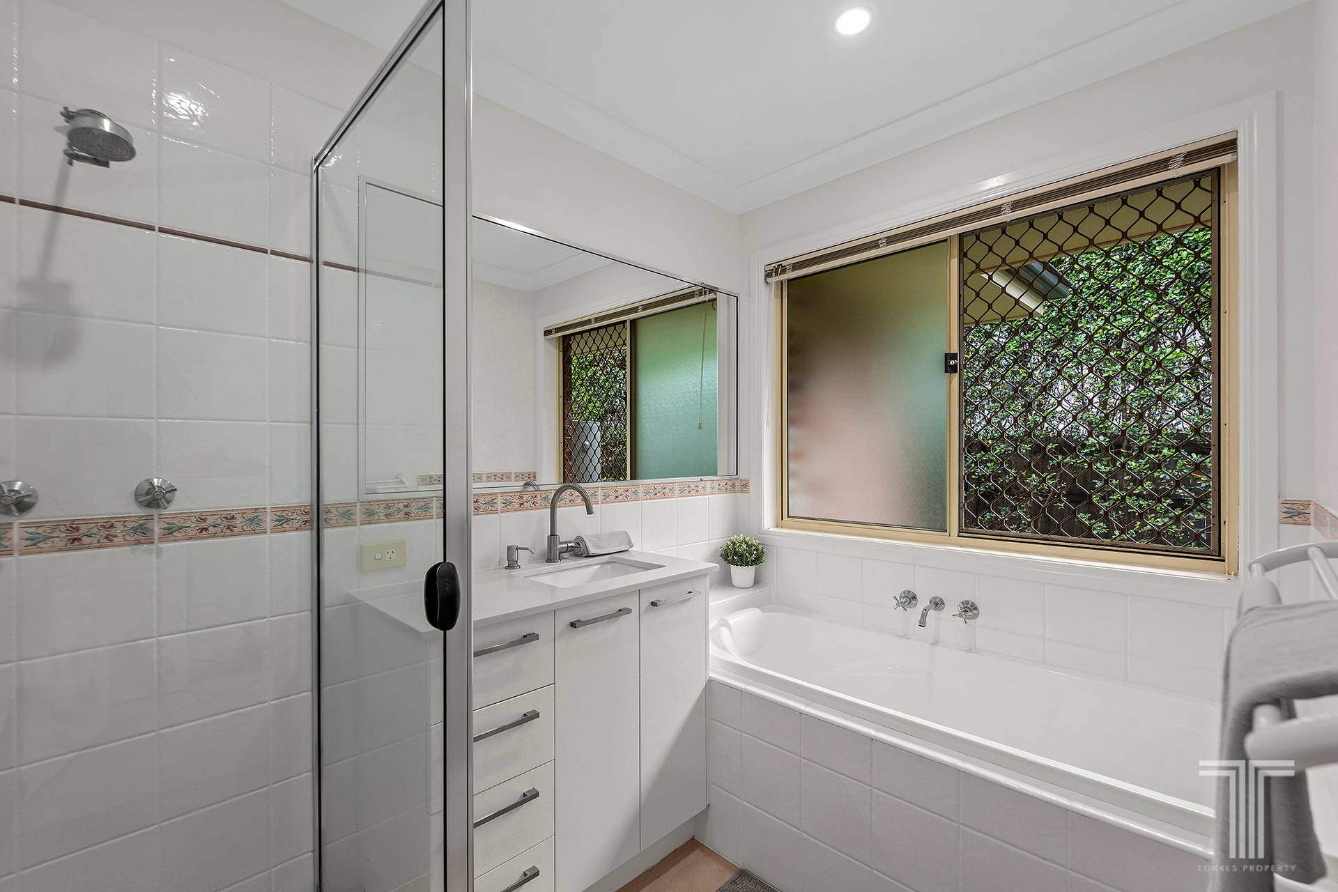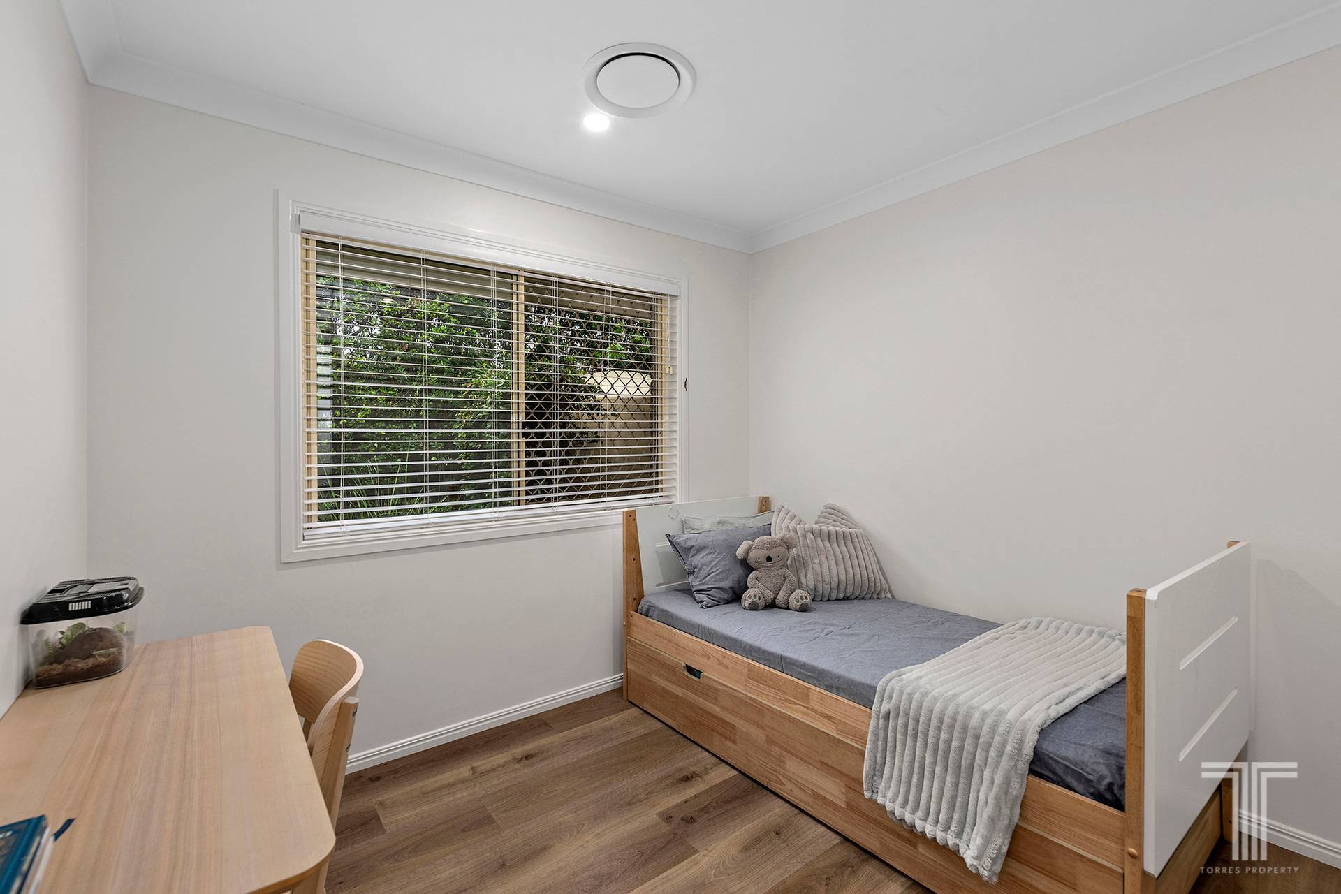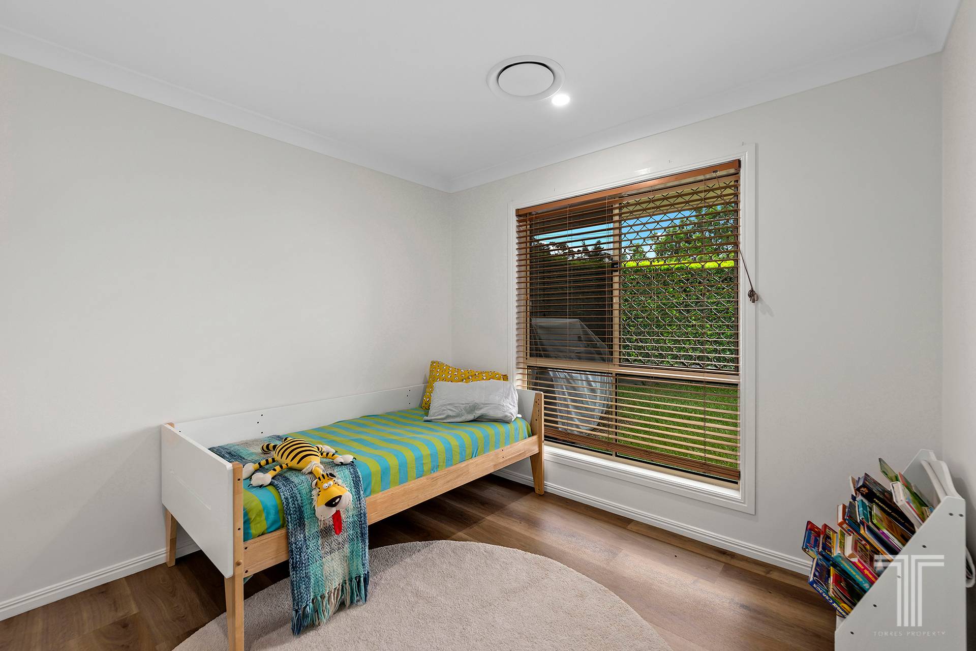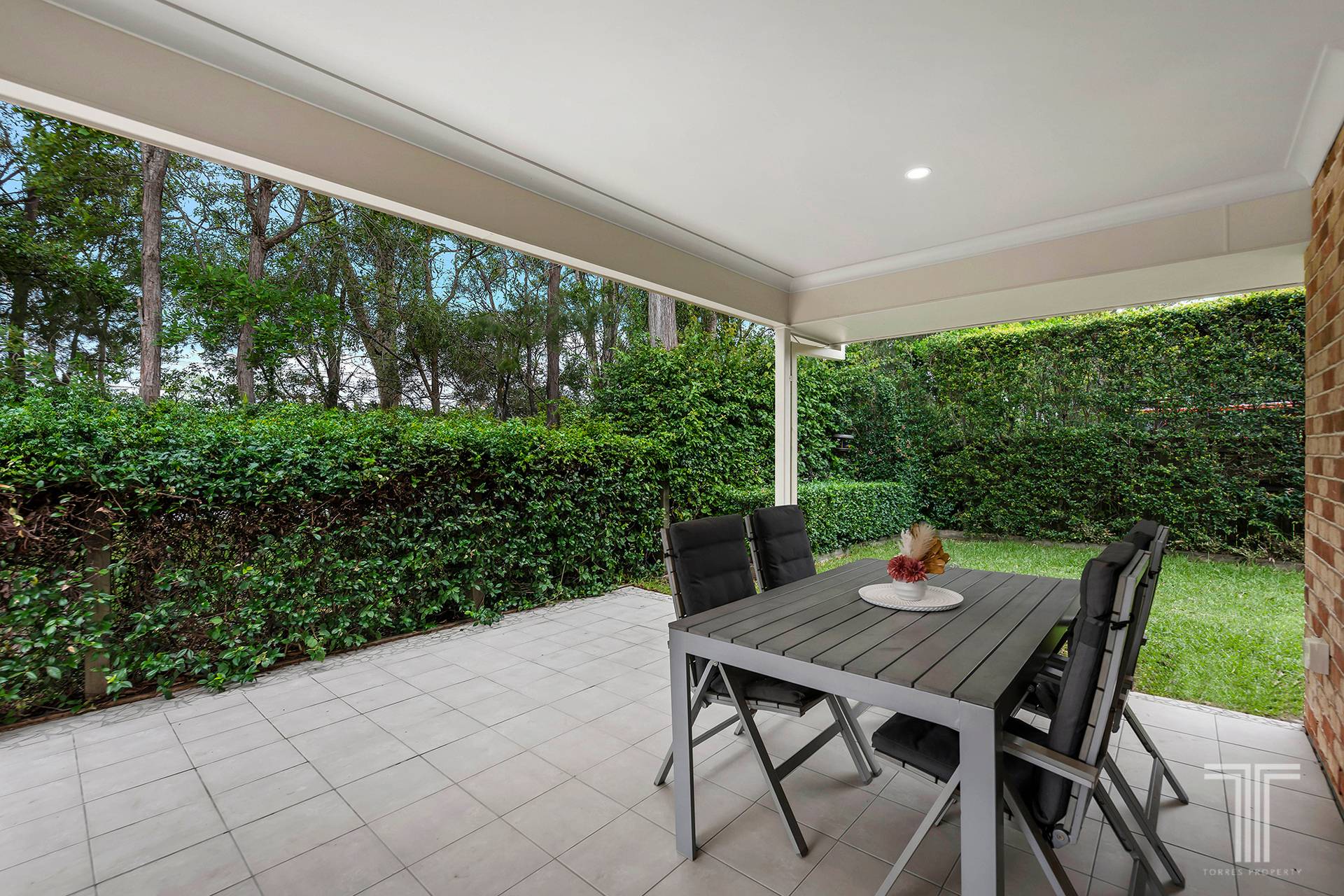 Outdoors, the covered alfresco area forms a tranquil extension of the living space. With established hedging, a secure yard and a lush green backdrop, it is ideal for morning coffees, long lunches or relaxed evenings. A water tank with electric pump supports the gardens with ease.