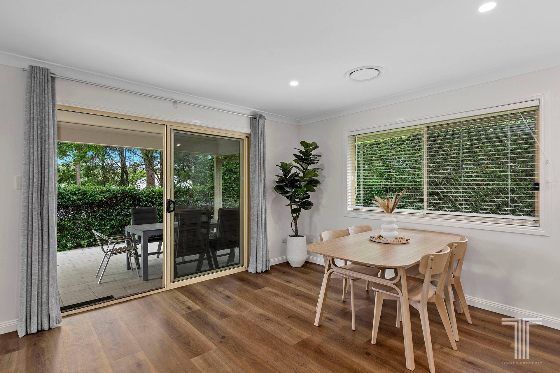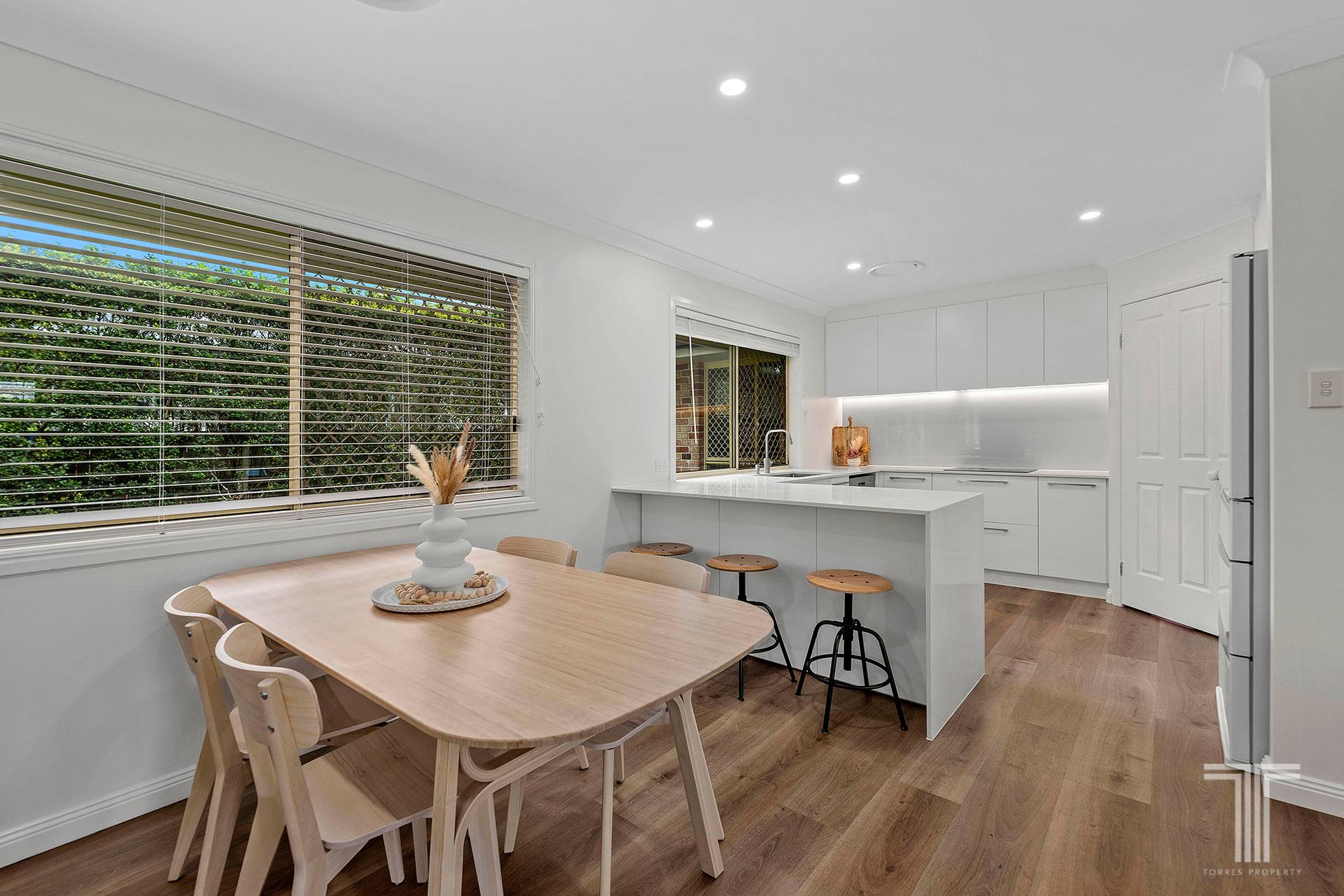 Large windows frame the tree-lined surrounds and invite abundant natural light into the open-plan living and dining areas, enhancing the home's warm and welcoming atmosphere. These spaces flow seamlessly, designed for both relaxed living and effortless entertaining.