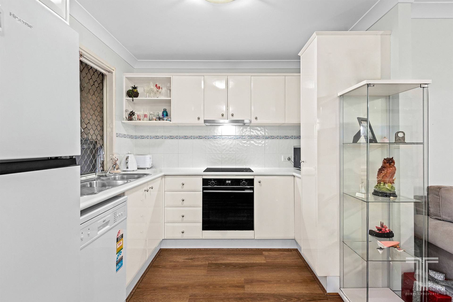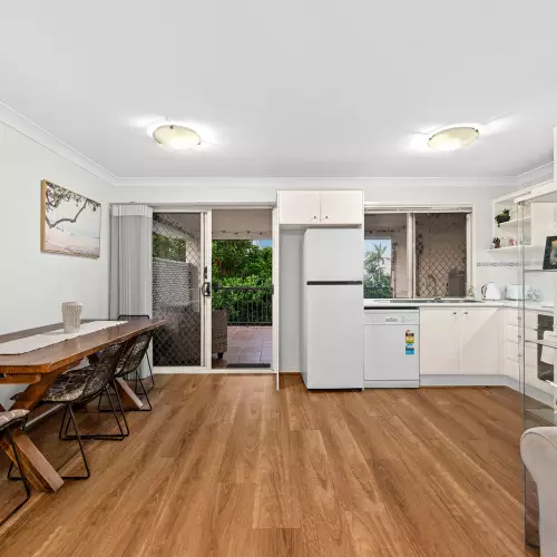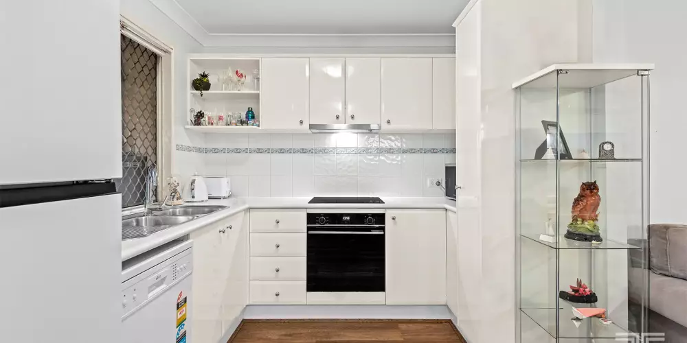 Arriving at the complex, its elevated position hints at the views and breezes that fill the home. Stepping inside, you are immediately welcomed into a spacious open plan living and dining zone, enhanced by new flooring that gives the space a warm, contemporary feel. Natural light filters across the room and extends toward the outdoor spaces, where leafy outlooks and glimpses of the city skyline create a calming backdrop to your everyday routine. Generous balcony areas offer the ideal setting for relaxed entertaining, outdoor dining or unwinding at sunset, complete with an overhead ceiling fan for added comfort. Flowing seamlessly from the dining area, the kitchen enjoys excellent storage and a functional layout.