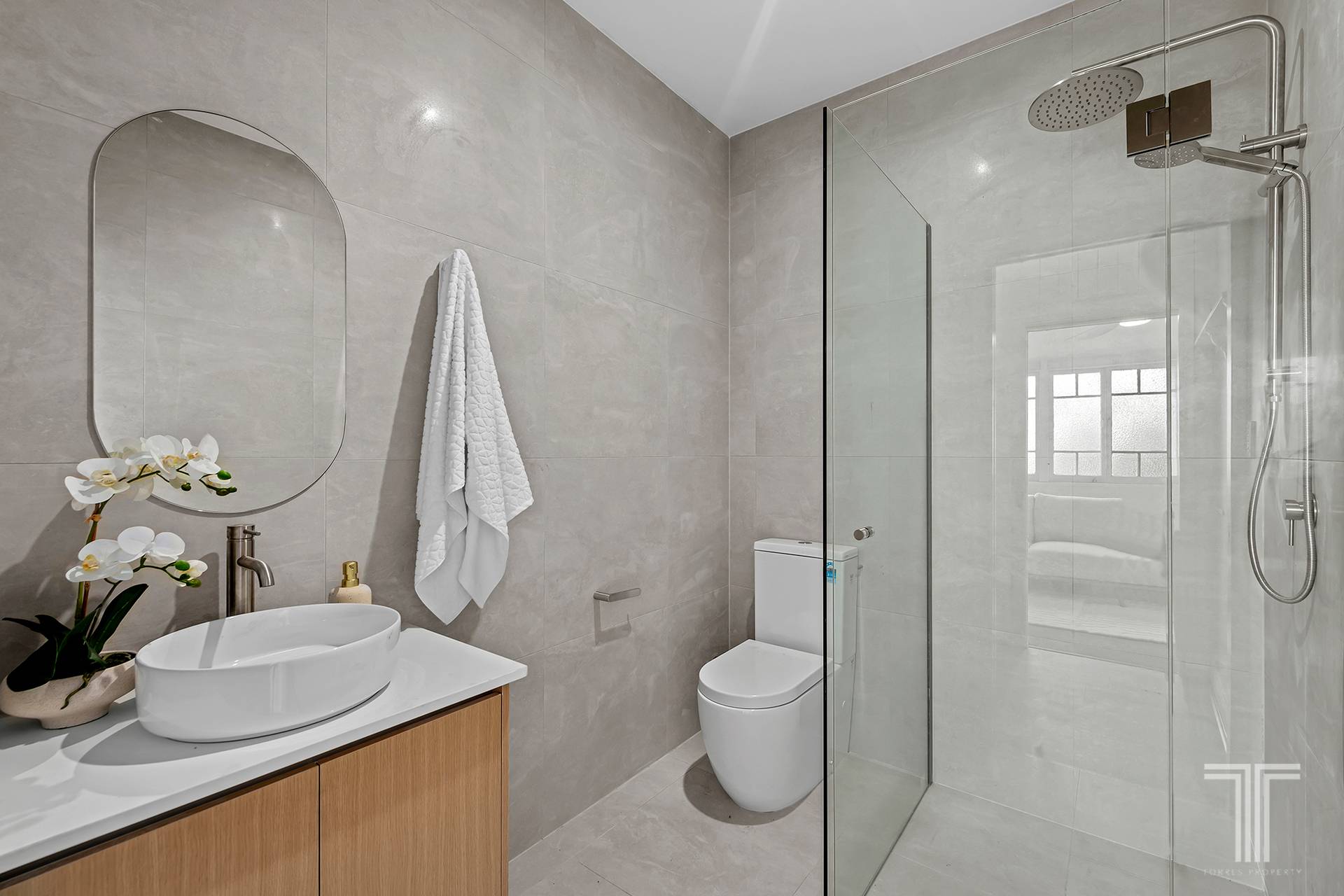 The four bedrooms suitable for double beds and lounge or office nook, are all self-contained, each featuring its own luxurious bathroom. There is easy access to the communal laundry, modern kitchen and a shared deck overlooking the leafy backyard. The large under croft storage area is positioned beneath the property, and there is on-site parking for up to four vehicles.
